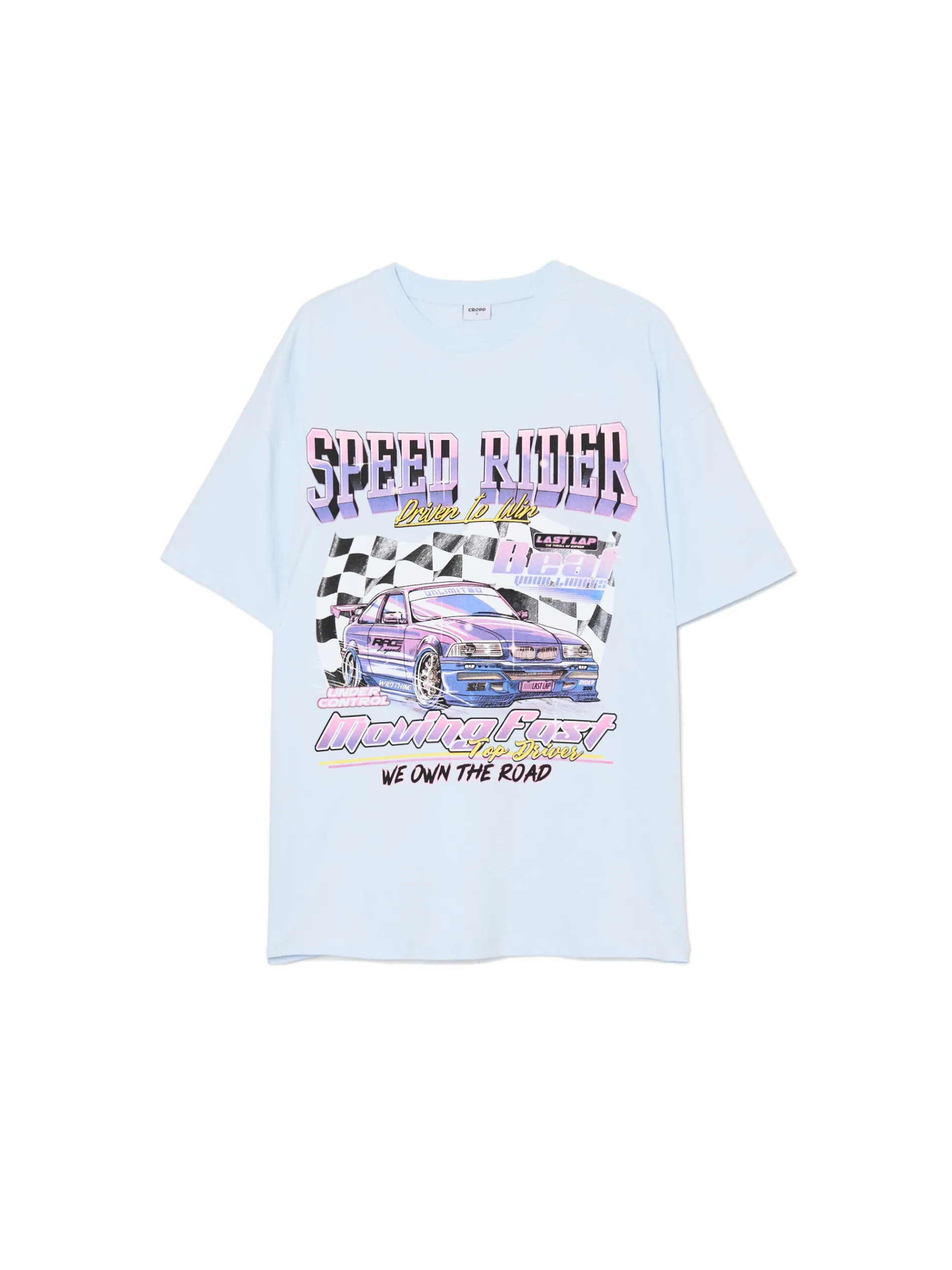 Bawełniana koszulka damska o kroju oversize, z obniżoną linią ramion. Z przodu duży nadruk z motywem motoryzacyjnym. 100% bawełny krój oversize krótkie, swobodne rękawy duży nadruk z przodu