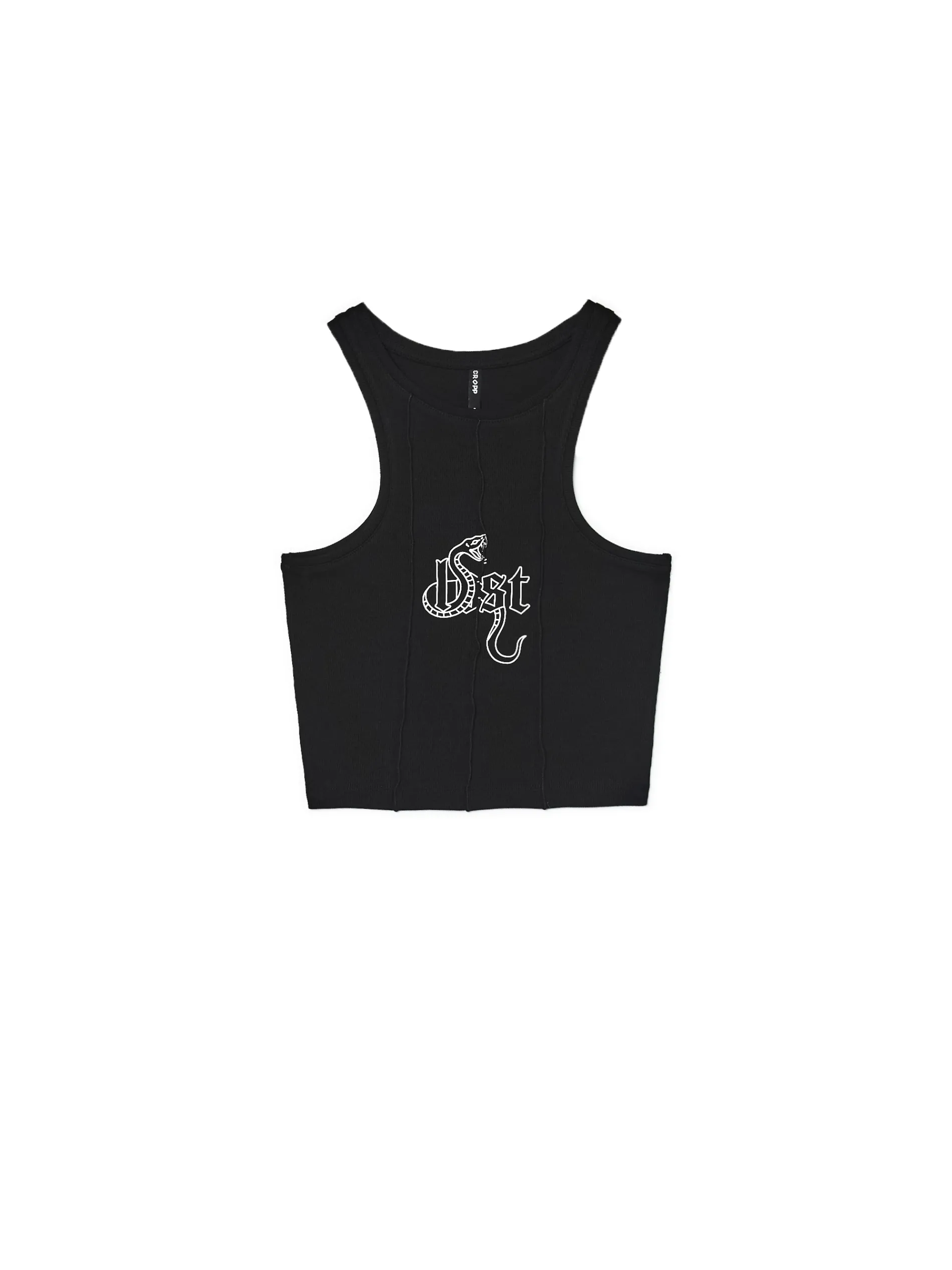 Czarny damski top, uszyty z dzianiny o bardzo wysokiej zawartości bawełny. Domieszka elastanu zapewnia idealne dopasowanie do sylwetki. dzianina z domieszką elastycznych włókien krótki, dopasowany krój szersze ramiączka dekolt typu halter ozdobne przeszycia tekstowy nadruk z przodu Wzrost modelki: 172 cm