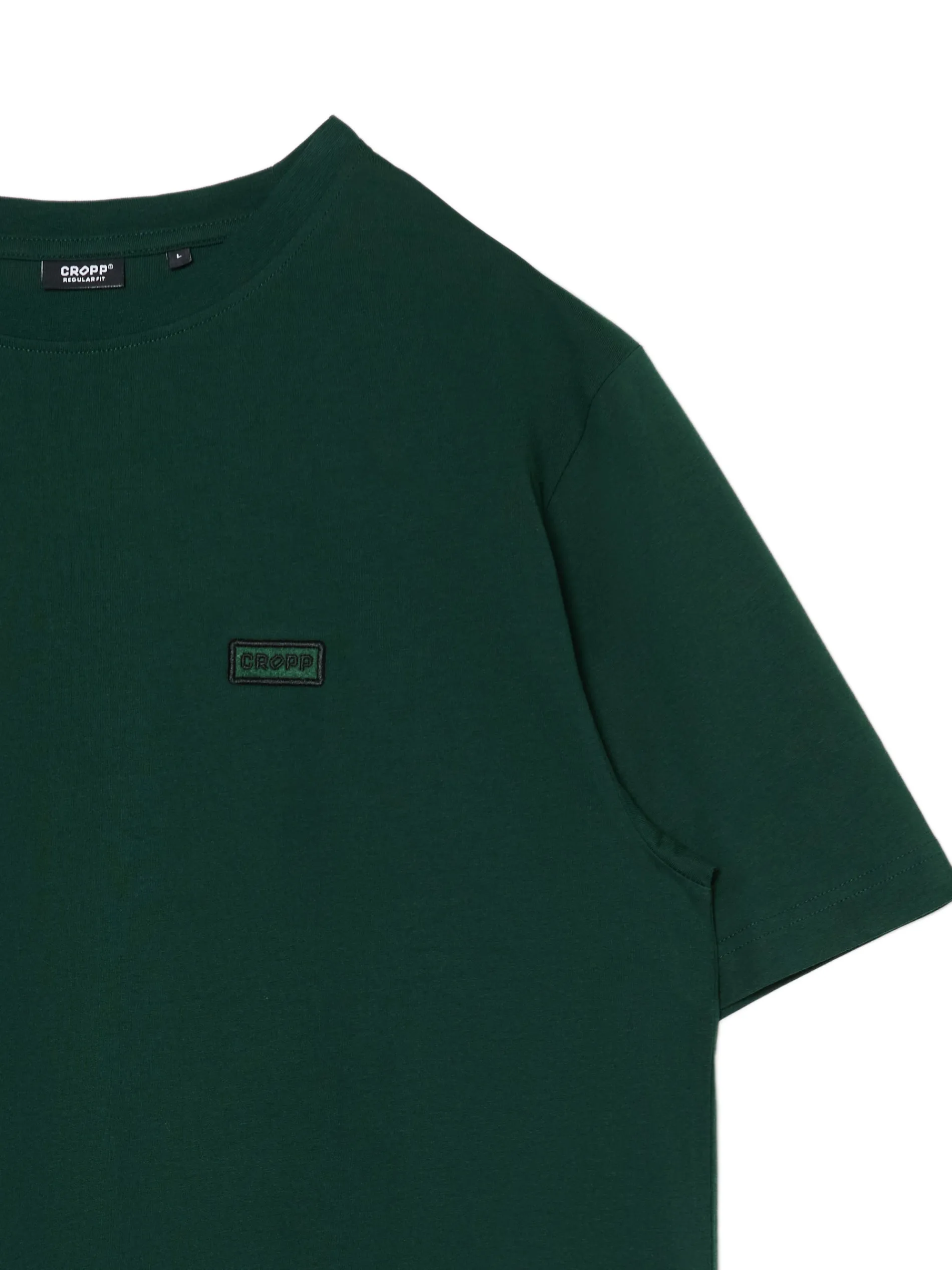 Męska koszulka w kolorze ciemnozielonym, uszyta w 100% z bawełny. regularny krój krótkie rękawy uniwersalny basicowy styl naszywka z napisem Cropp Wzrost modela: 185 cm