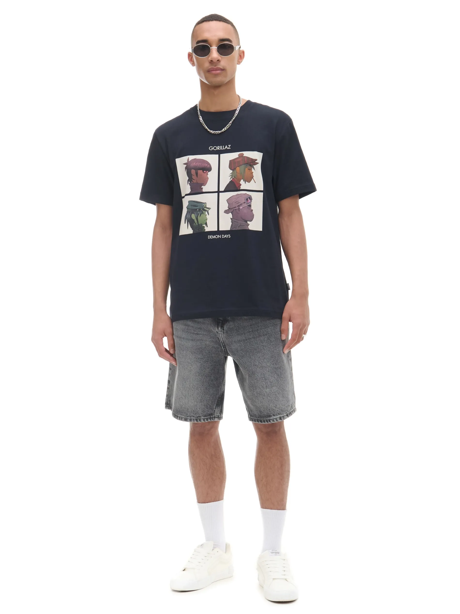 Męska koszulka w czarnym kolorze, uszyta z bawełny. Na przodzie licencjonowany nadruk z zespołem Gorillaz. 100% bawełny regularny krój krótkie, swobodne rękawy nadruk z muzycznym motywem Wzrost modela: 185 cm © 2024 Gorillaz. All Rights Reserved