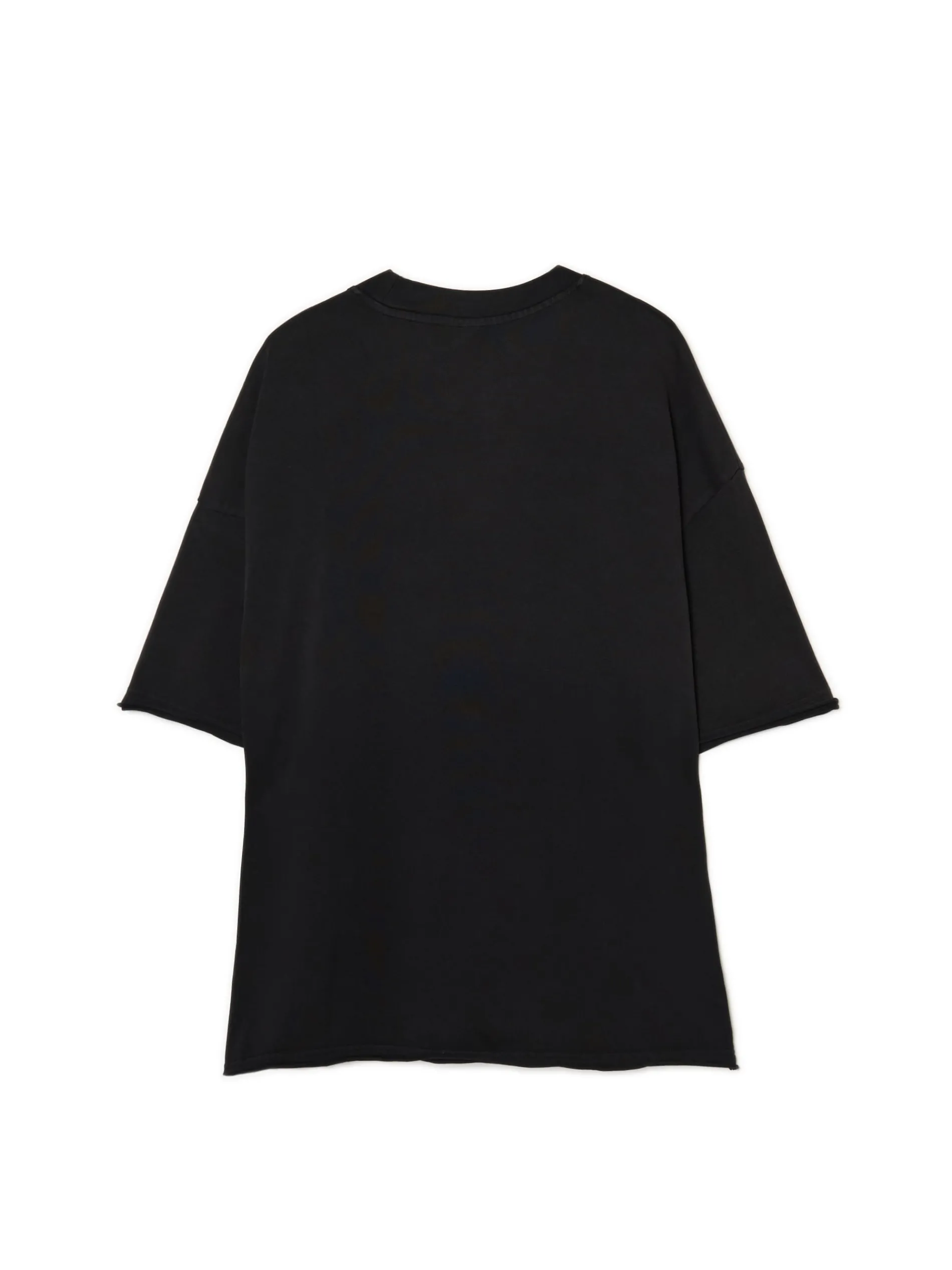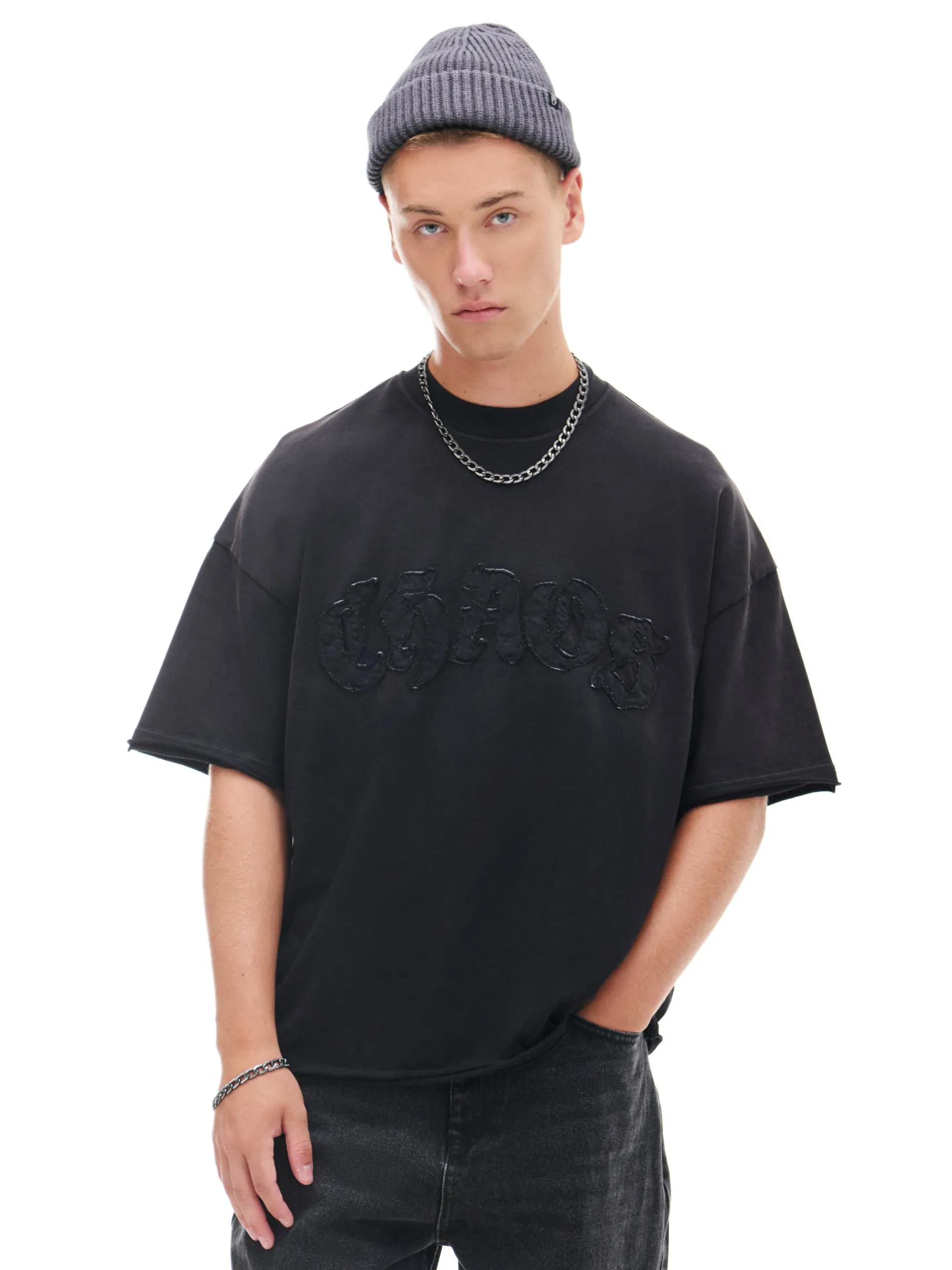 Męski T-shirt o kroju boxy, uszyty z bawełny. Ozdobą tego modelu jest haftowany napis 'chaos’. 100% bawełny obszerny krój boxy rękawy z podwiniętą linią brzegów delikatnie obniżona linia ramion ozdobnie wykończony dół na środku dekoracyjny haft Wzrost modela: 185 cm