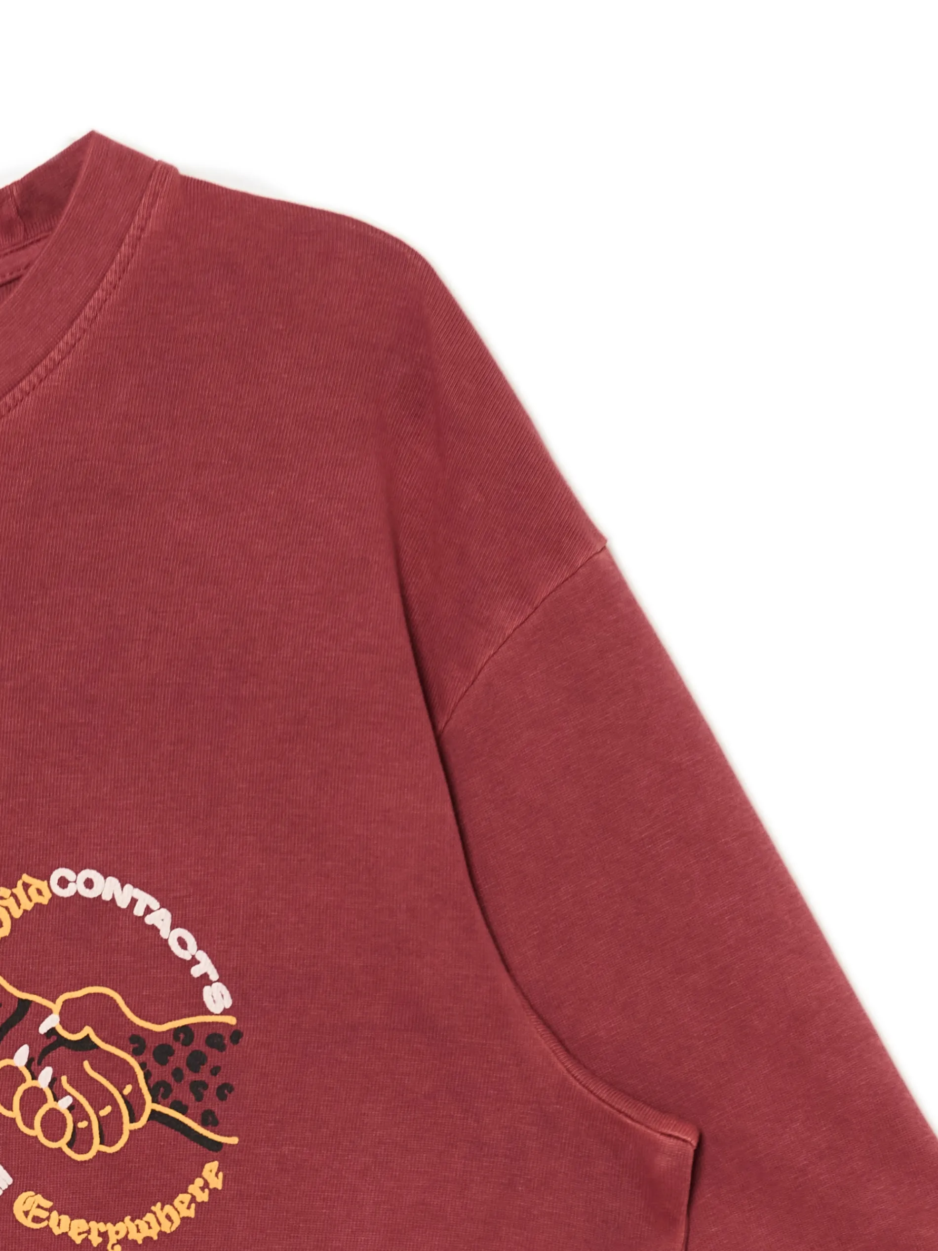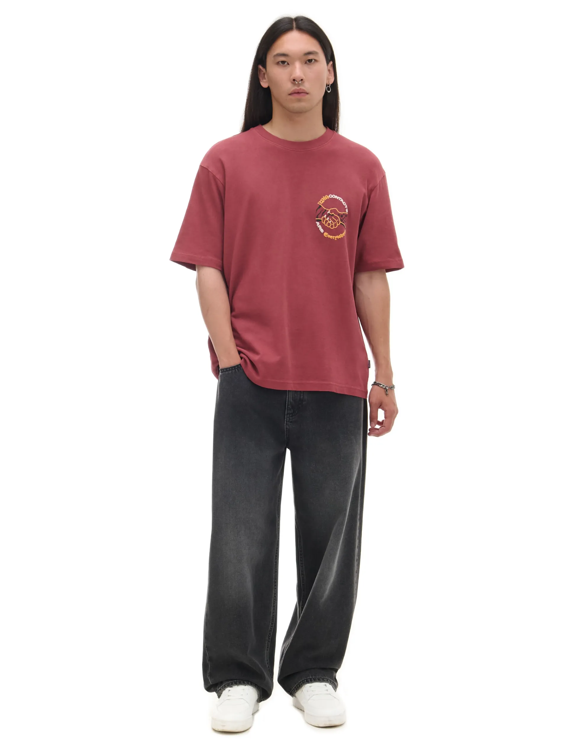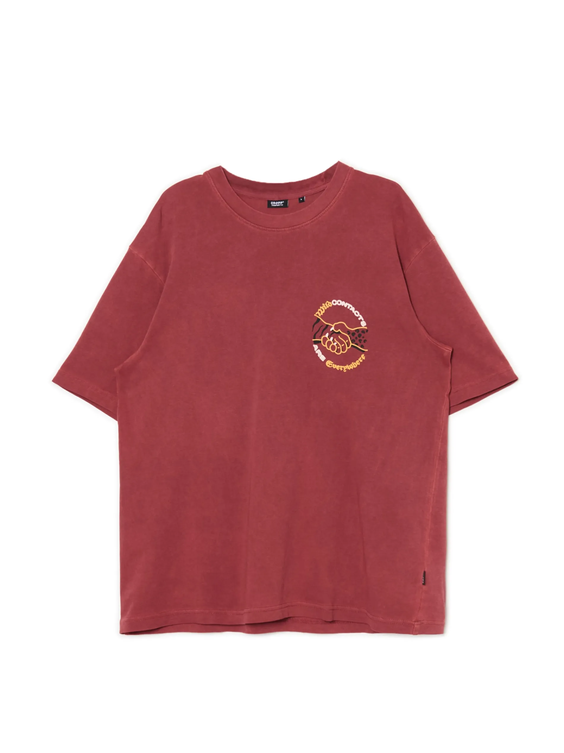Męski T-shirt z krótkim rękawem, uszyty z bawełnianej dzianiny z małym nadrukiem na piersi. Barwiony karminowym pigmentem dla uzyskania intensywnego koloru materiału. 100% bawełny wygodny krój comfort krótkie, swobodne rękawy okrągły dekolt z lamówką efekt sprania na całości