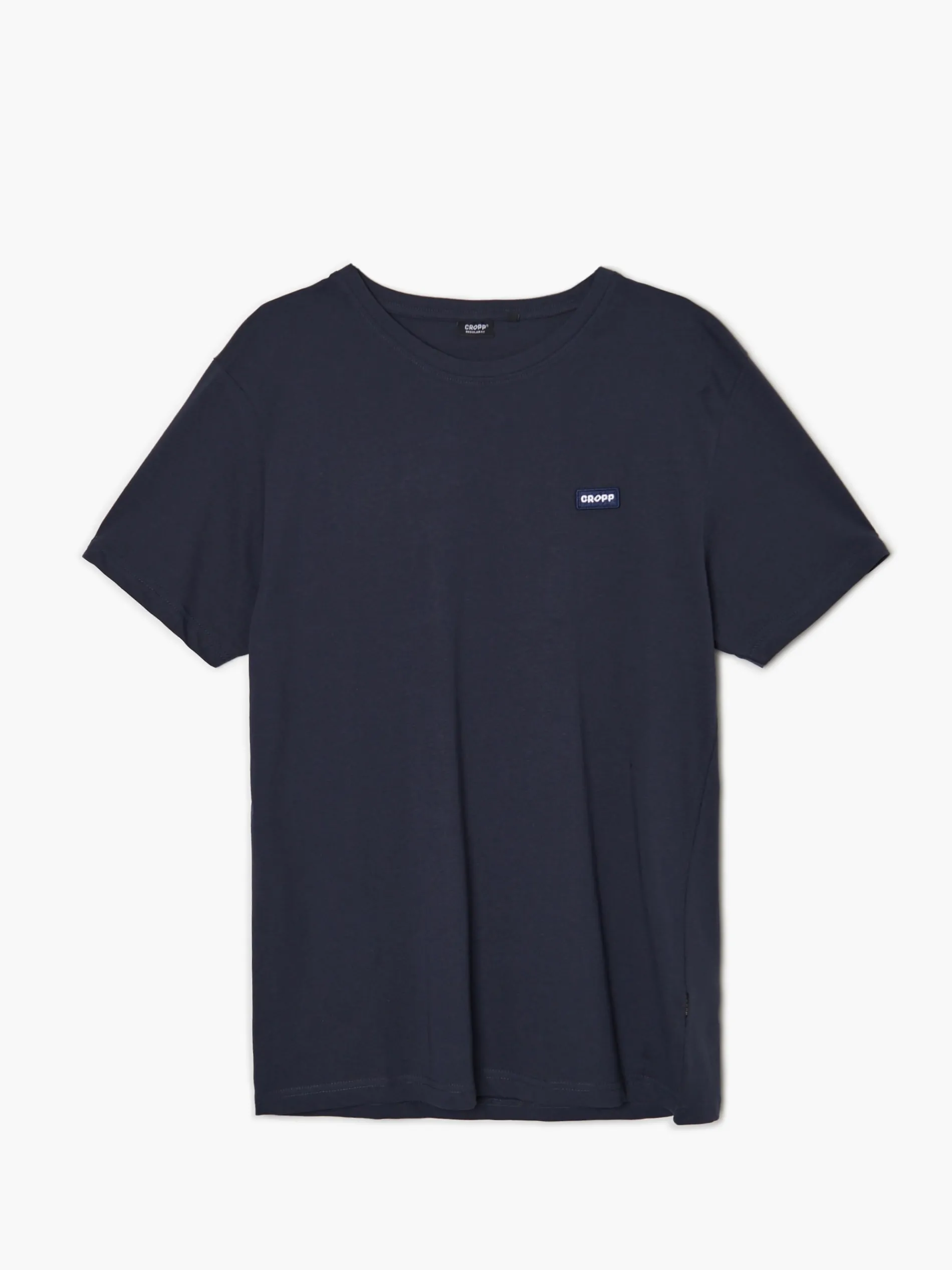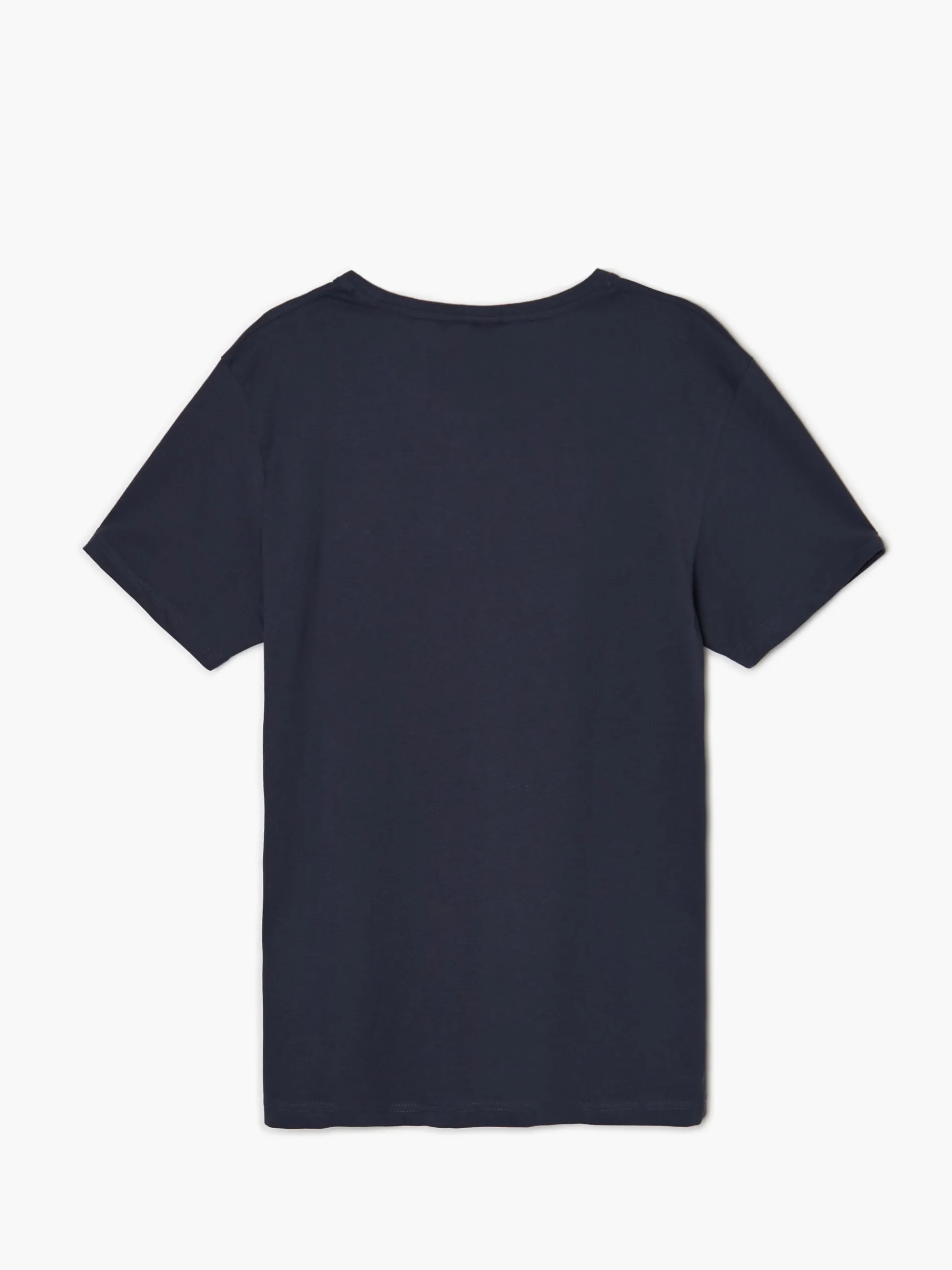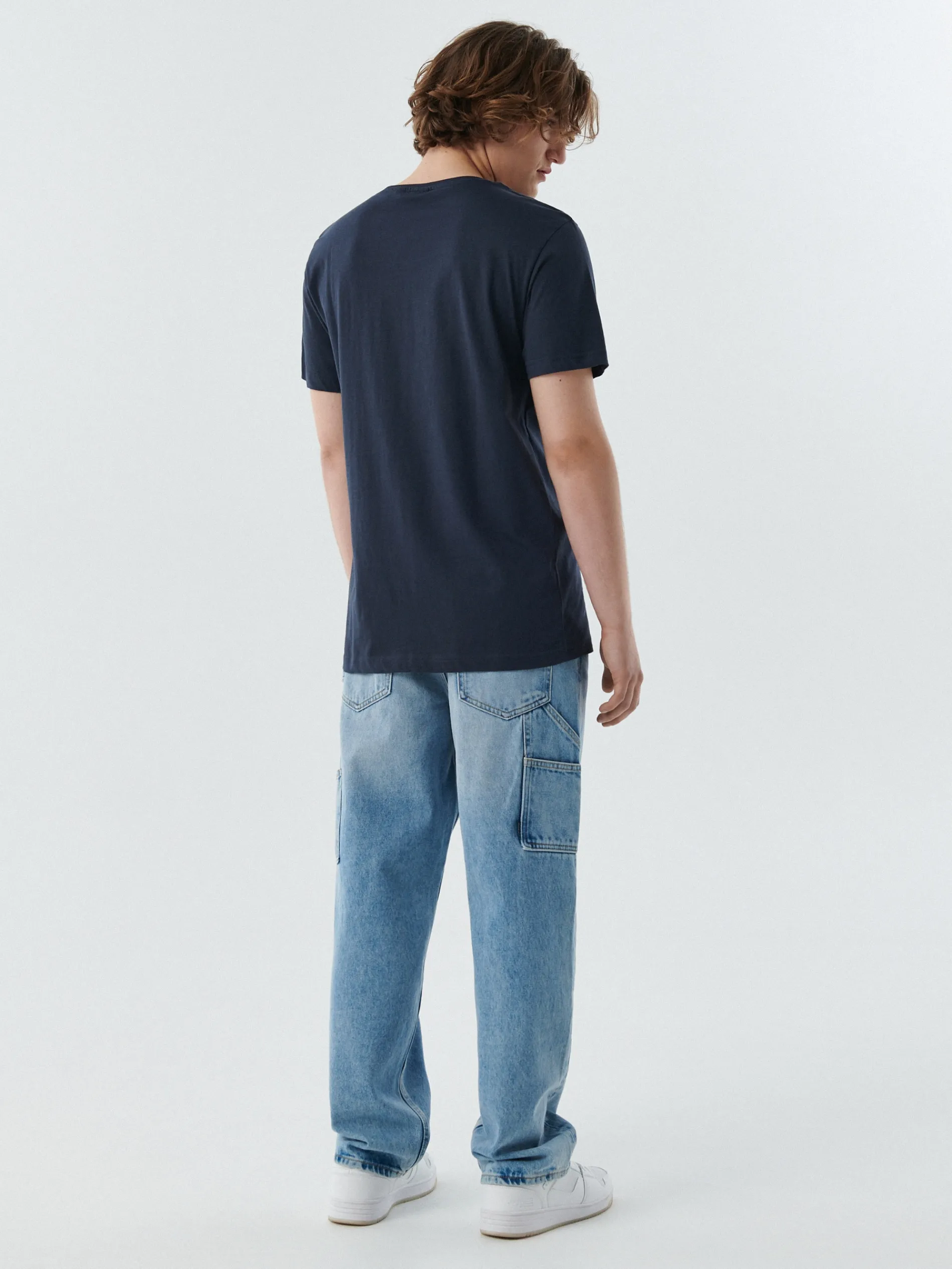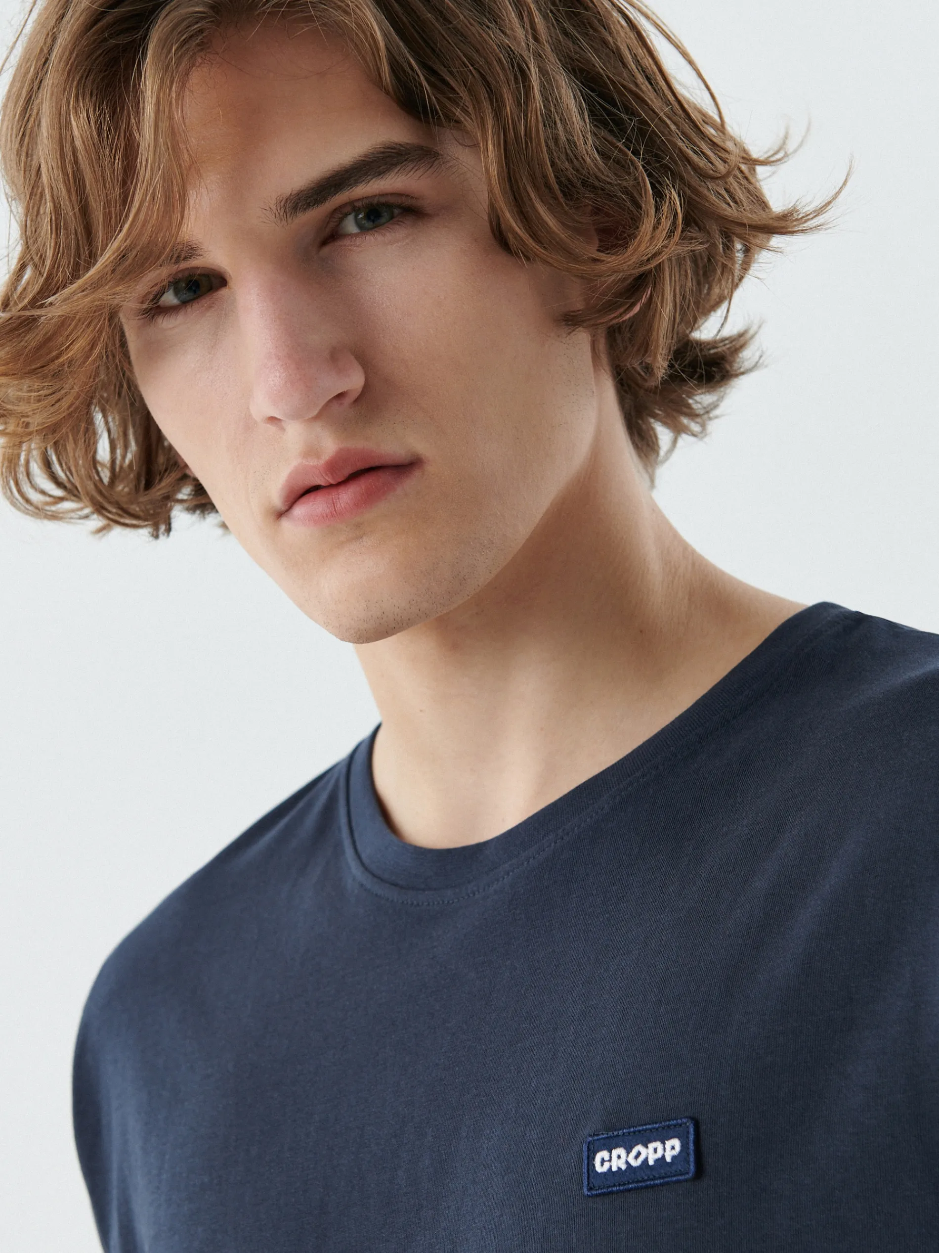 Granatowy męski T-shirt, uszyty w 100% z bawełny. wygodny regularny krój krótkie rękawy niewielka naszywka z przodu dostępny w innych kolorach Wzrost modela: 184 cm