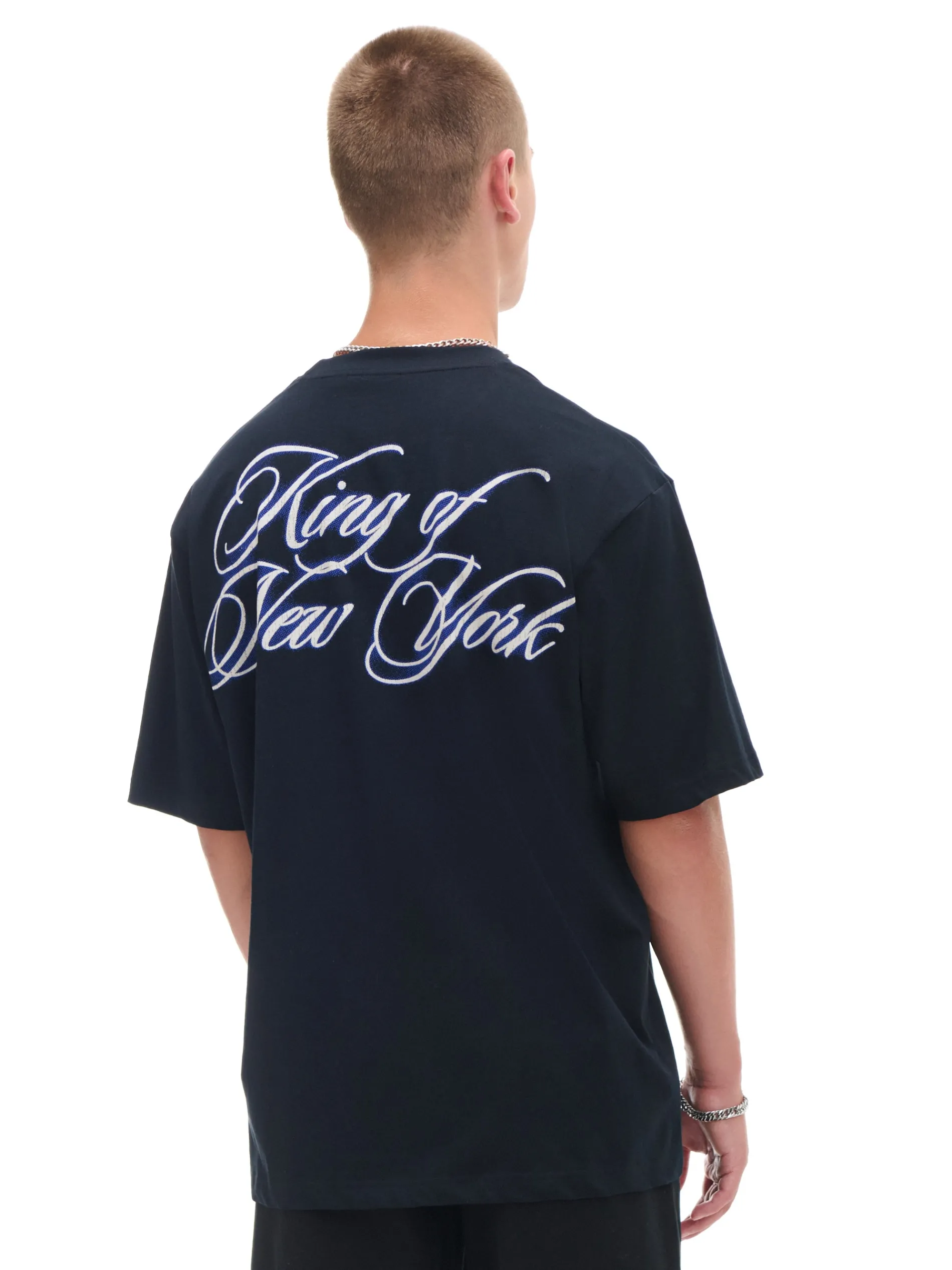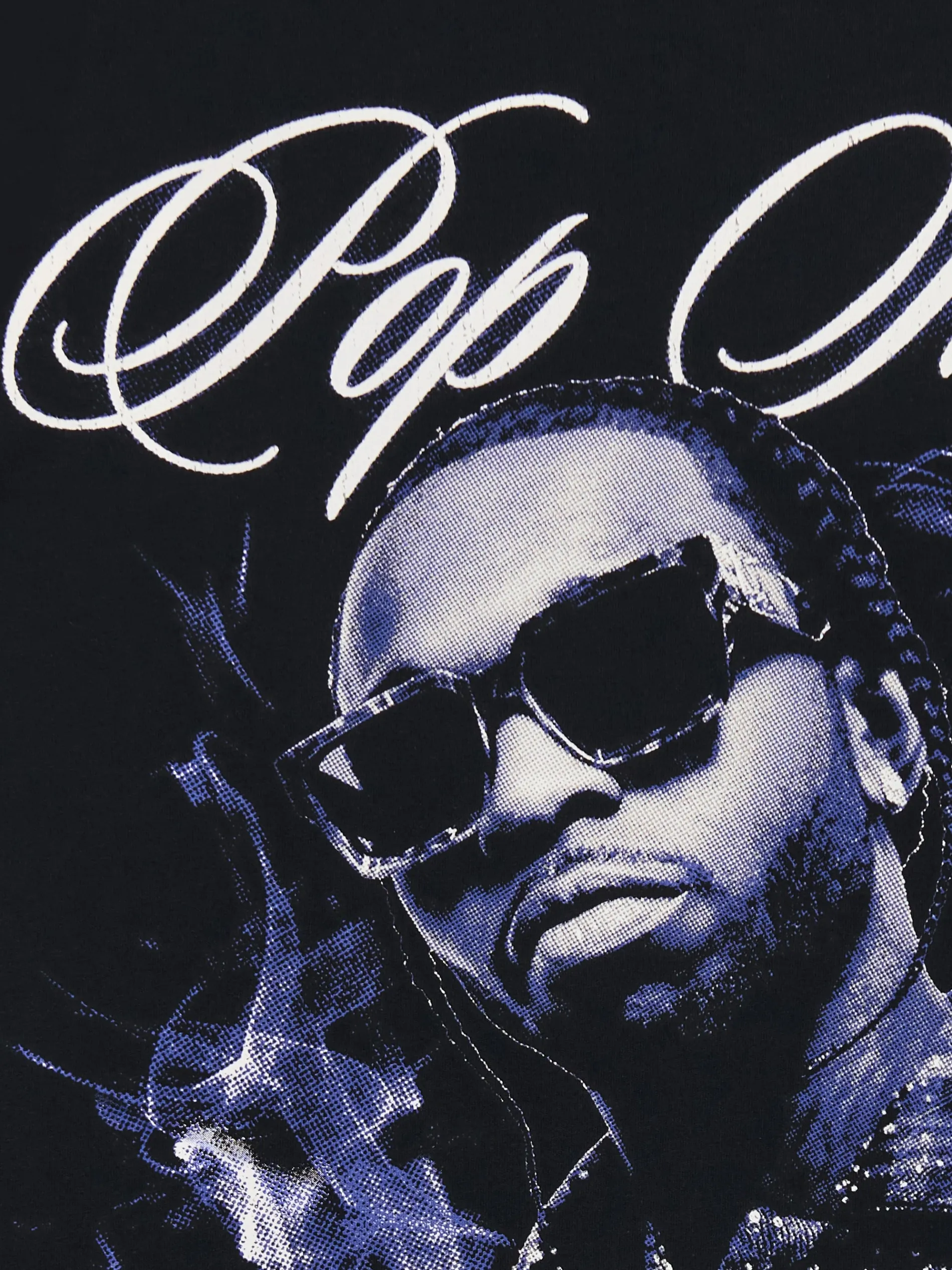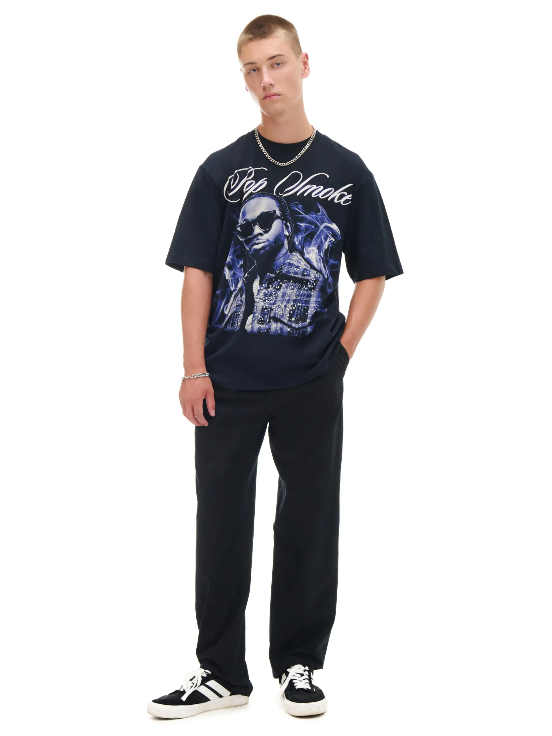 Męska bawełniana koszulka w kolorze czarnym z krótkim rękawem. Na przodzie duży nadruk z wizerunkiem Pop Smoke’a, a na plecach ozdobny slogan. Who is the King? 100% bawełny wygodny krój comfort krótkie, swobodne rękawy duży napis na plecach z przodu nadruk z raperem Pop Smoke Wzrost modela: 185 cm TM© Pop Smoke LLC. Under License to Bravado International Group. All Rights Reserved.