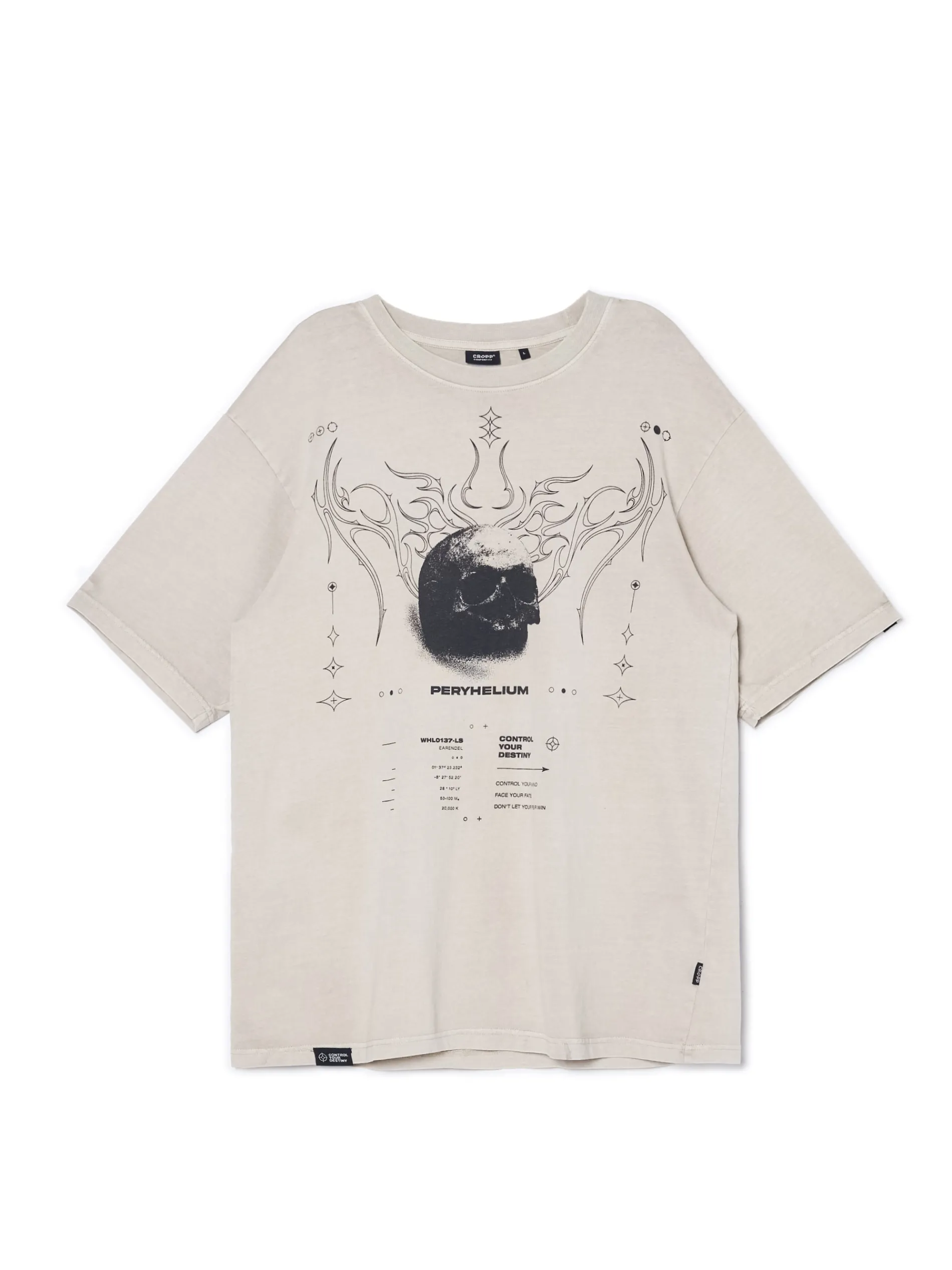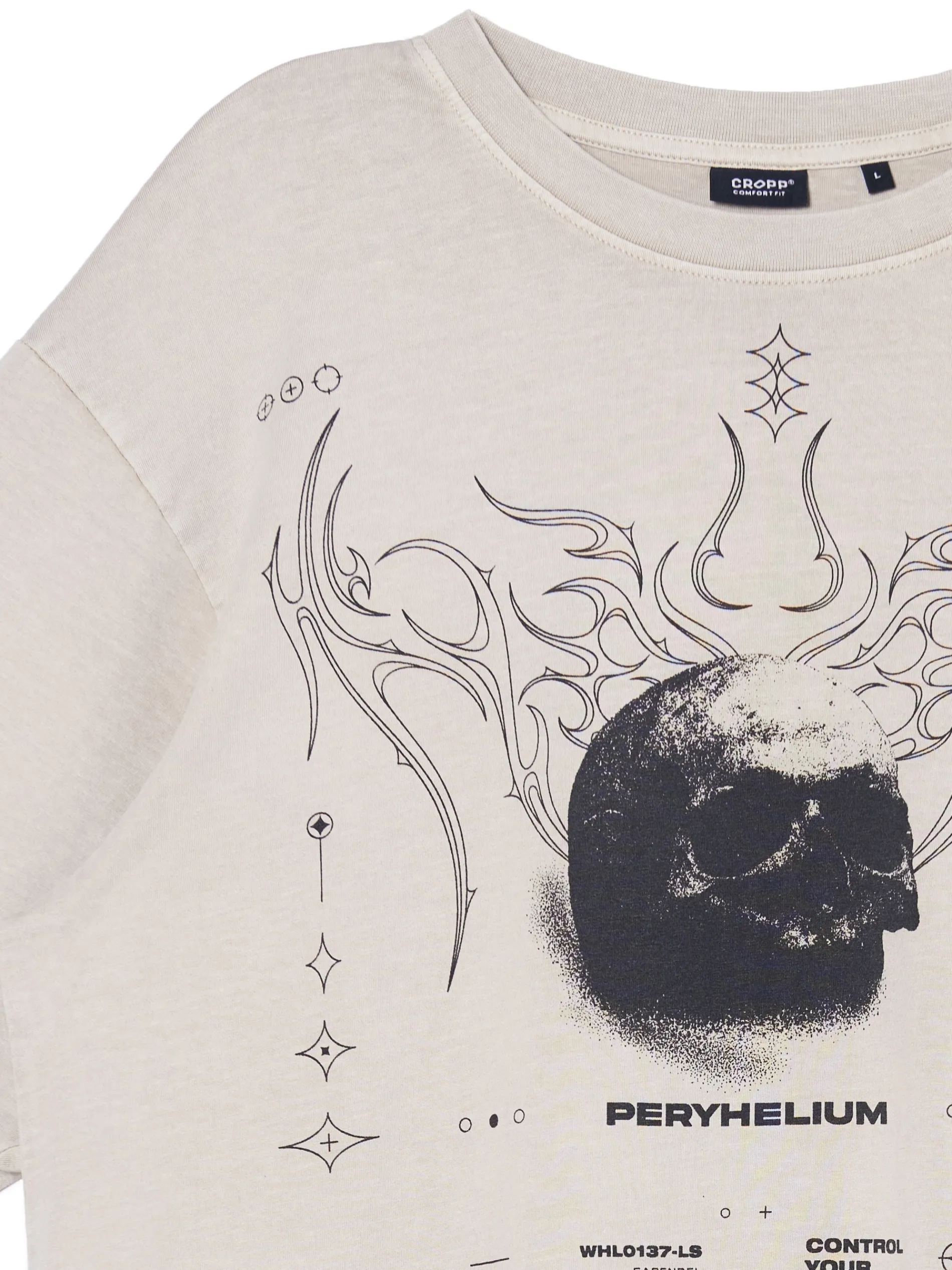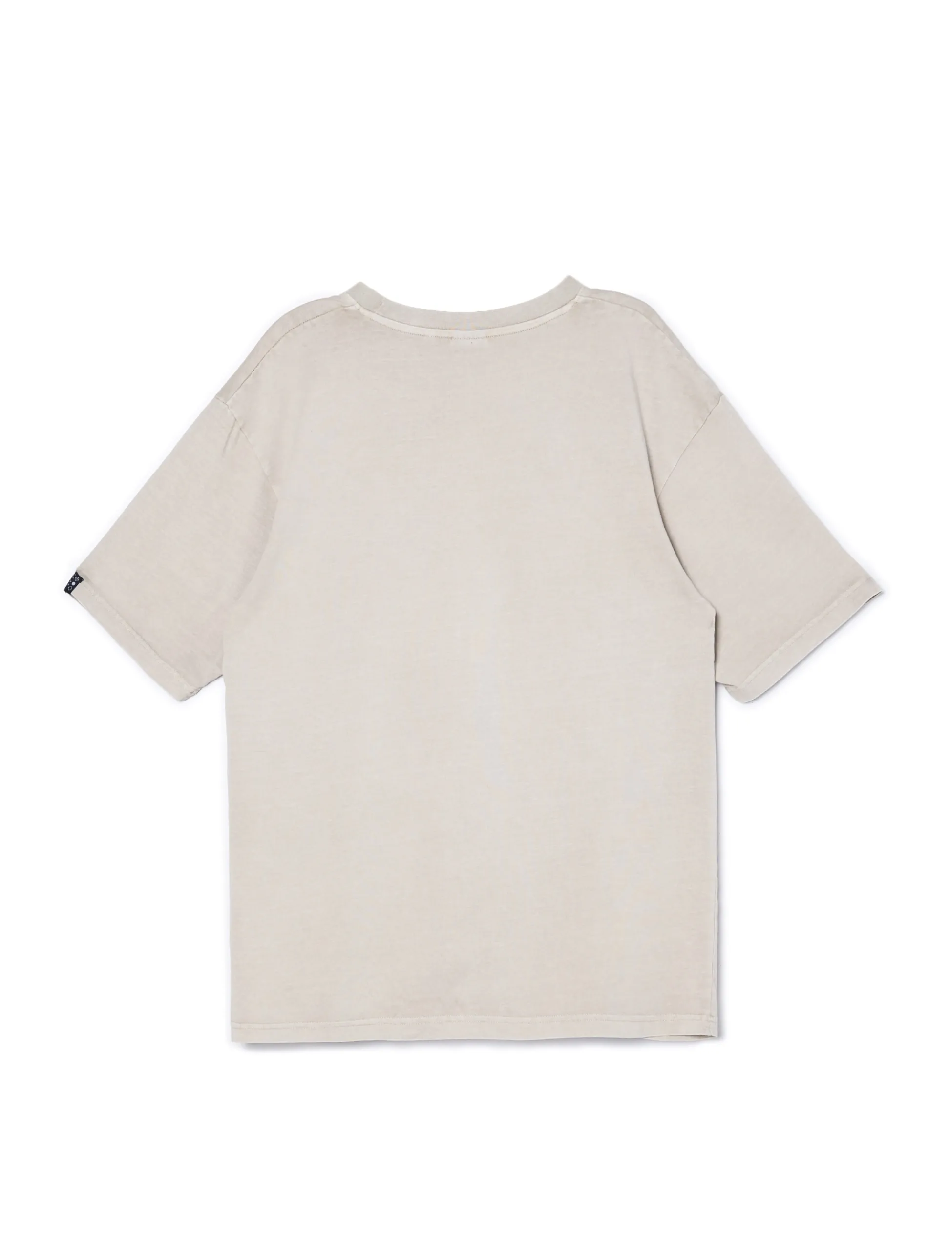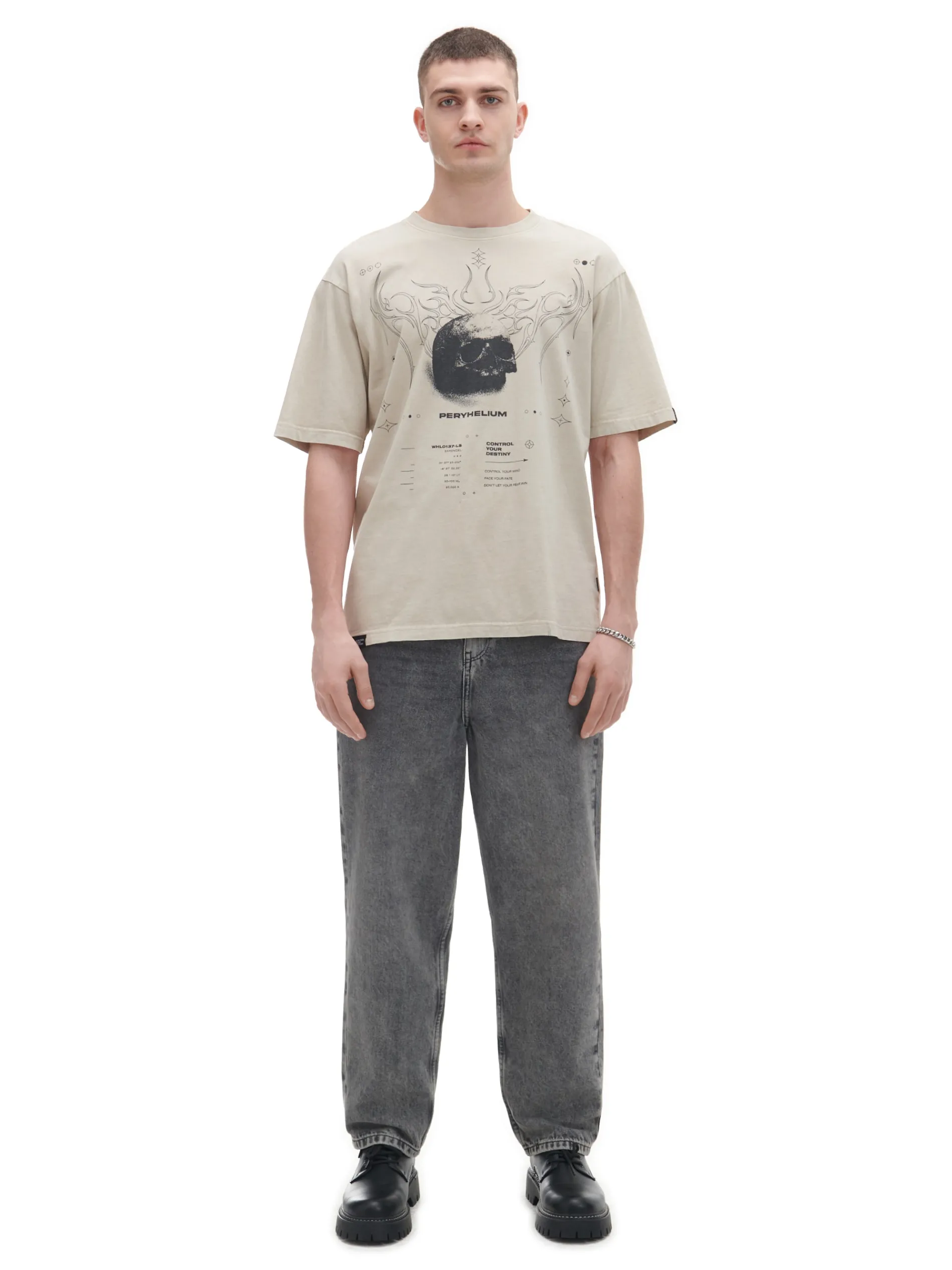 Kremowa męska koszulka, uszyta w 100% z bawełny. krój comfort krótkie rękawy efekt acid wash nadruki z motywem m.in. czaszki