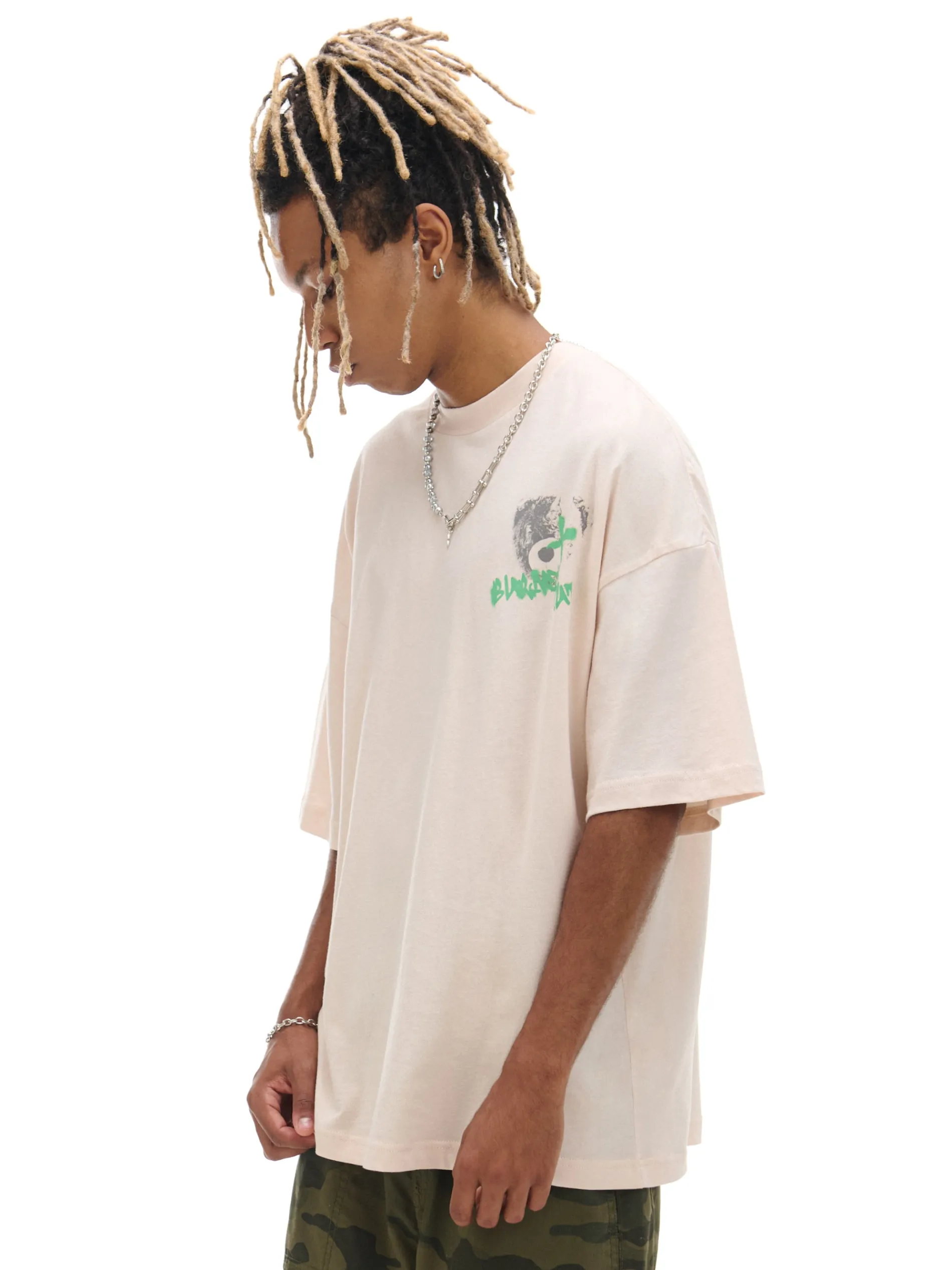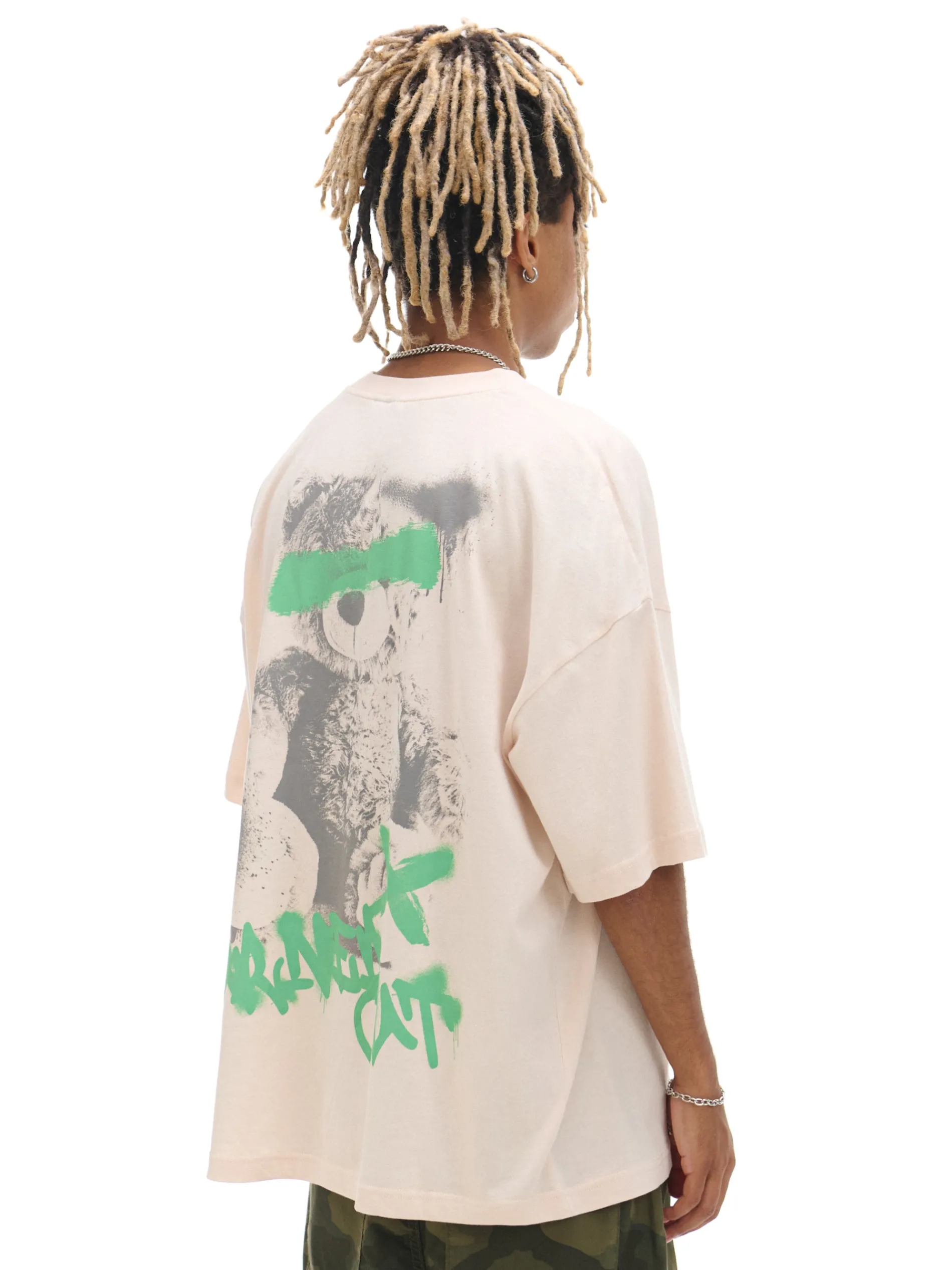 Bawełniany męski T-shirt z krótkim rękawem i nadrukiem po obu stronach z motywem pluszowego misia. 100% bawełny obszerny krój boxy krótkie, szerokie rękawy mały nadruk na piersi, duży nadruk na plecach oryginalny print