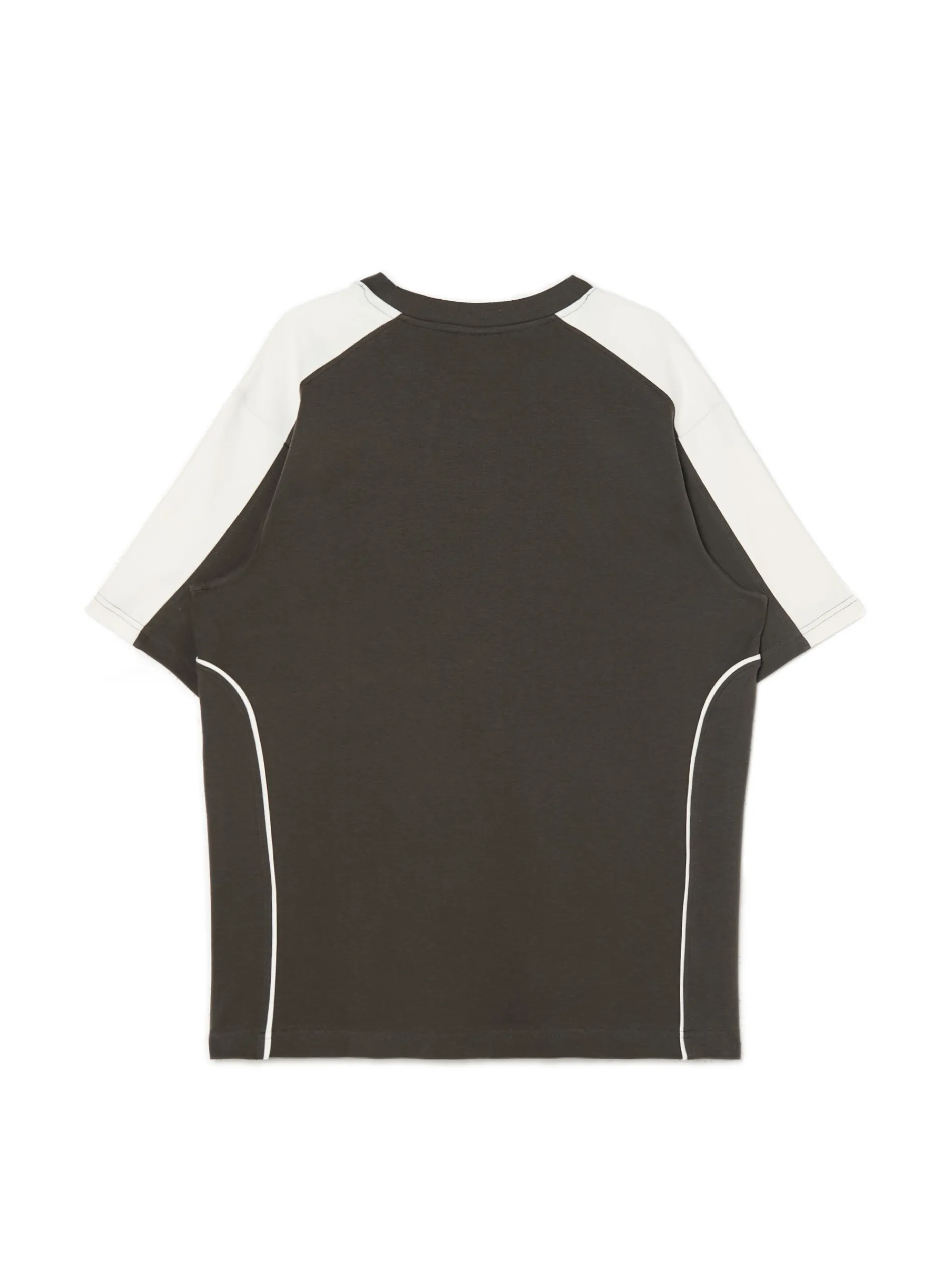 Męska koszulka z krótkim rękawem uszyta z oddychającej, bawełnianej dzianiny. Idealna na rower, deskę, czy spontaniczne wypady z ekipą. 100% bawełny wygodny krój comfort okrągły dekolt z lamówką krótkie rękawy kontrastowy nadruk z przodu ozdobne przeszycia