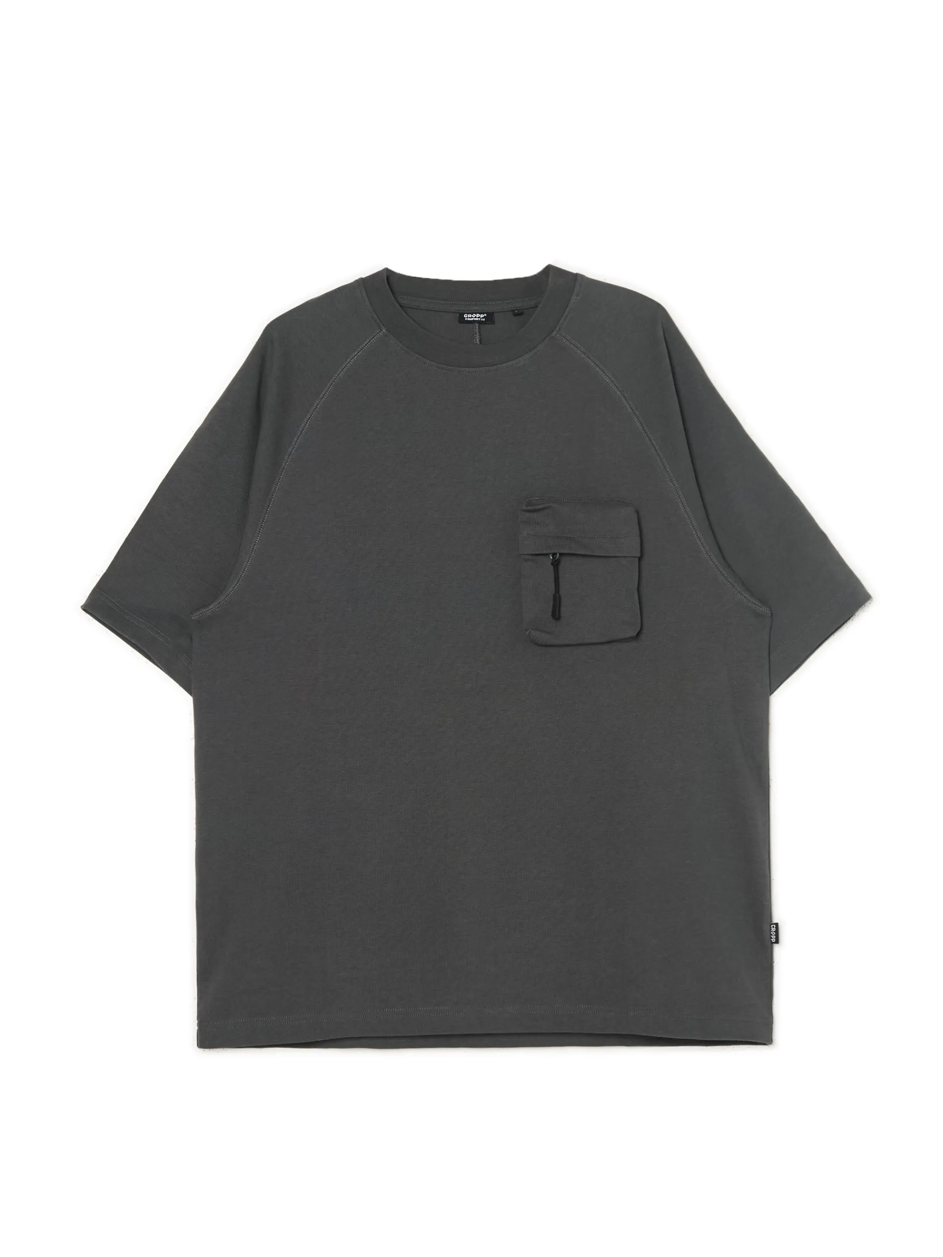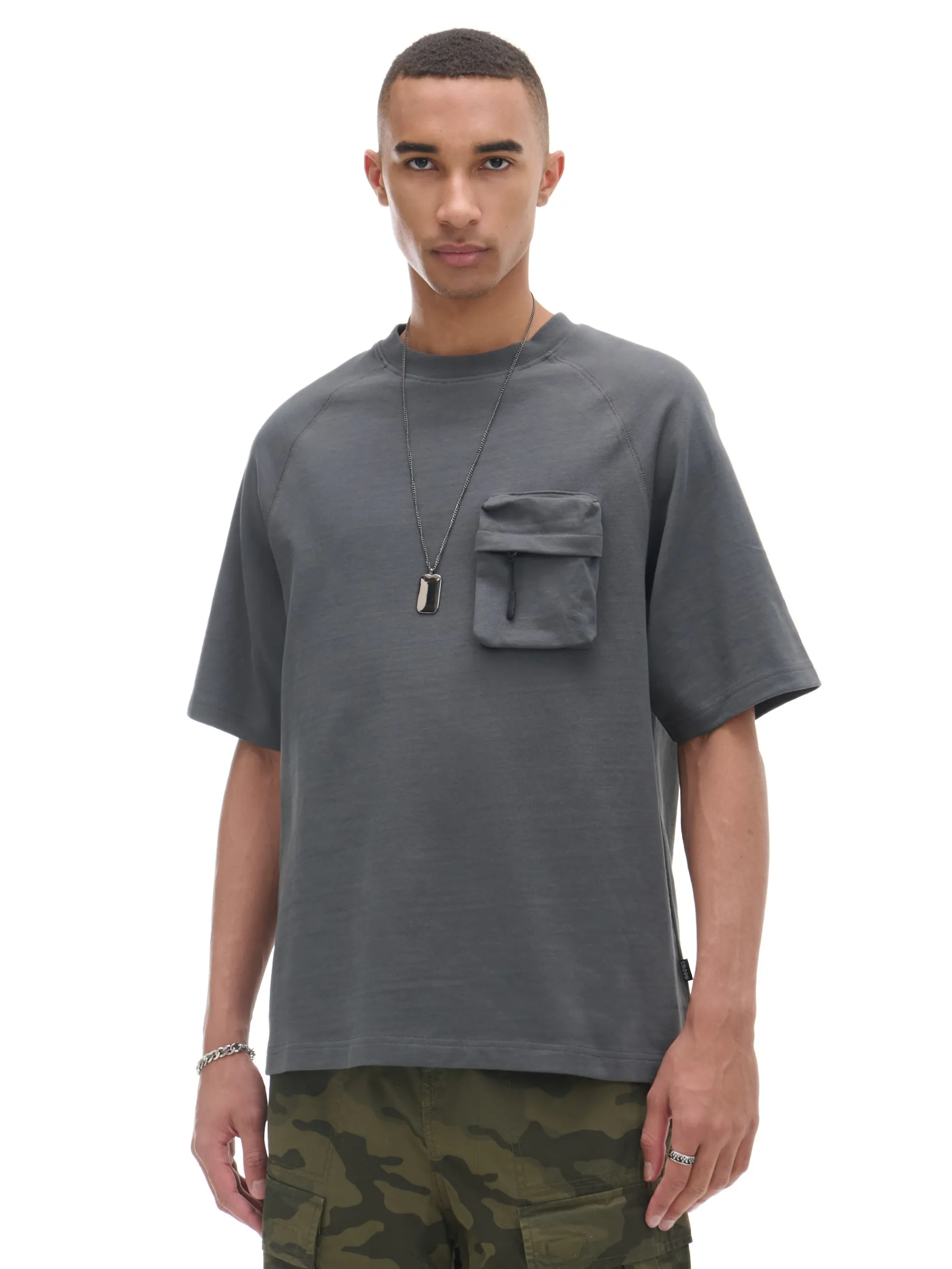 T-shirt męski w kolorze szarym, uszyty z bawełnianego materiału. Wyróżnikiem tego modelu jest kieszonka typu cargo na przodzie zapinana na zamek. 100% bawełny wygodny krój comfort krótkie, raglanowe rękawy półokrągły dekolt ze ściągaczem kieszeń piersiowa z krytym zamkiem Wzrost modela: 185 cm
