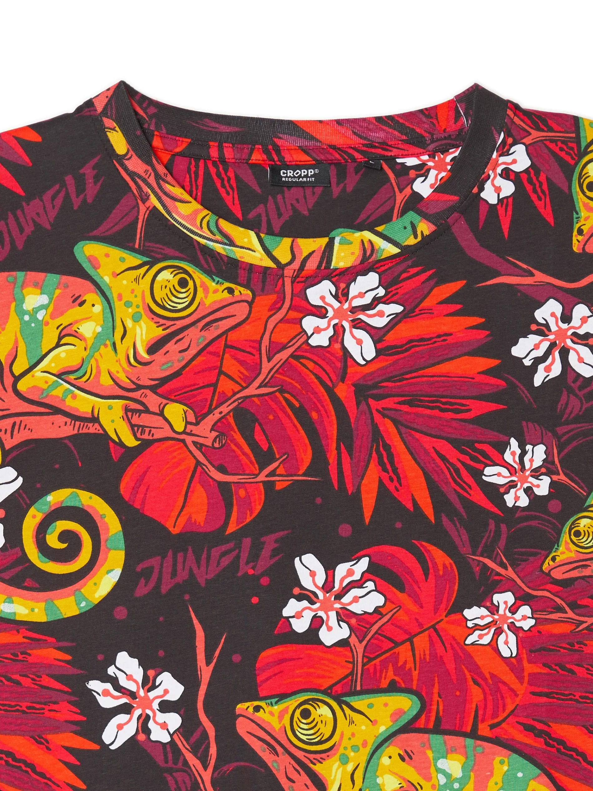Koszulka męska z kameleonem i motywem roślin egzotycznych, uszyta z bawełny. Regularny krój, krótkie rękawy, nadruk na całości.