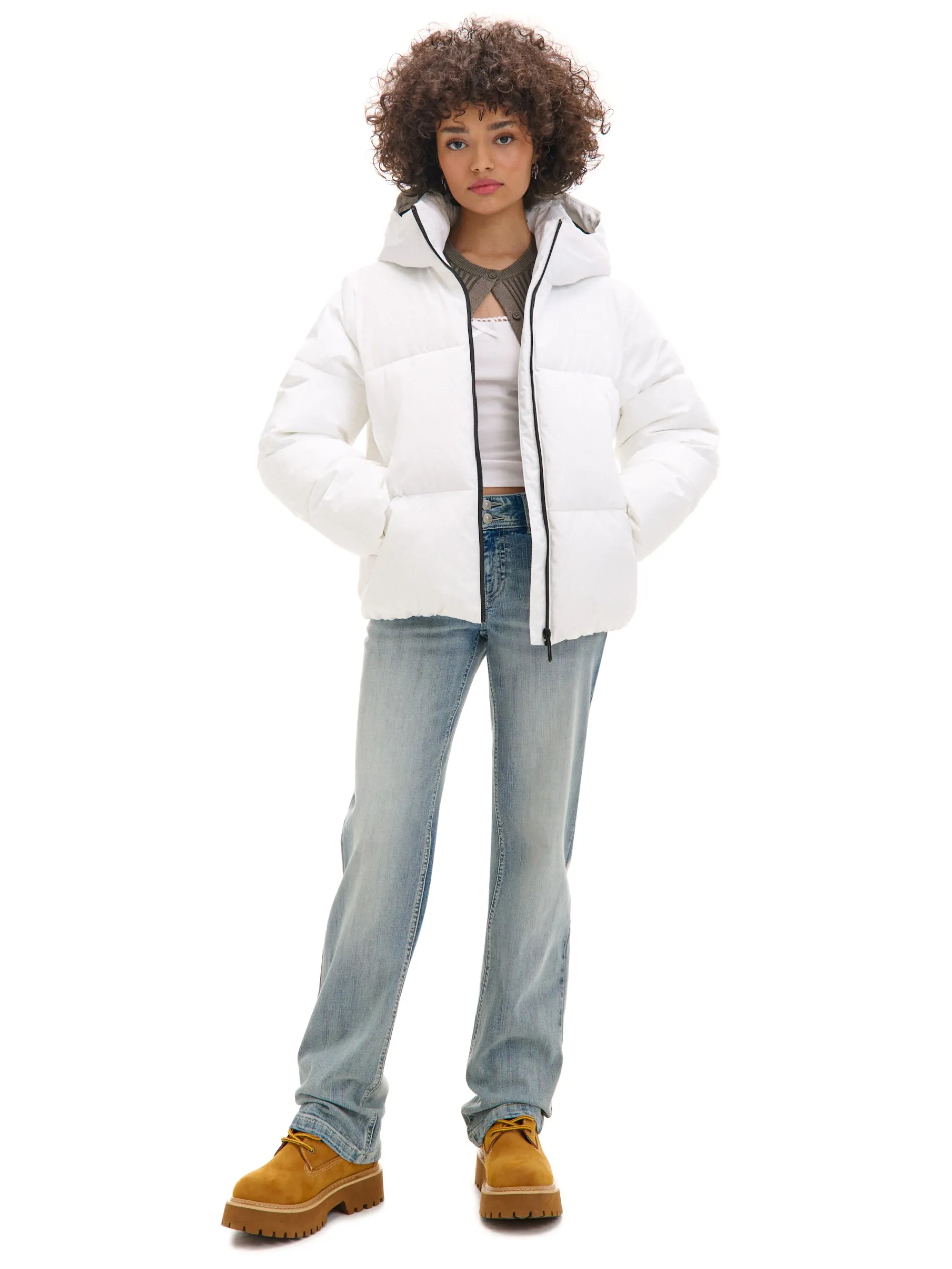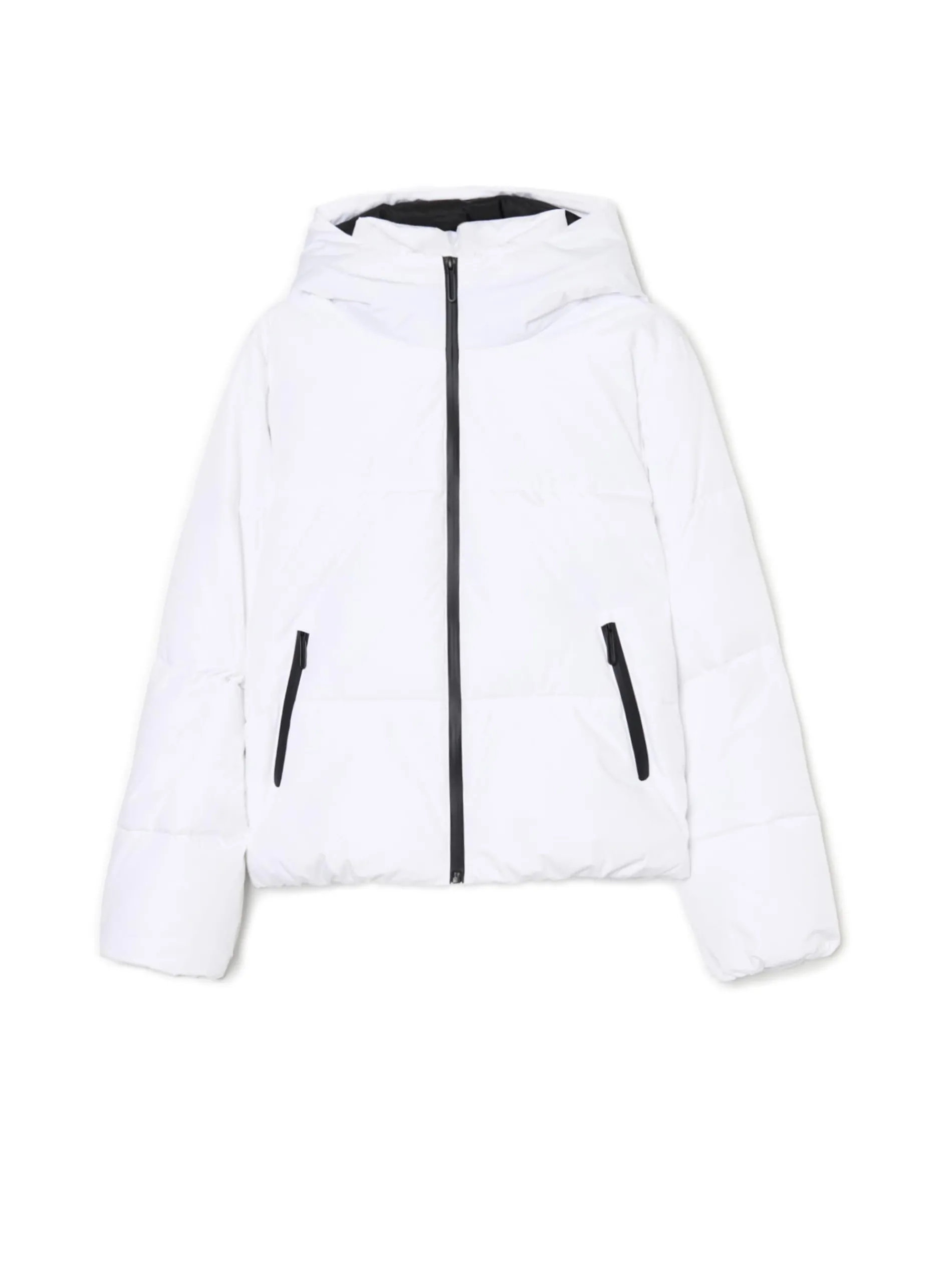 Pikowana damska kurtka z kapturem uszyta z trwałej tkaniny w białym i czarnym kolorze. Wewnątrz podszewka z wypełnieniem, które ogrzeje Cię w trakcie mrozów. Dodatkowo praktyczne kieszenie na Twoje itemki. Wejdź w zimę z naszymi outerwearami! ciepła pikowana kurtka typu puffer regularny krój wewnątrz wykończenie na podszewce ocieplenie zapinana na zamek na całej długości wysoka stójka i regulowany kaptur boczne kieszenie z zamkami wodoodporne taśmy przy suwakach kieszeni regulacja dołu za pomocą gumek ze stoperami