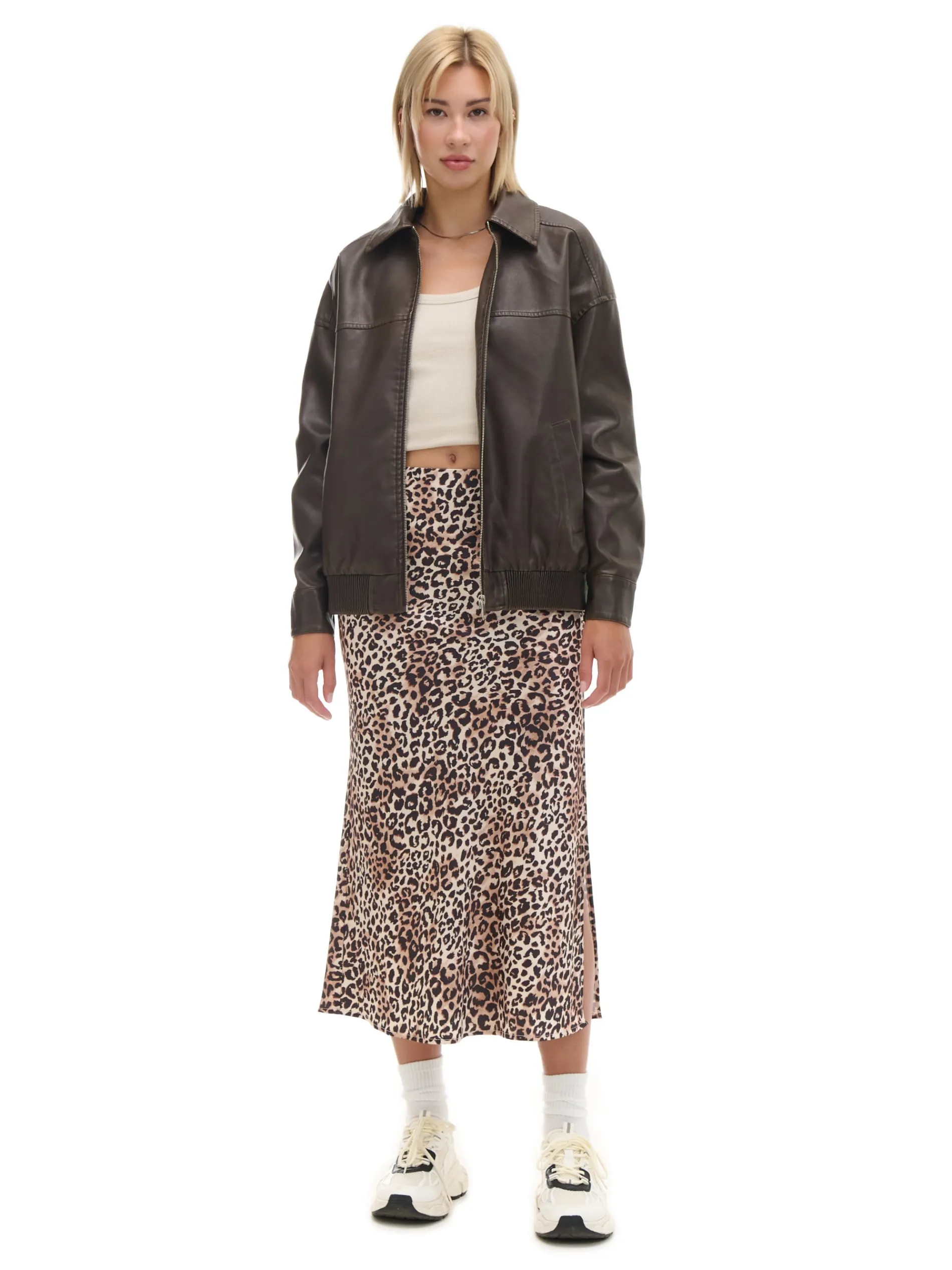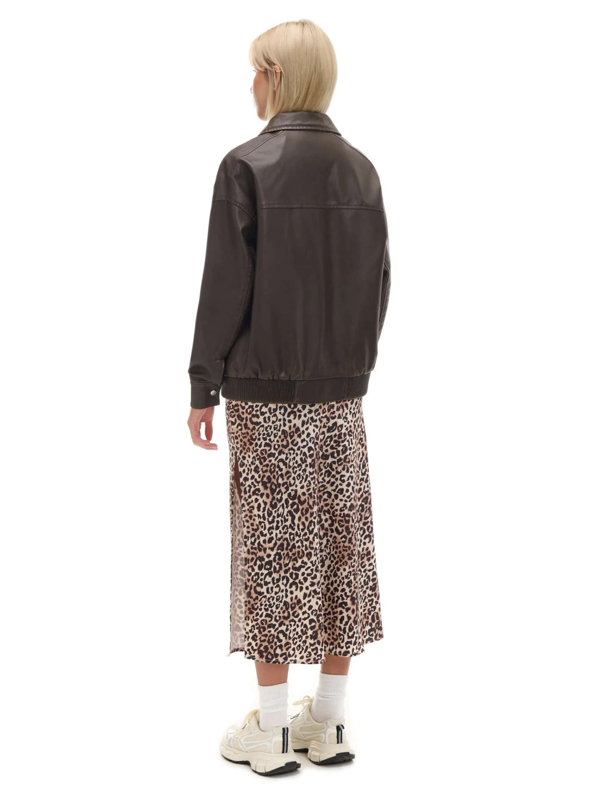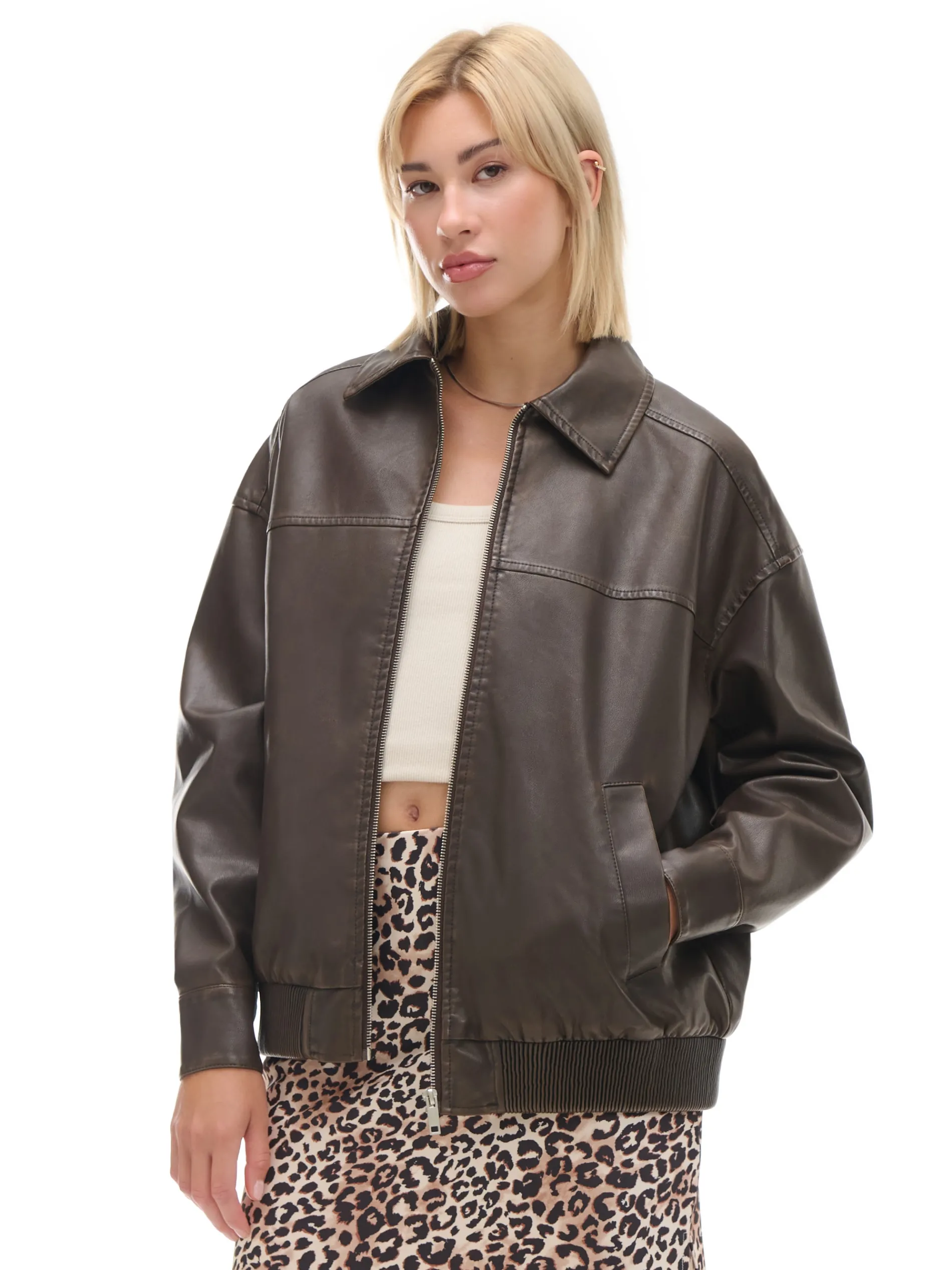 Kurtka damska typu bomber o kroju dad fit, uszyta z materiału imitującego skórę. Ponadczasowa odzież wierzchnia w odświeżonej wersji. przejściowa kurtka typu bomber wewnątrz gładka podszewka zapinana na zamek na całej długości wykładany kołnierz długie rękawy z zatrzaskami przy mankietach dół wykończony elastyczną gumą otwarte kieszenie po bokach delikatny efekt sprania Wzrost modelki: 177 cm