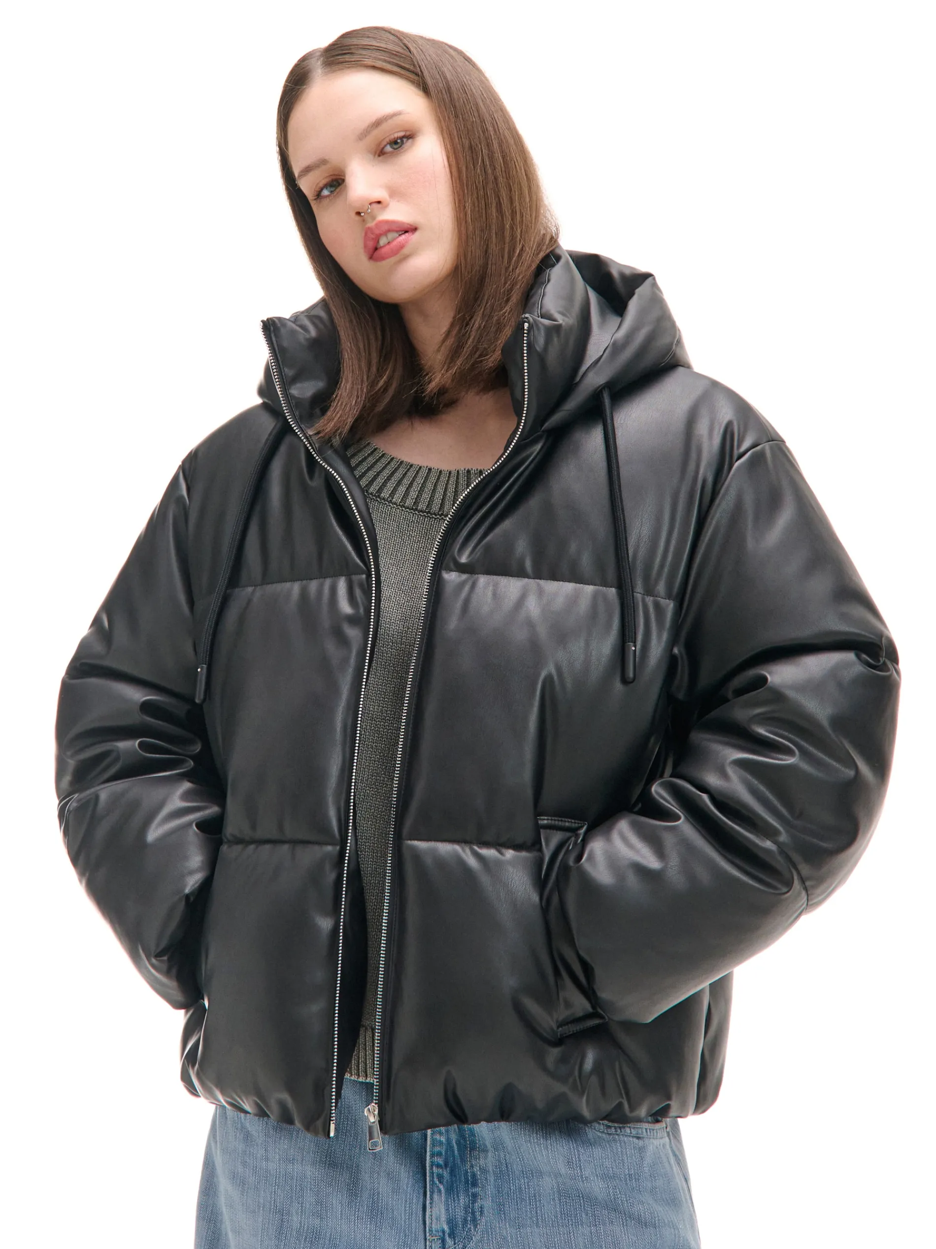 Ciepła damska pufferka, uszyta z czarnej, lekko połyskliwej tkaniny. regularny krój zapięcie na suwak kaptur regulowany sznurkiem stójka pod szyją elastyczna gumka wszyta w dolny brzeg dwie kieszenie z przodu, zapinane na zatrzask długie rękawy z wewnętrznym elastycznym mankietem podszewka i ocieplenie Wzrost modelki: 172 cm