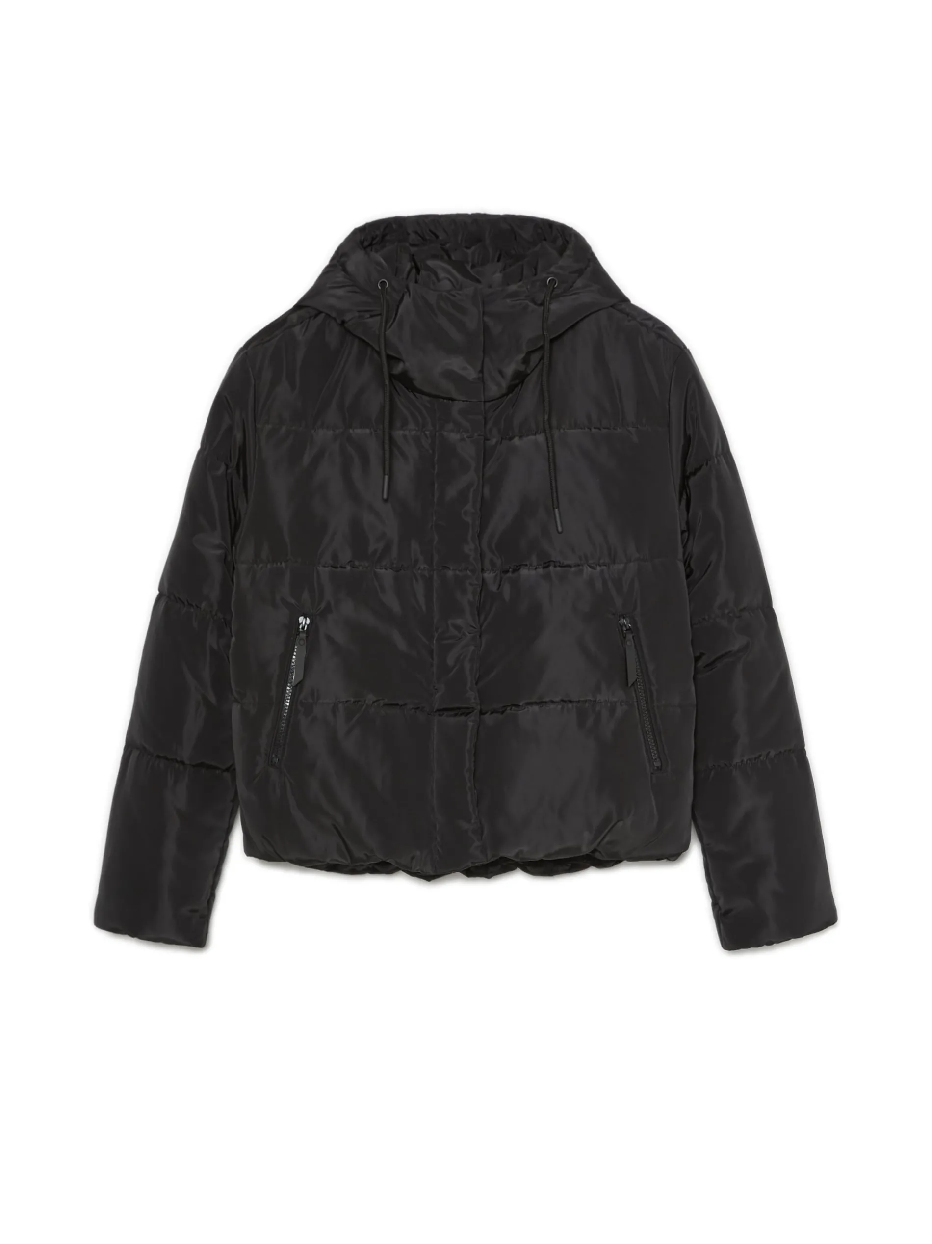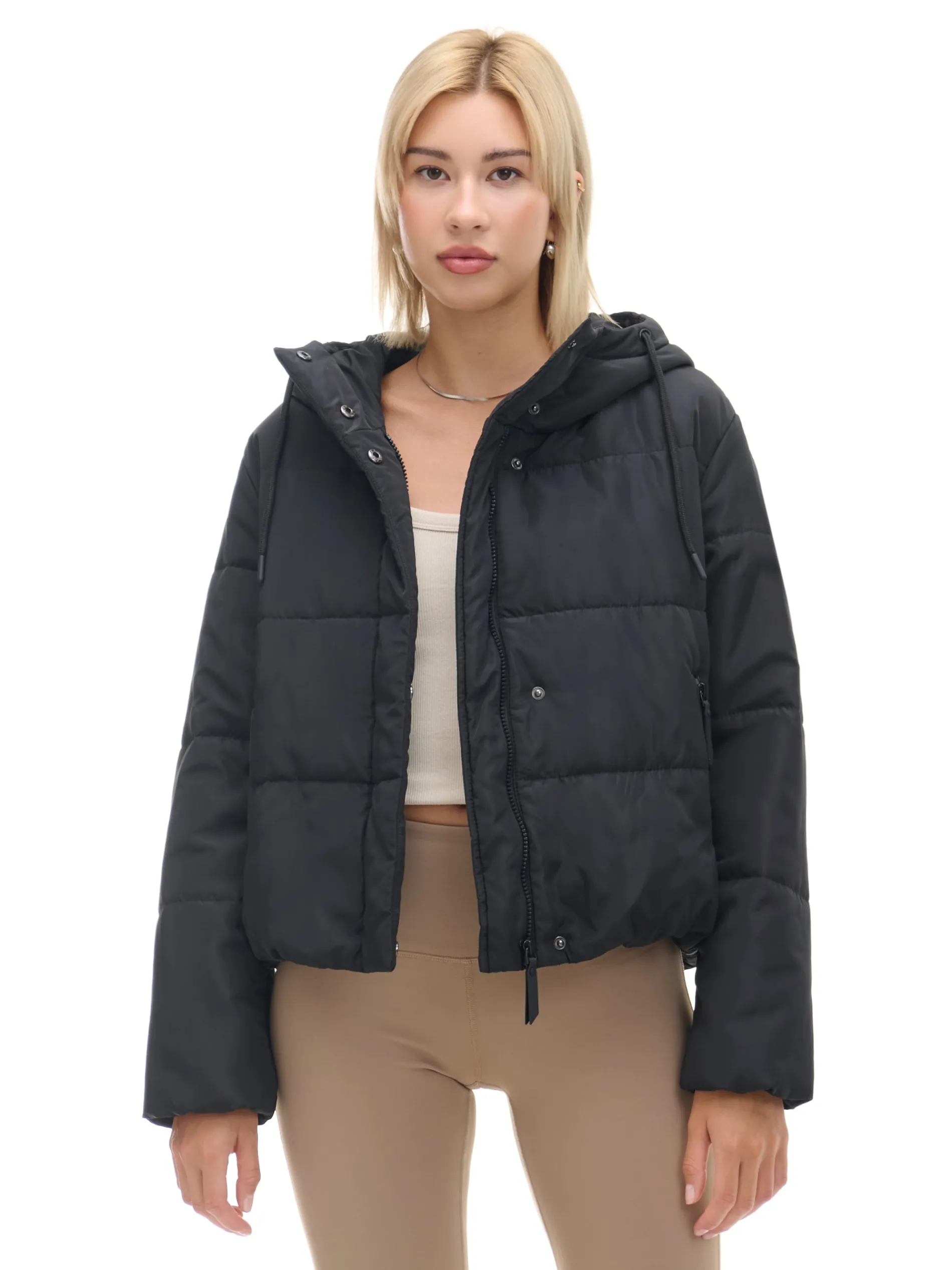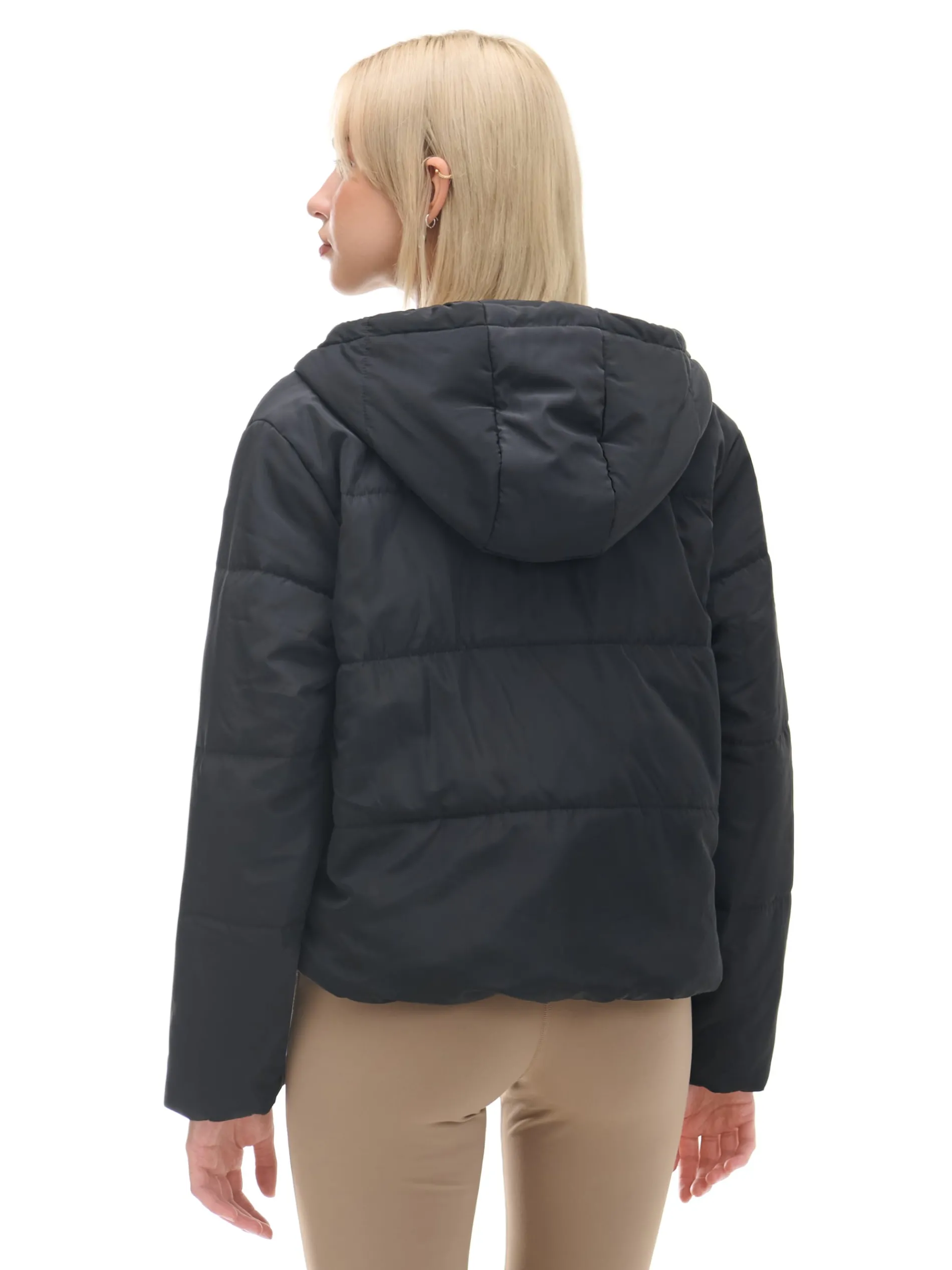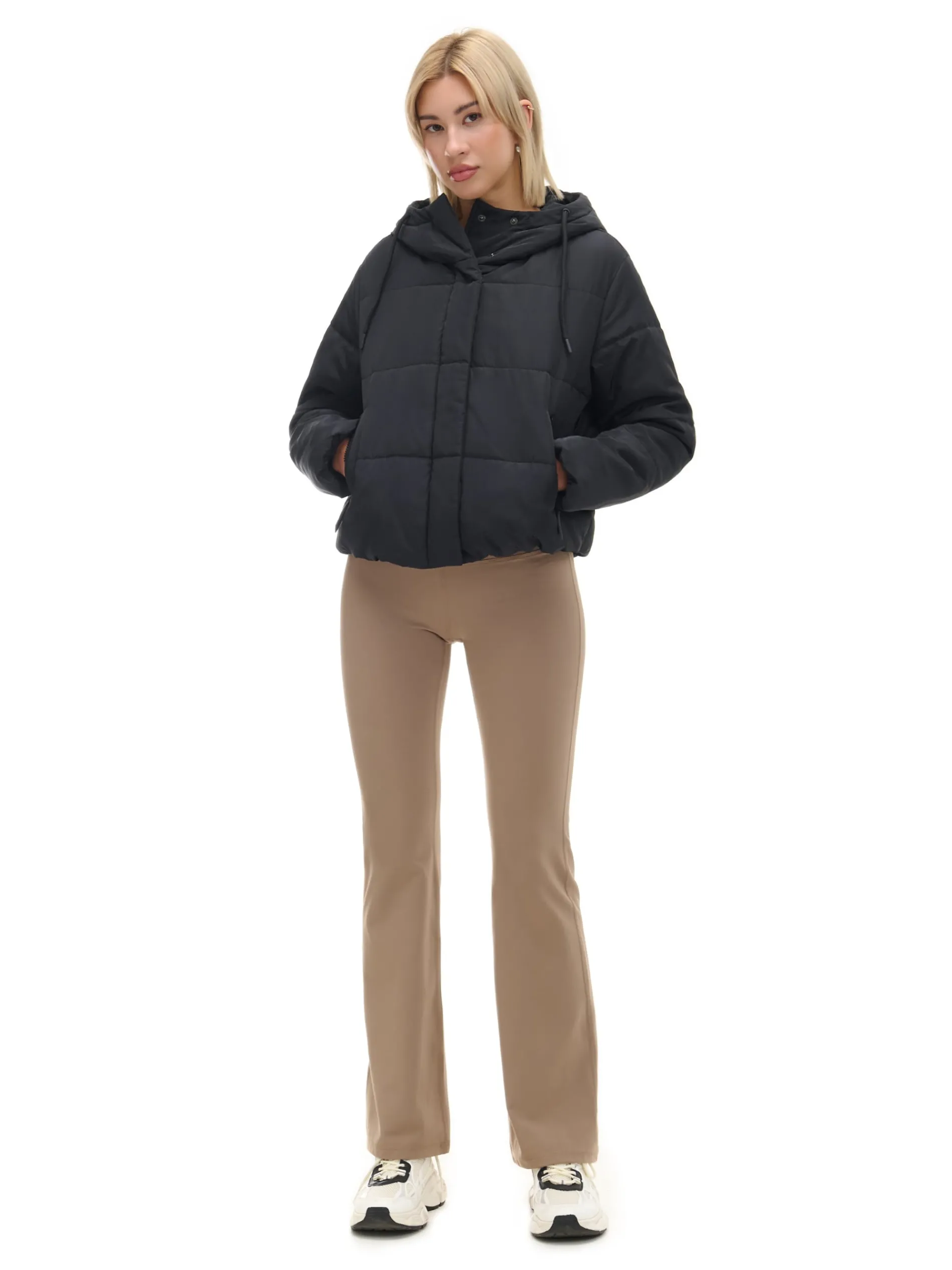 Damska czarna kurtka puffer, uszyta z wodoodpornej tkaniny. Idealna na jesienny sezon przejściowy. średnia długość, regularny krój pikowanie na całej powierzchni zapięcie na suwak, kryty panelem zapinanym na zatrzaski stójka zapinana na zatrzaski kaptur regulowany sznurkiem rękawy i dolny brzeg zakończone ściągaczem z wszytą elastyczną gumką dwie kieszenie podszewka z polarowego, przyjemnego w dotyku materiału wypełnienie z poliestru Wzrost modelki: 177 cm