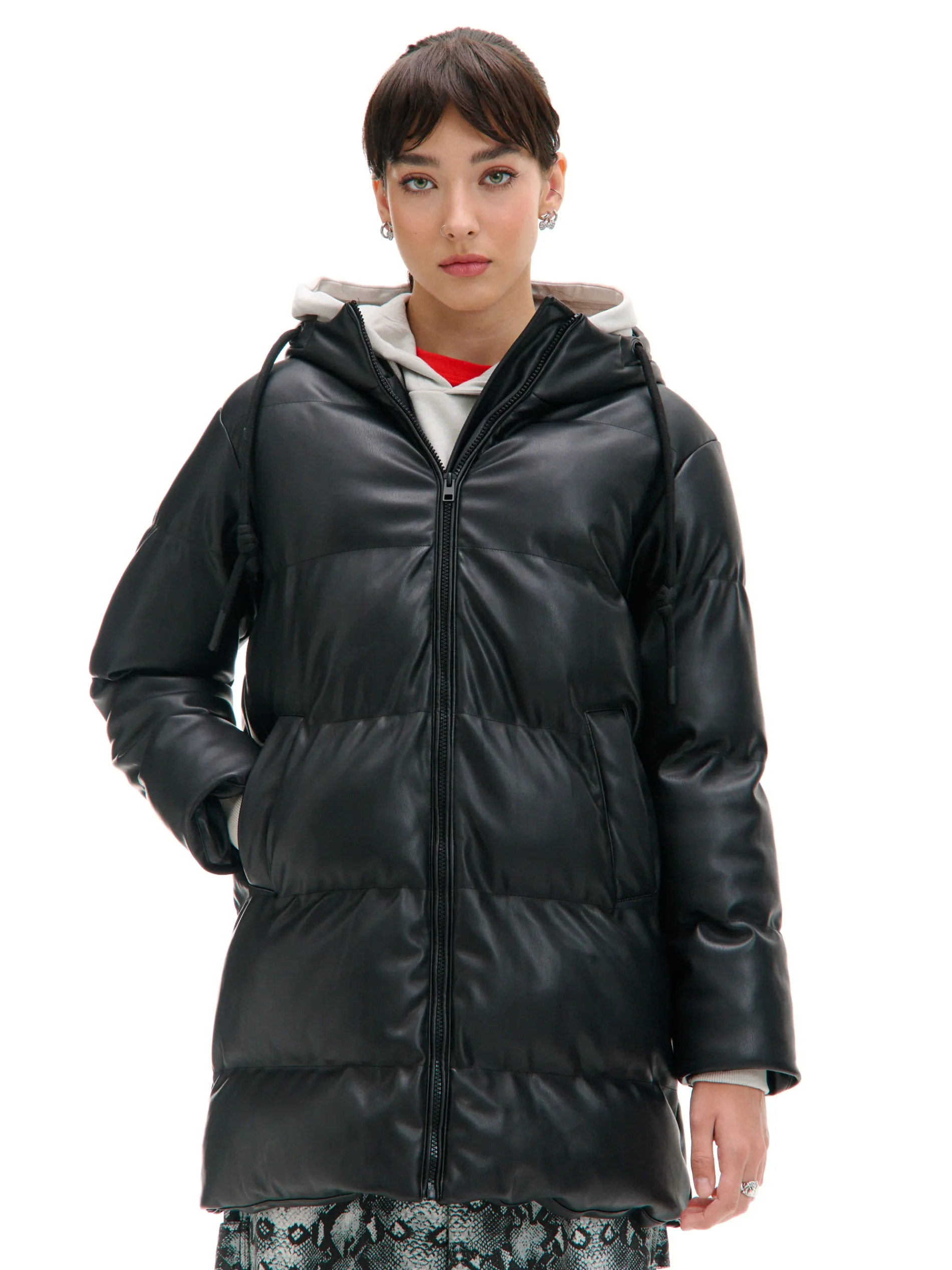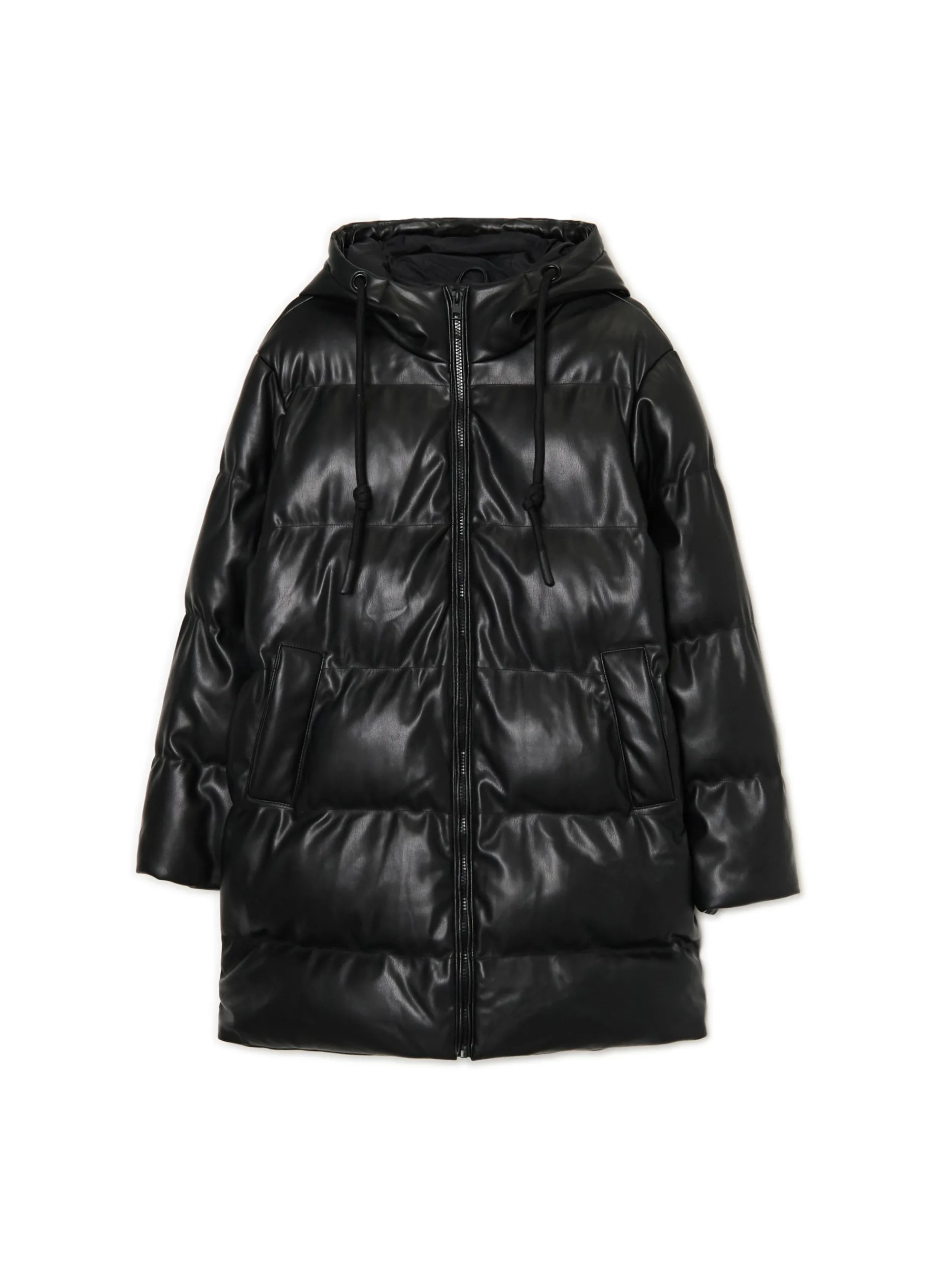 Nie możesz tego przegapić! Oversize’owy pikowany damski płaszcz typu puffer wykonany z imitacji skóry. W wyposażeniu kaptur z regulacją obwodu i kieszenie na zamek. Zimowy casual w klasycznym, czarnym kolorze na każdą okazję! długi pikowany płaszcz typu puffer imitacja skóry wewnątrz wykończenie na podszewce syntetyczne wypełnienie krój oversize zapięcie na zamek na całej długości obszerny kaptur z troczkami długie, swobodne rękawy dwie kieszenie z przodu