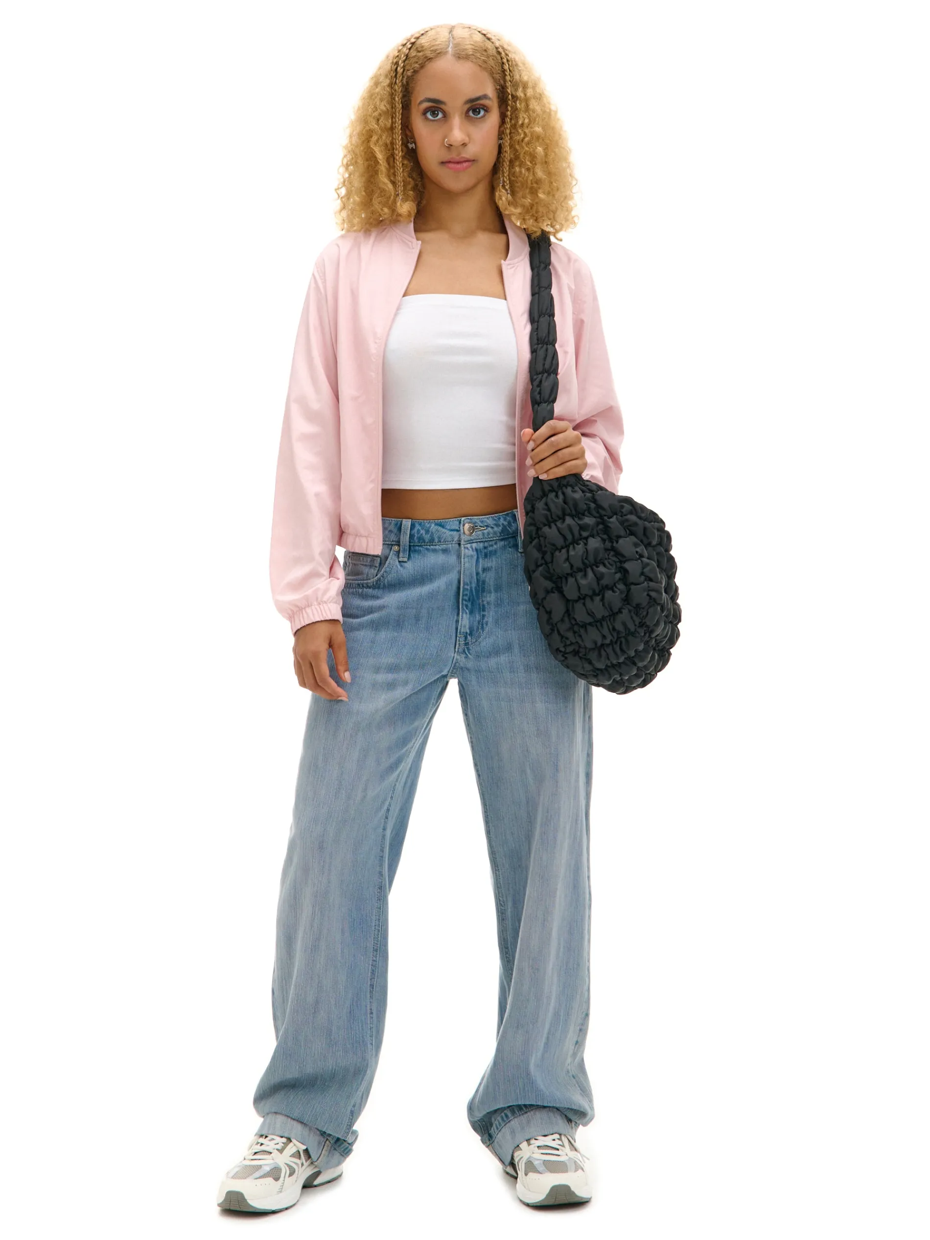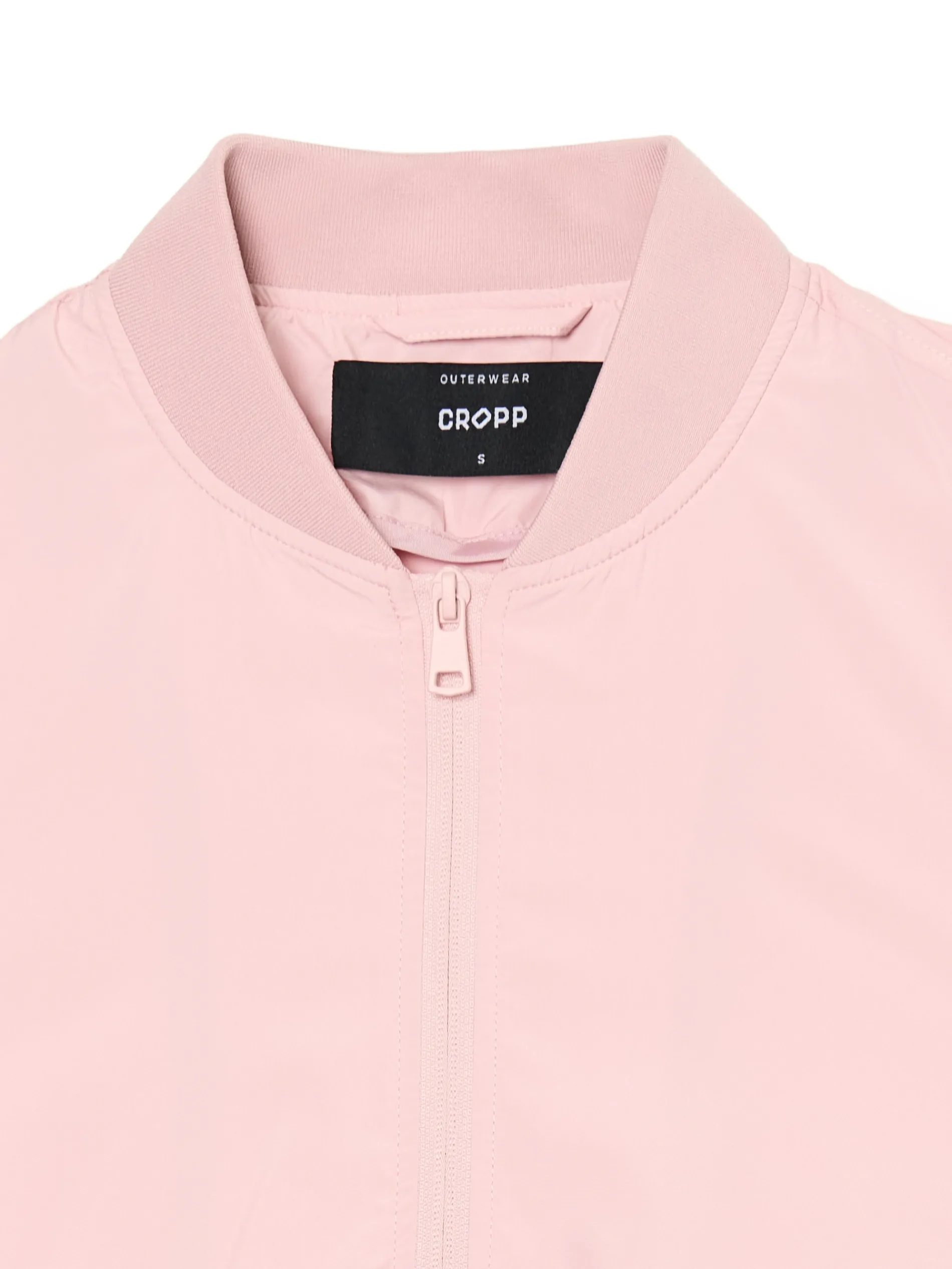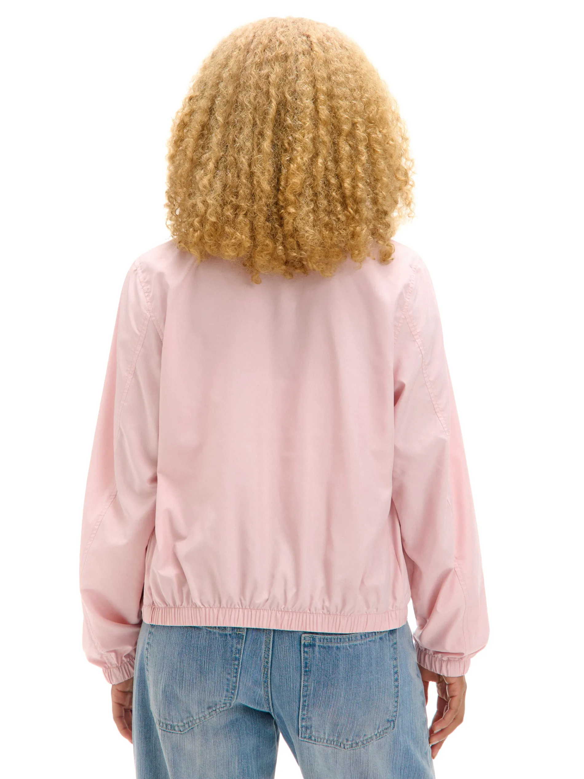 Jasnoróżowa kurtka damska o kroju bomber, uszyta z lekkiej, gładkiej tkaniny. klasyczny krój długie rękawy i dolny brzeg zakończone elastyczną gumką zapięcie na suwak dwie kieszenie dostępna w innych kolorach