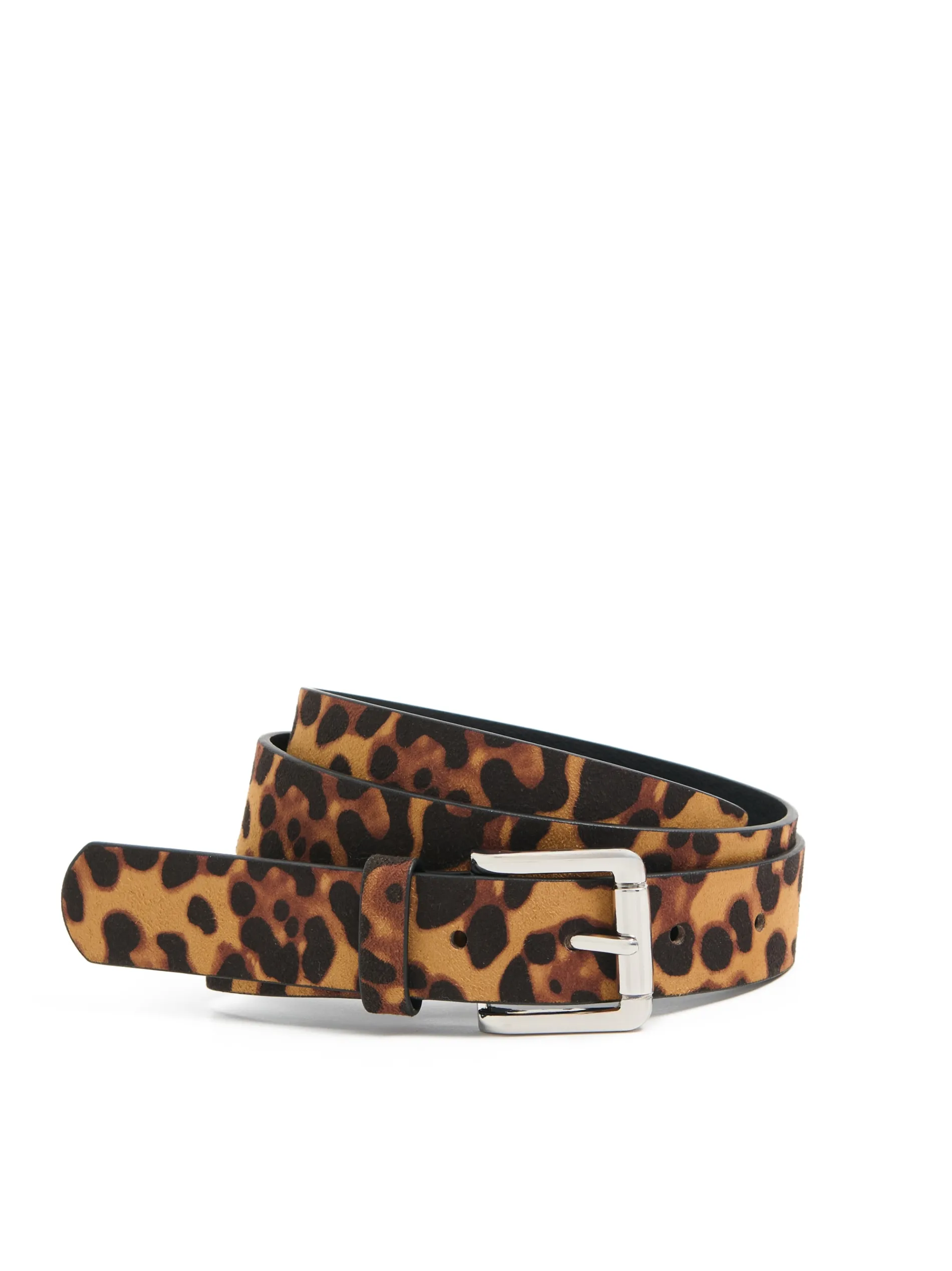 Damski pasek do spodni z klamrą ułatwiającą regulację. Wykonany z imitacji skóry z modnym wzorem w panterkę. Idealny dodatek do wielu stylizacji. wąski pasek uszyty z materiału imitującego skórę możliwość regulacji szerokości obwodu, dzięki zapięciu z przodu dekoracyjna klamra zwierzęcy wzór dodatkowe szlufki
