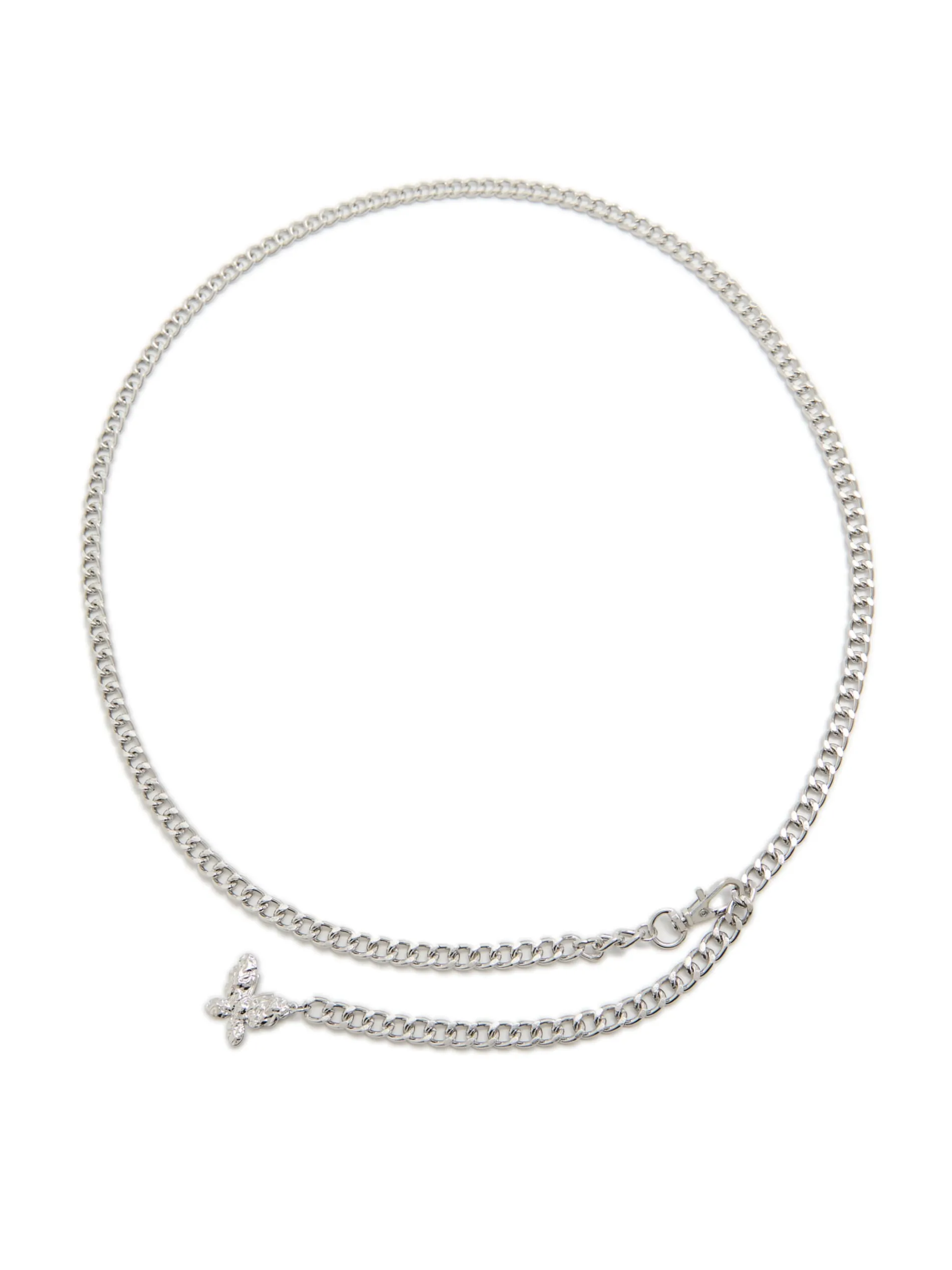 Damski metalowy pasek typu łańcuch z wygodną regulacją i praktycznym zapięciem na pomocą karabińczyka. Model uzupełnia delikatny splot w kolorze srebrnym i ozdobna naszywka w kształcie motyla.