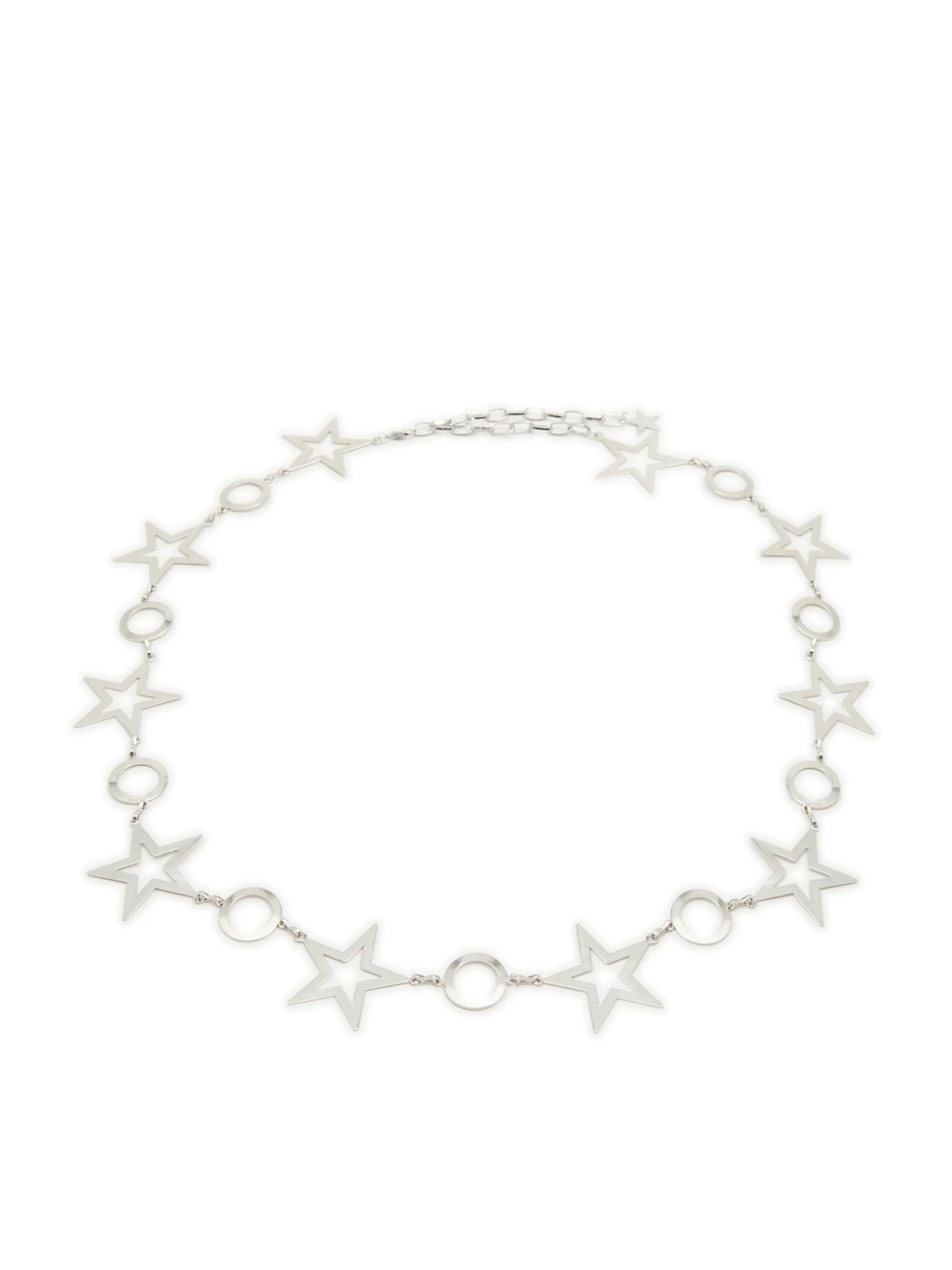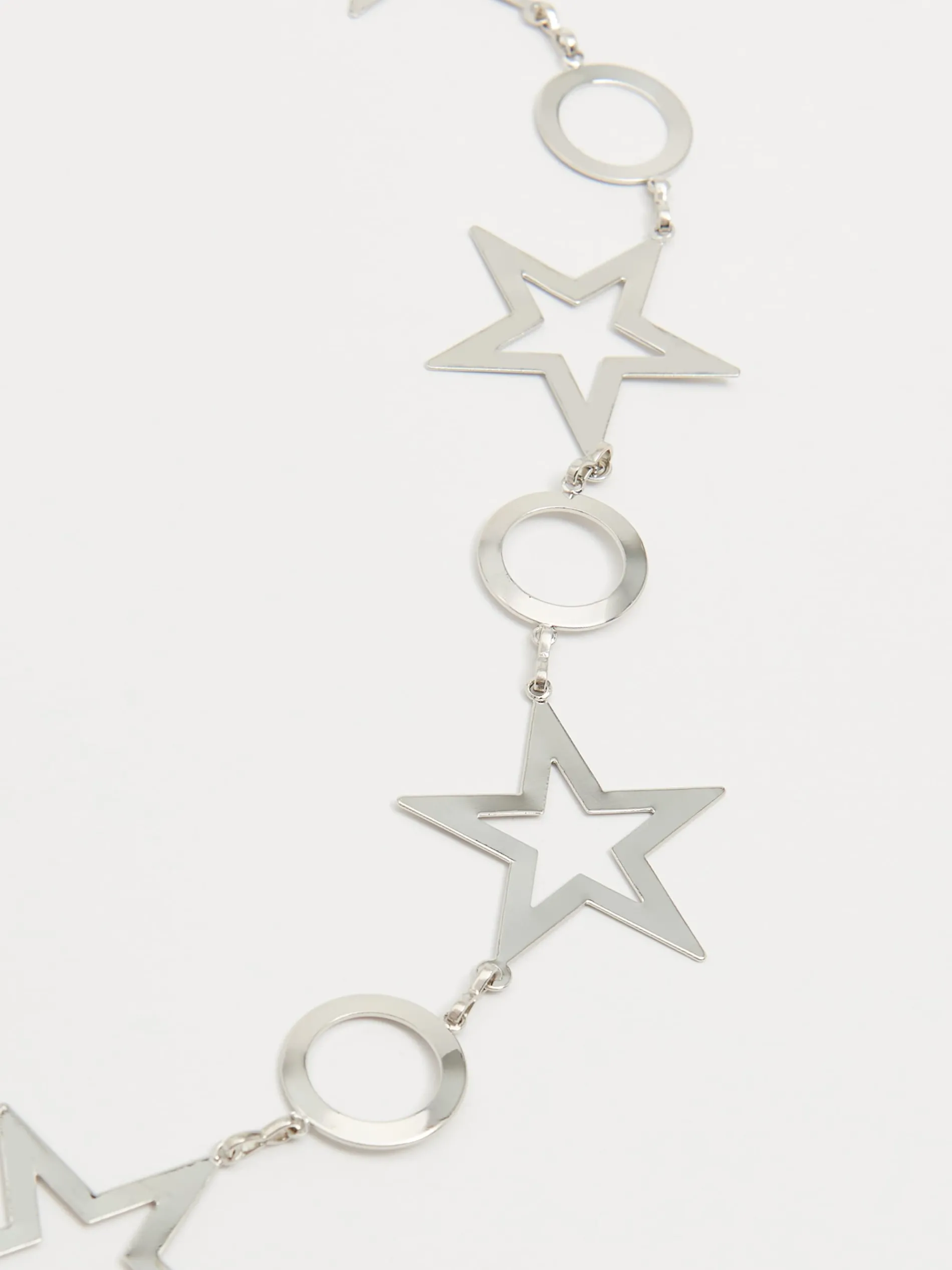 Pasek damski w formie łańcuszka w kolorze srebrnym, z różnego typu ozdobnymi detalami i zapięciem z regulacją.