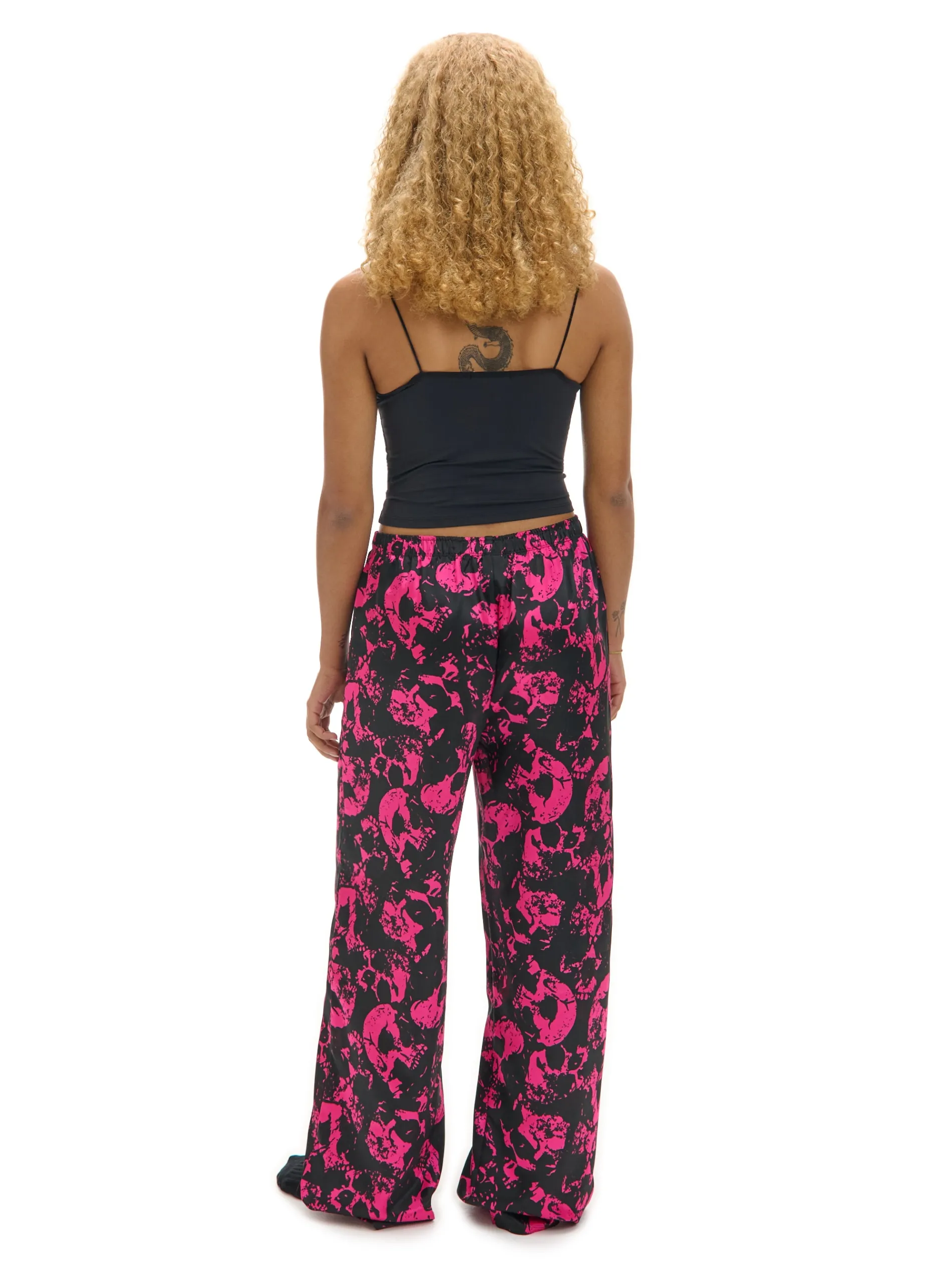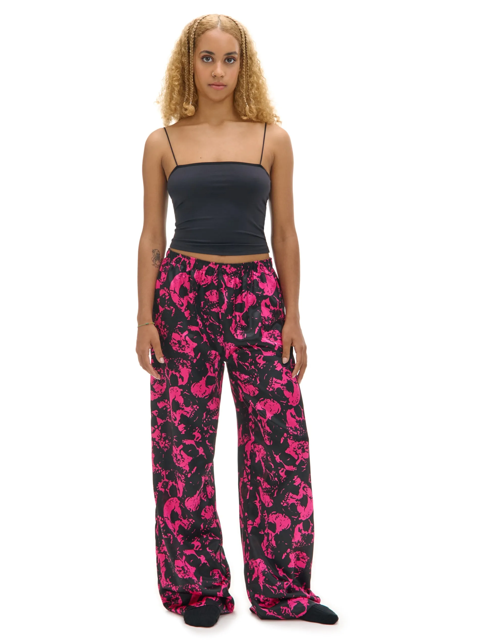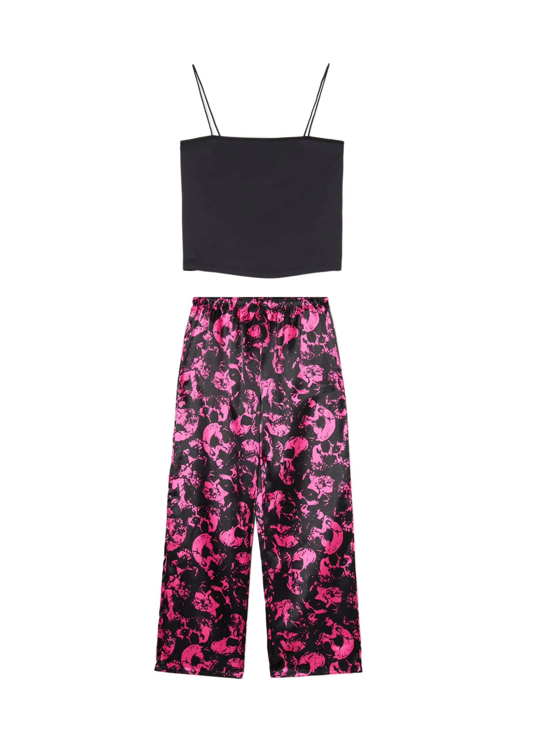 Dwuczęściowy damski zestaw do spania złożony z dopasowanego topu na ramiączkach i spodni z szerokimi nogawkami. Herbata, koc i ten set, czyli must have wieczornego chillowania na kanapie. dzianina z dodatkiem elastycznych włókien koszulka typu crop o dopasowanym kroju na ramiączkach spodnie o swobodnym kroju elastyczna guma w pasie nadruk z motywem czaszki