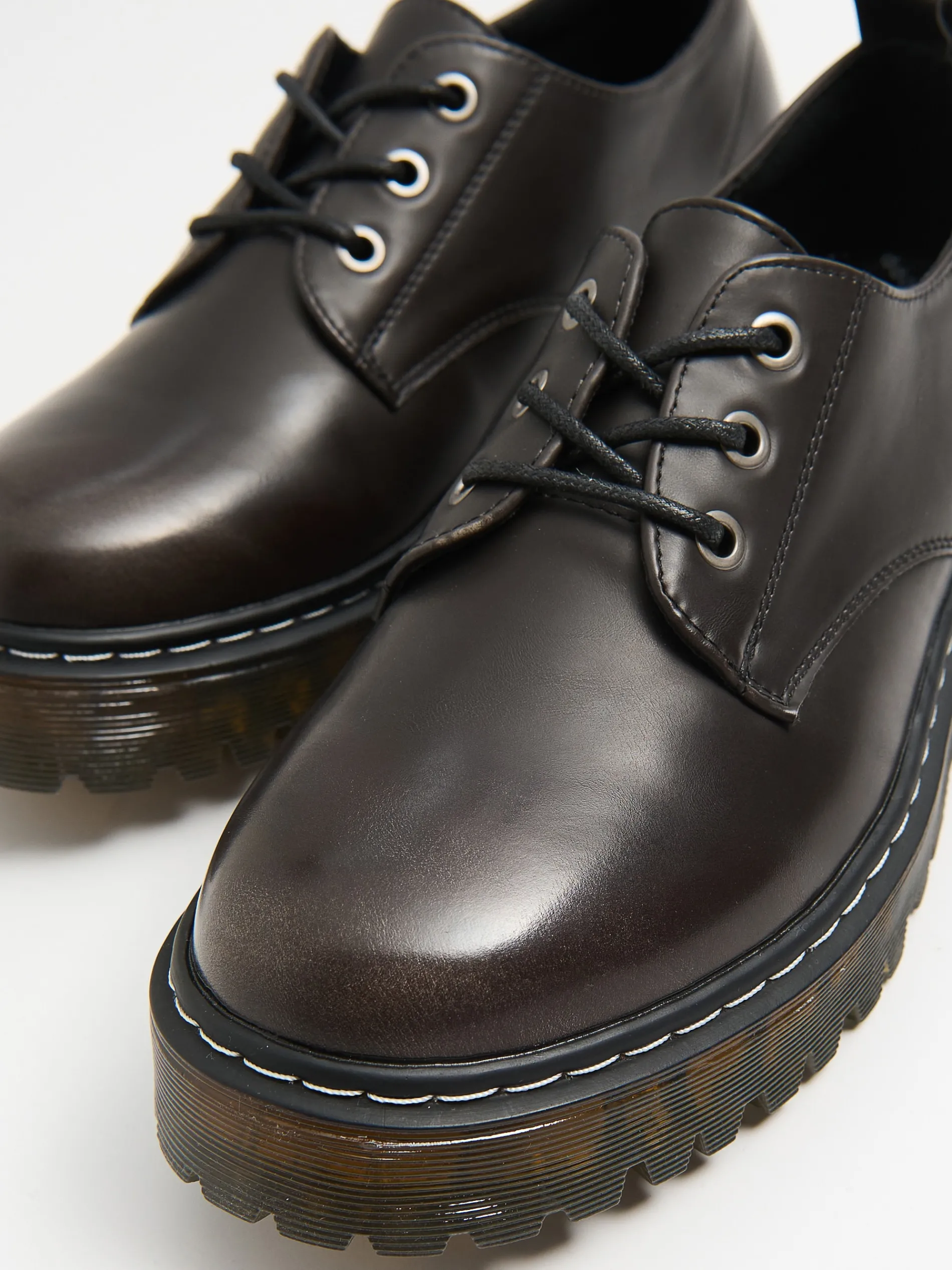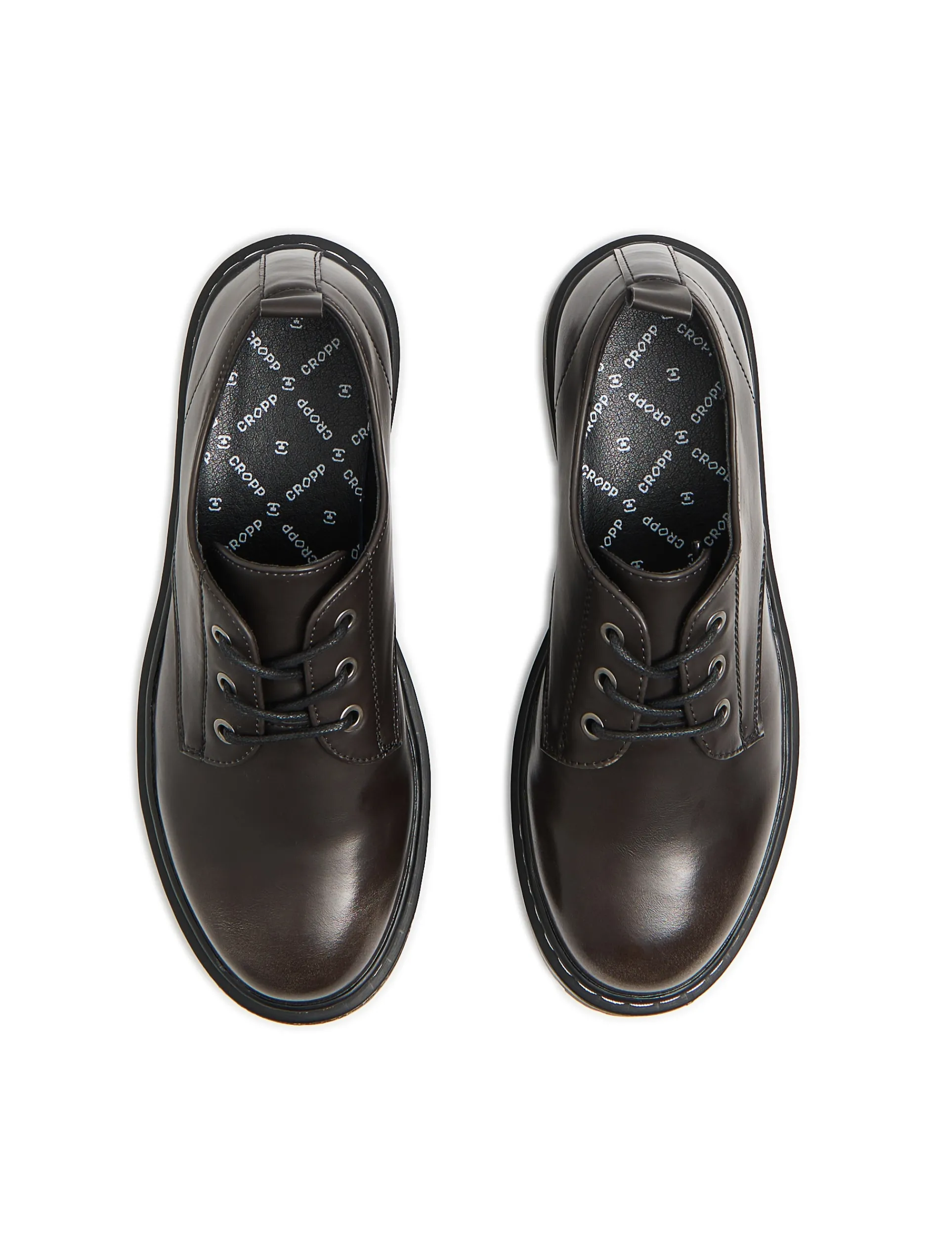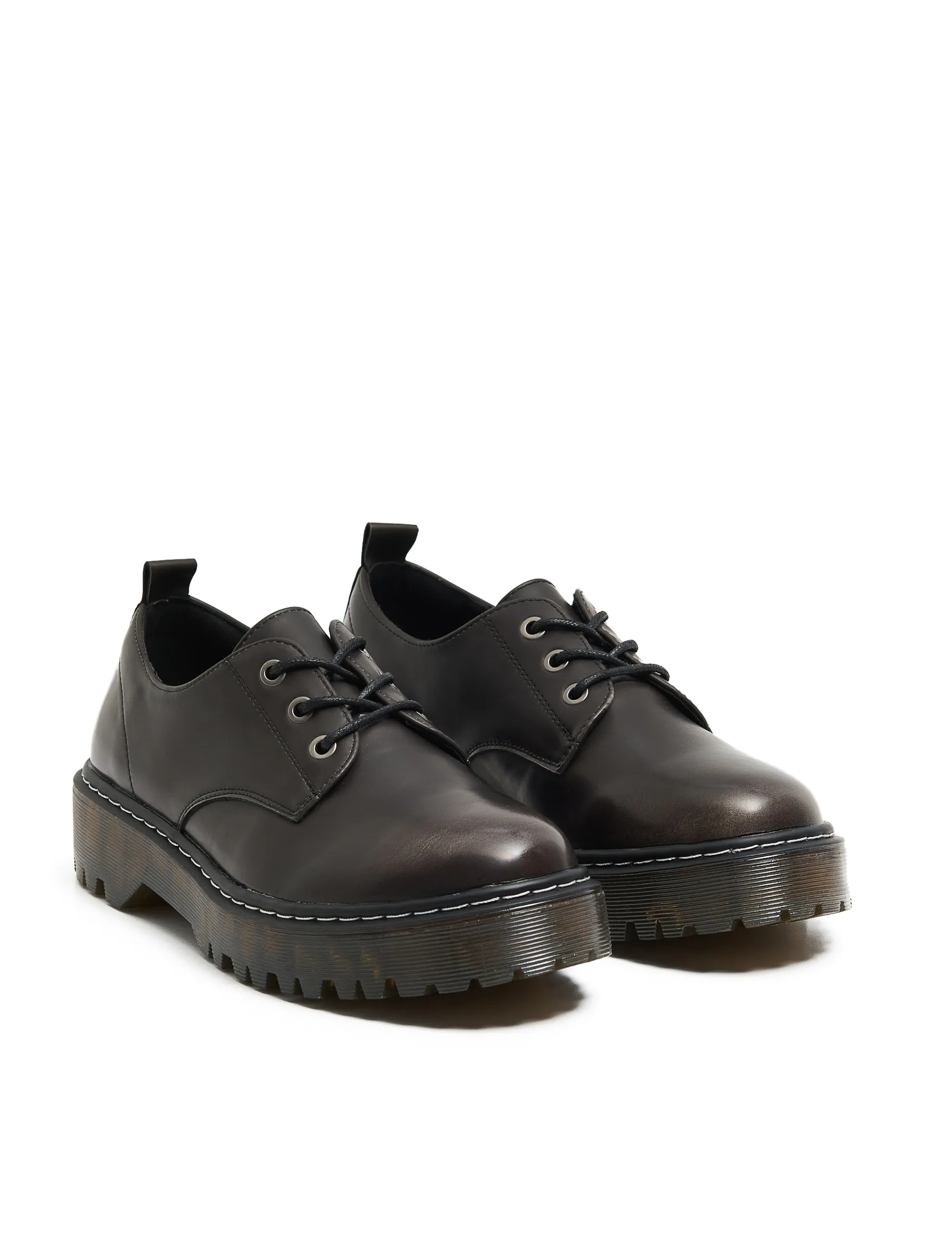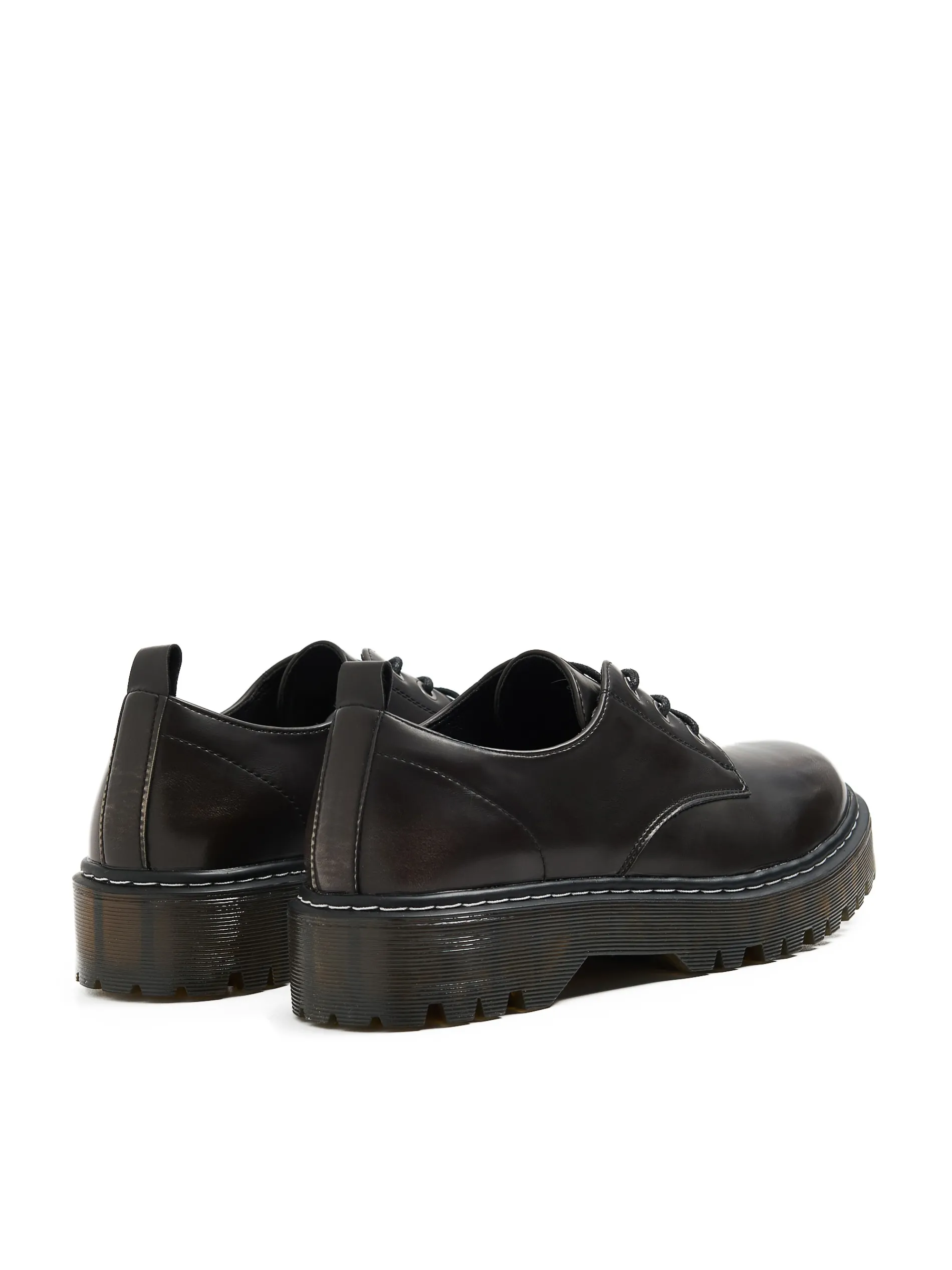 Czarne półbuty damskie derby na grubej podeszwie z niskim obcasem. Cholewka wykonana z materiału imitującego skórę. Idealne na sezon przejściowy! cholewka z imitacji skóry traperowa podeszwa wykonana z gumy termoplastycznej wiązane na czarne sznurowadła chwost na górze cholewki ułatwiający wkładanie ozdobne przeszycia łączące podeszwę z cholewką