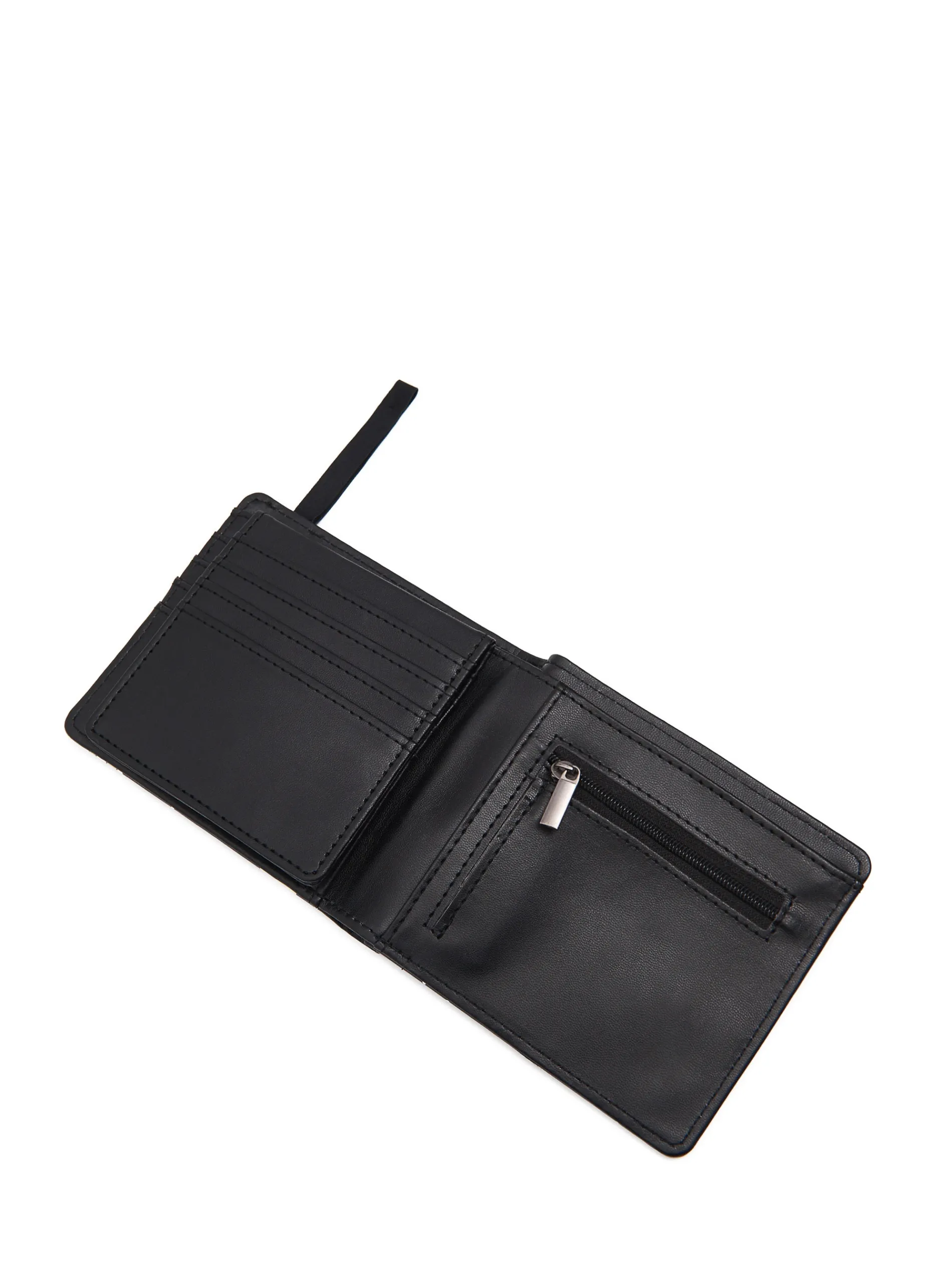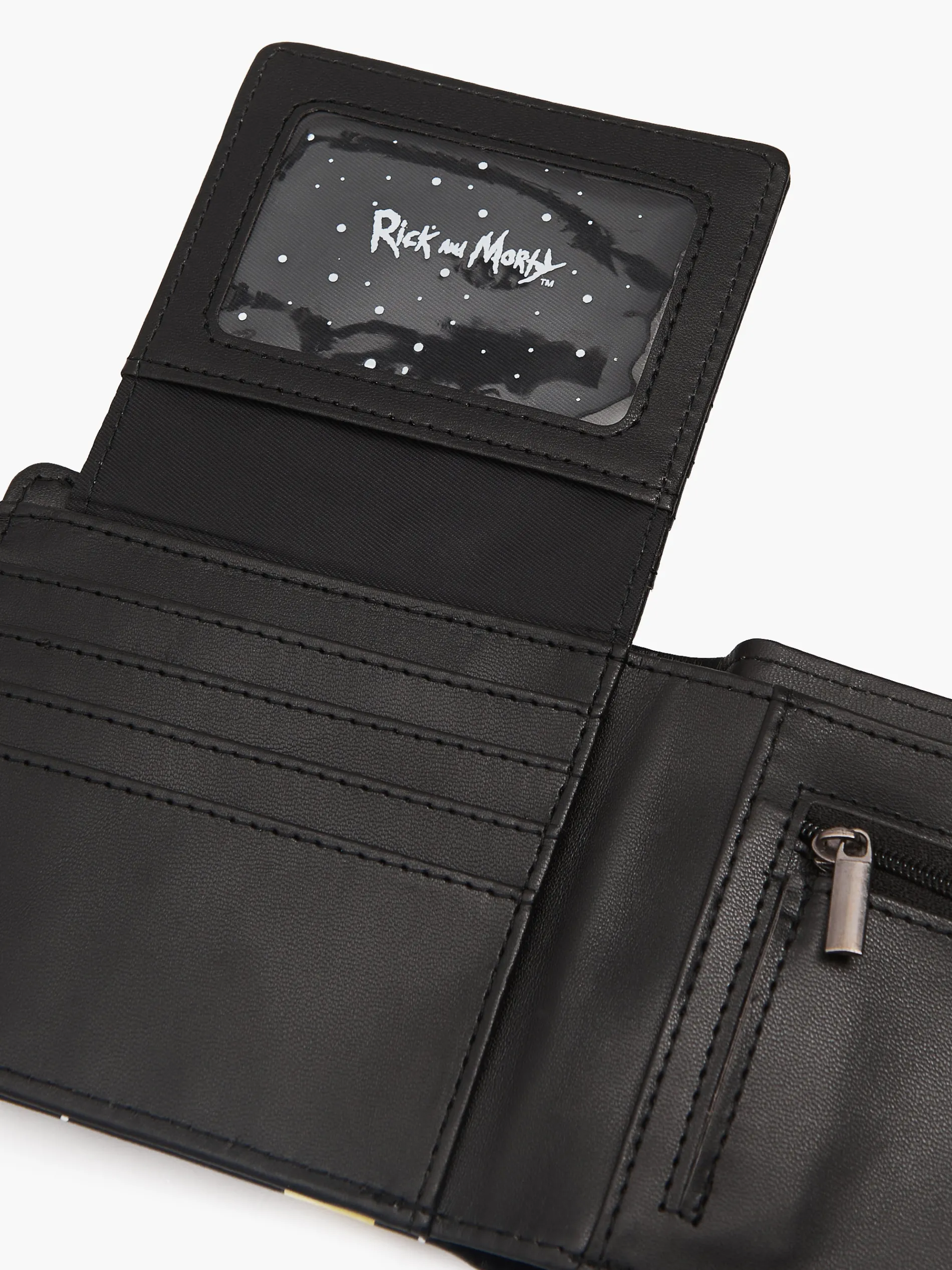 Męski czarny portfel, wykonany z imitacji skóry. kieszonka na monety zapinana na suwak przegródki na bankonty i dokumenty nadruk z serialu Rick and Morty Wymiary produktu: 10,5 x 12 cm RICK AND MORTY © CARTOON NETWORK