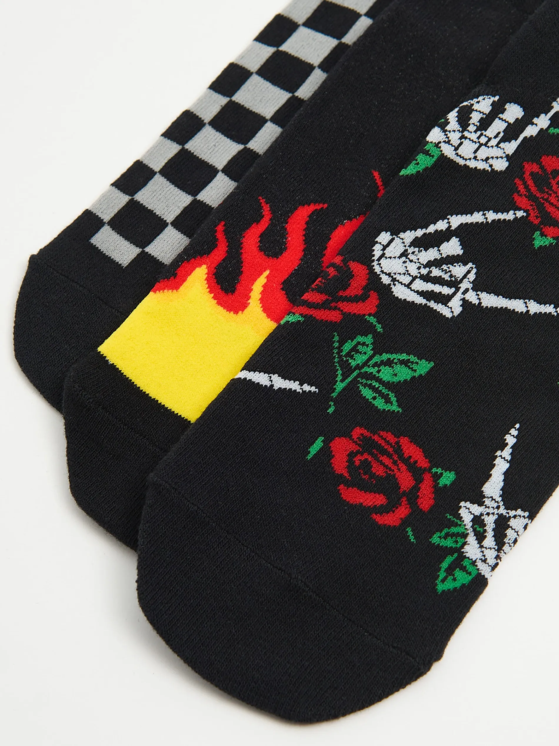 Zestaw 3 par męskich skarpet w czarnym kolorze o krótszym kroju. Oryginalne nadruki dopełnią Twoją stylizację! dzianina z dodatkiem elastycznych włókien krótki krój oryginalny print nadruki z imitacją płomieni, szachownicą i punkowym motywem kwiatowym
