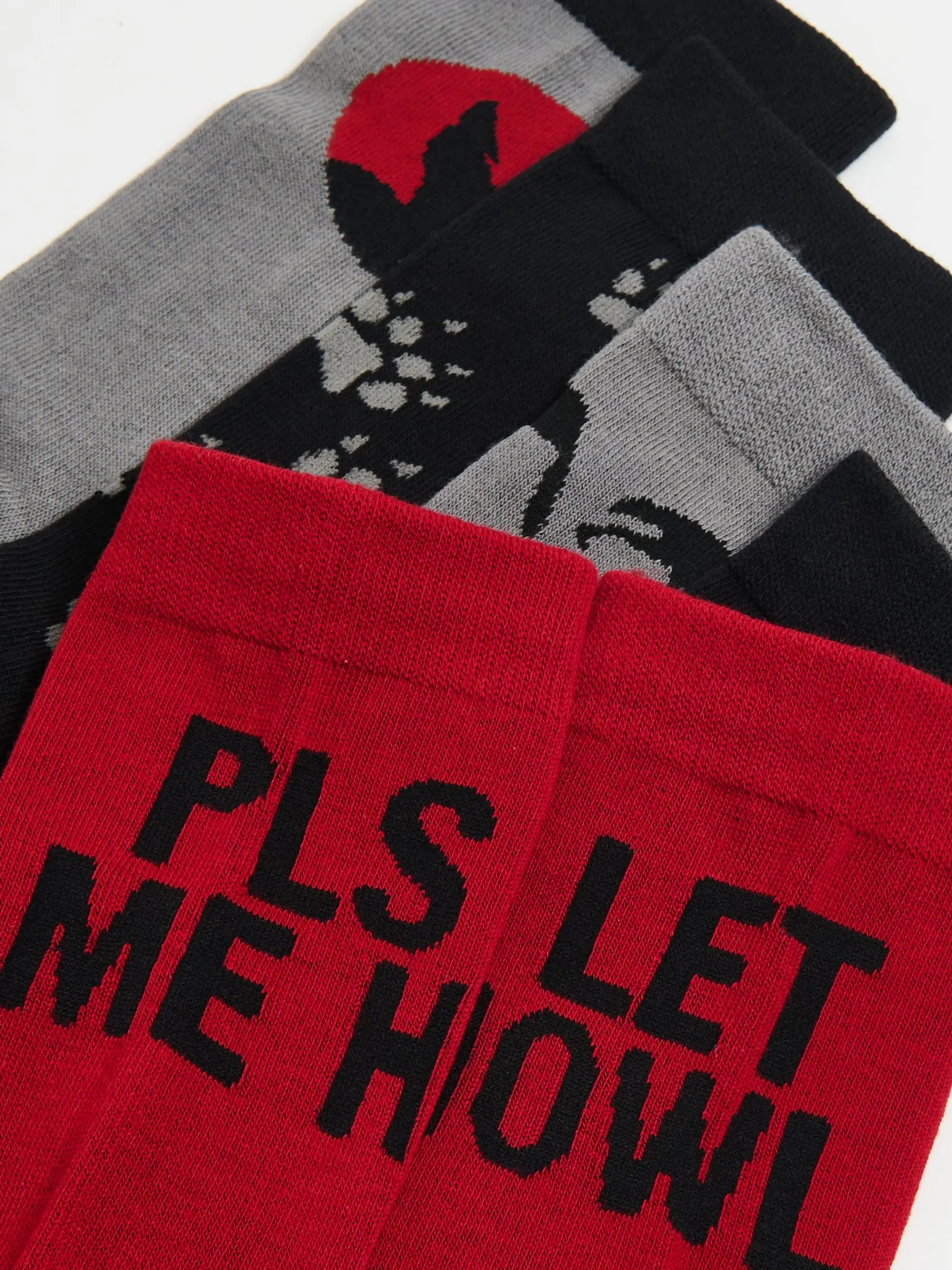 Zestaw pięciu par długich, męskich skarpet uszytych z mieszanki dzianin w kolorach czarnym, szarym i czerwonym. Na każdej z par nadruki z motywem wilka i brandowe napisy. dzianina z dodatkiem elastycznych włókien dłuższy, prosty krój zwierzęcy wzór