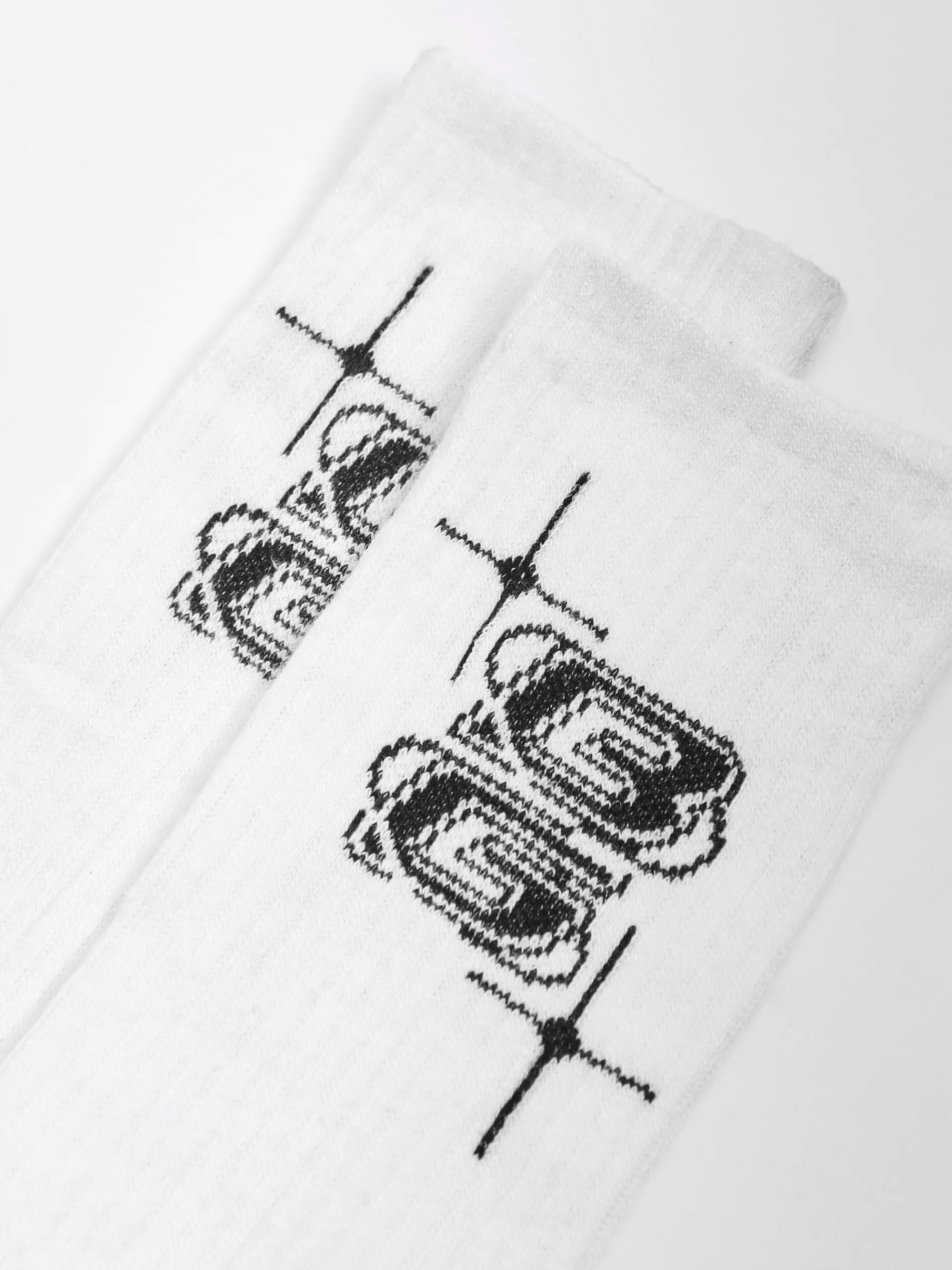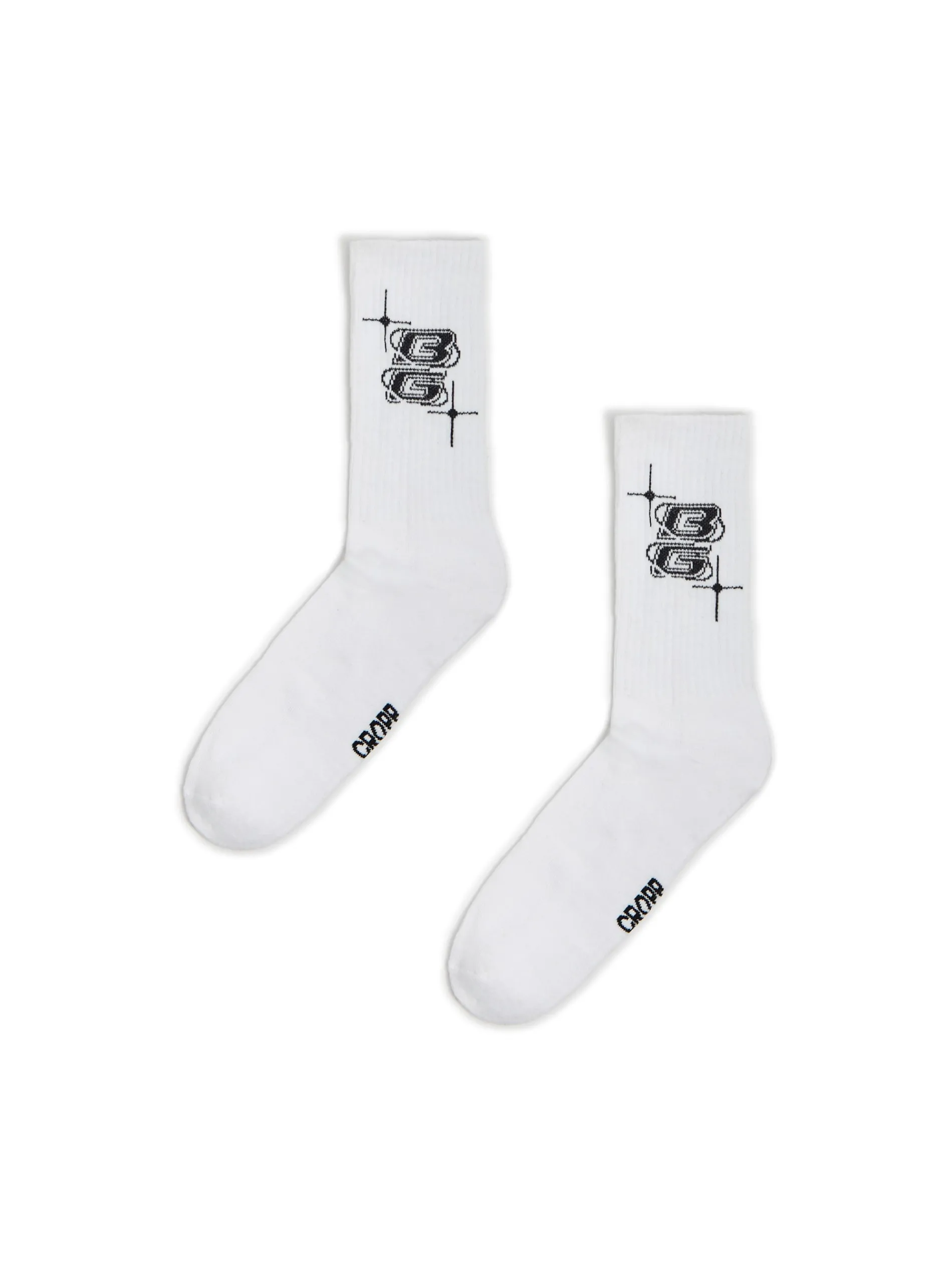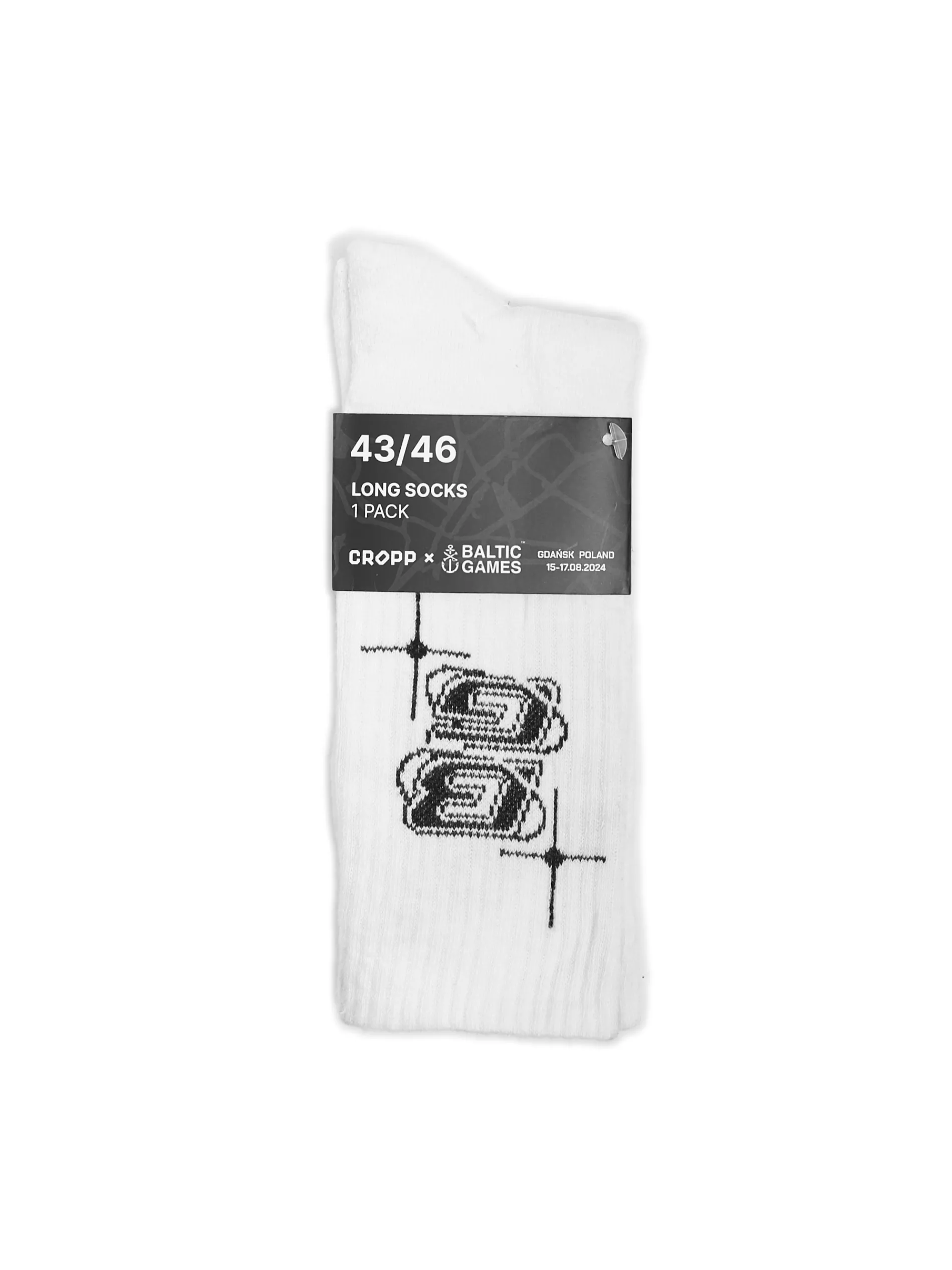 Męskie skarpety o długim fasonie, uszyte z białej dzianiny o wysokiej zawartości bawełny. Ozdobione logo Baltic Games.