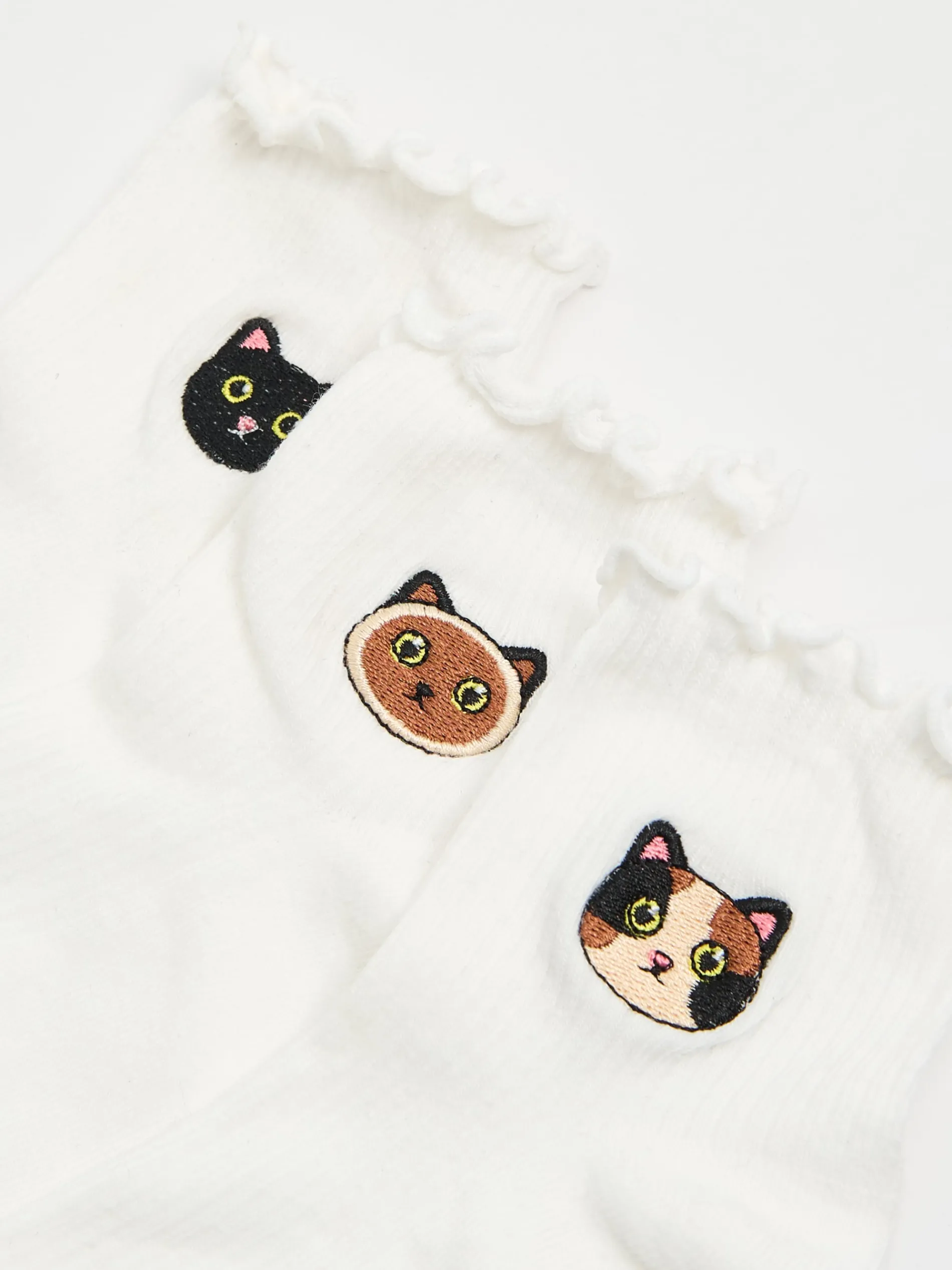 Trójpak damskich skarpetek o średniej długości, uszytych z dzianiny o wysokiej zawartości bawełny, wykończonych falbanką. Na każdej parze haft z uroczym kotkiem!