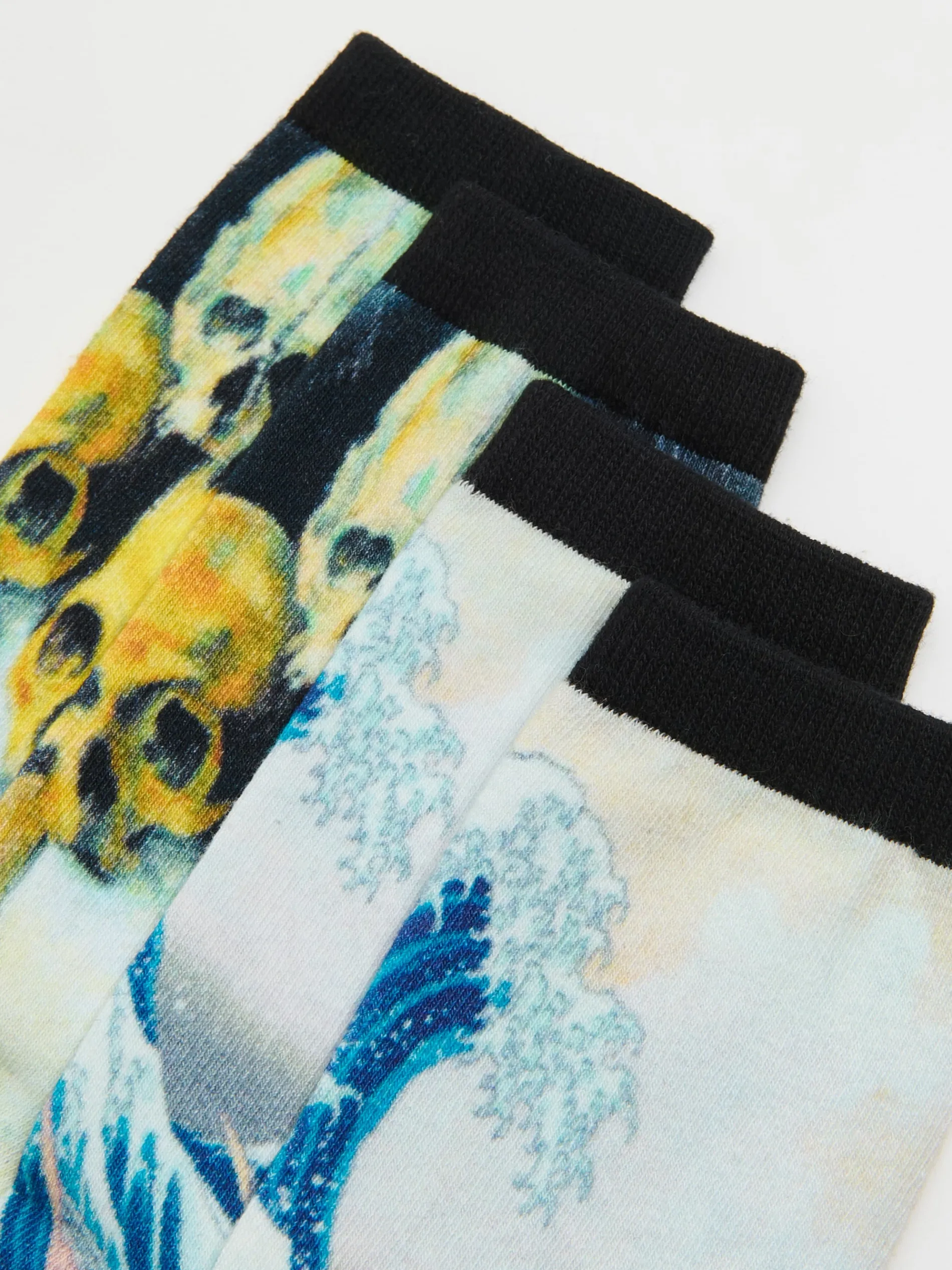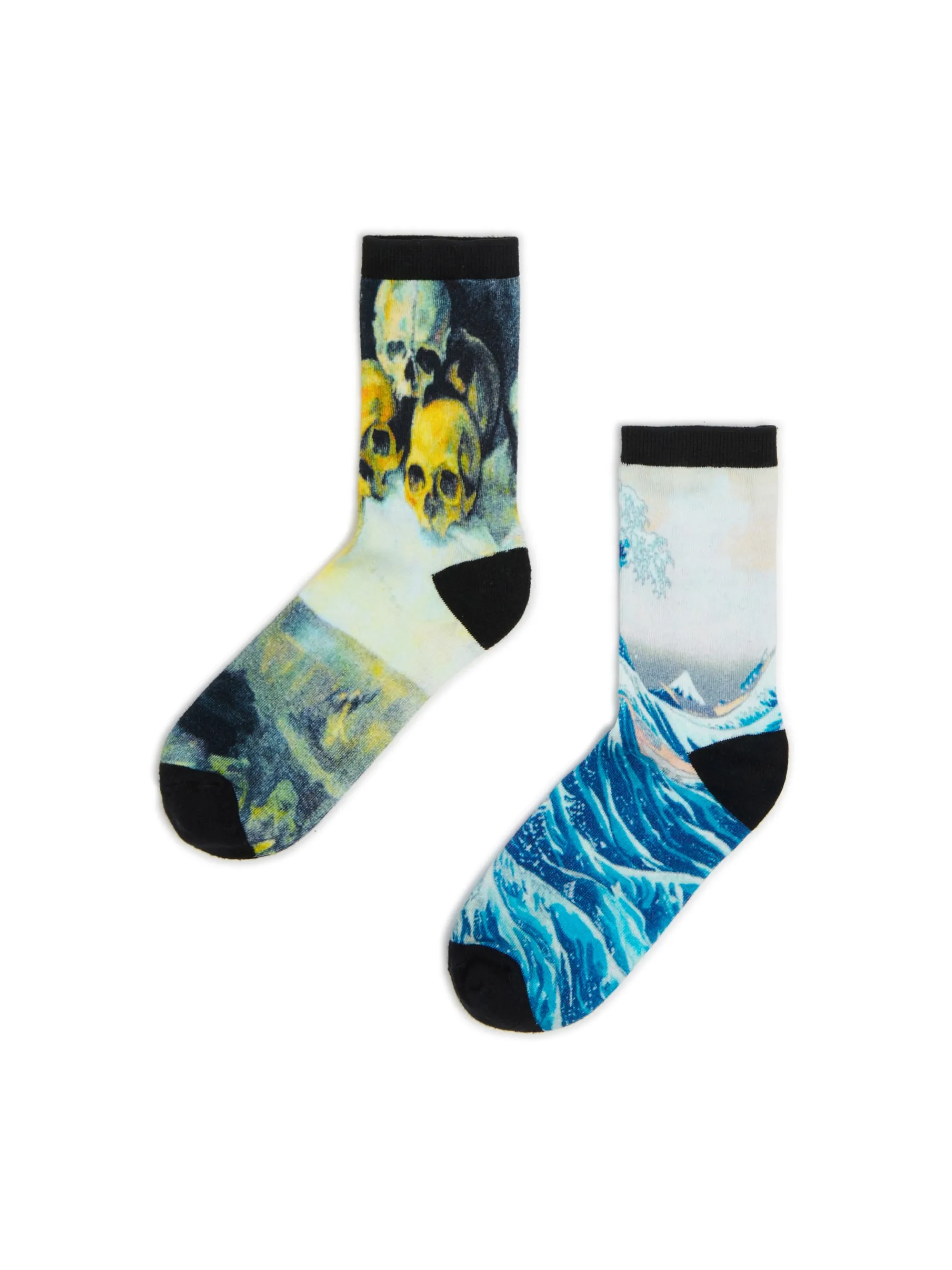 Te arcydzieła możesz mieć w swojej kolekcji. Zestaw dwóch par damskich długich skarpet uszytych z mieszanki dzianin z dodatkiem wysokiej jakości bawełny. Na każdym secie nadruki inspirowane pracami wybitnych malarzy. W tym pakiecie: „Piramida czaszek” Paula Cézanne’a „Wielka fala w Kanagawie” Hokusaia Katsushika