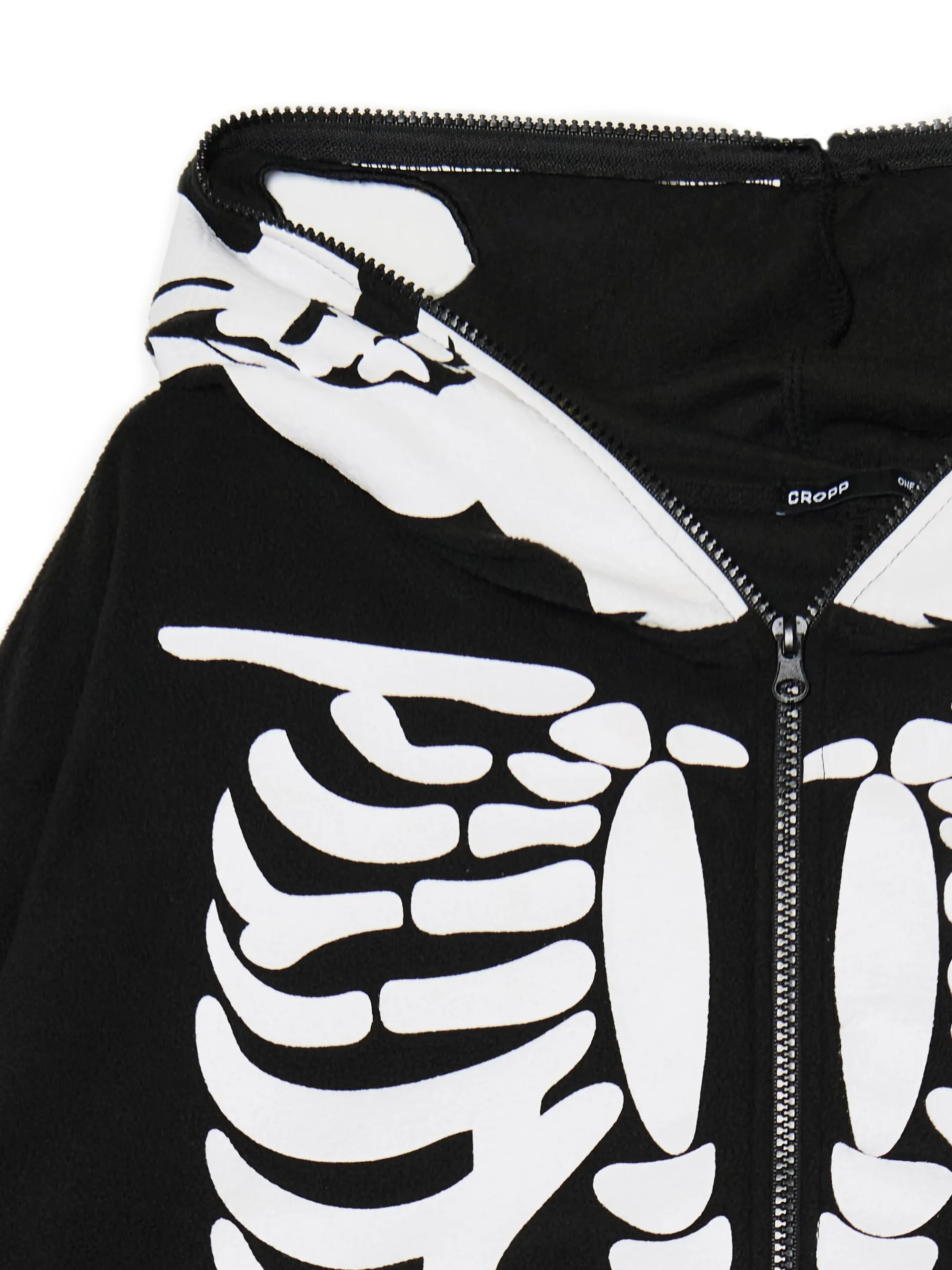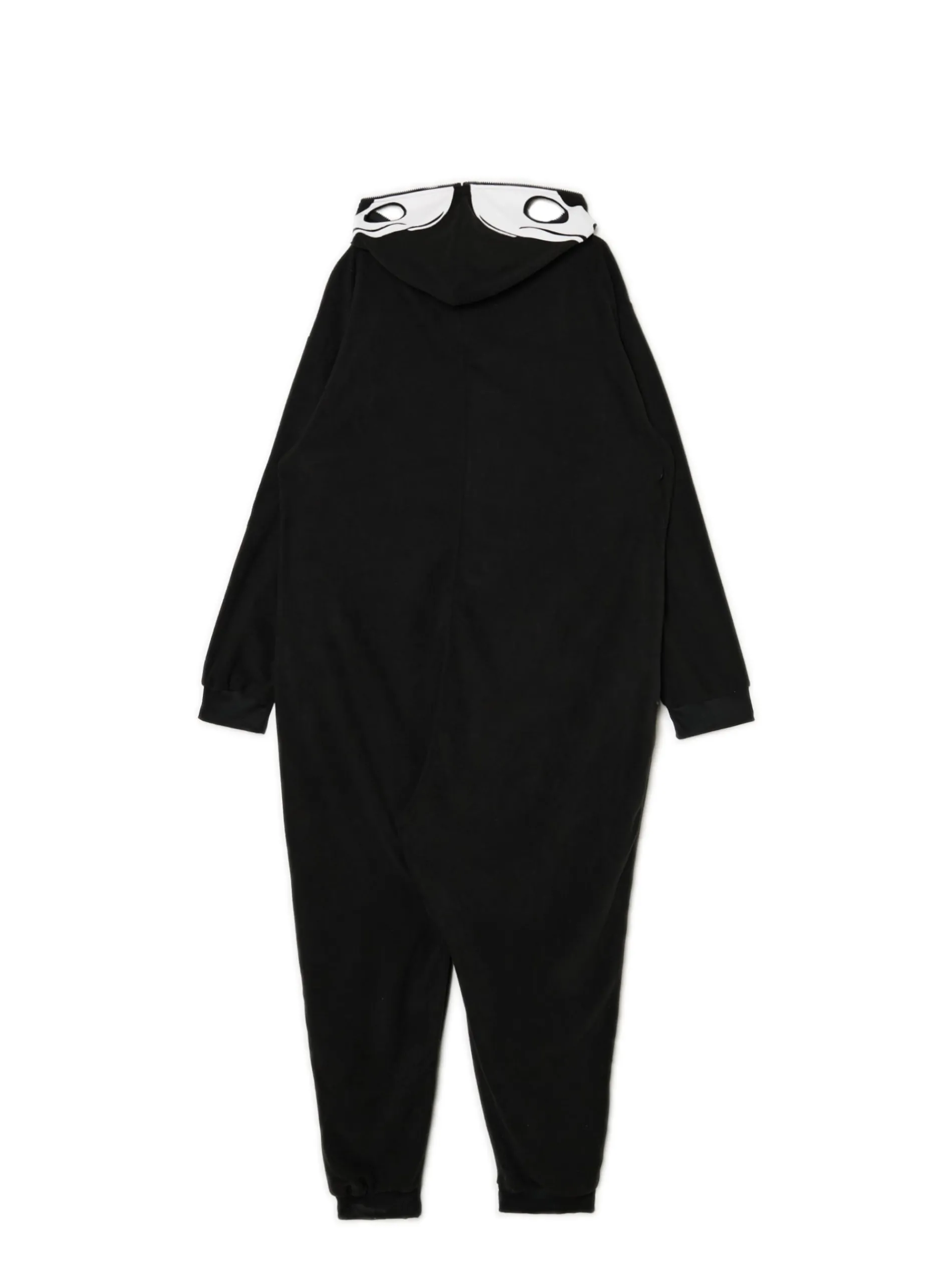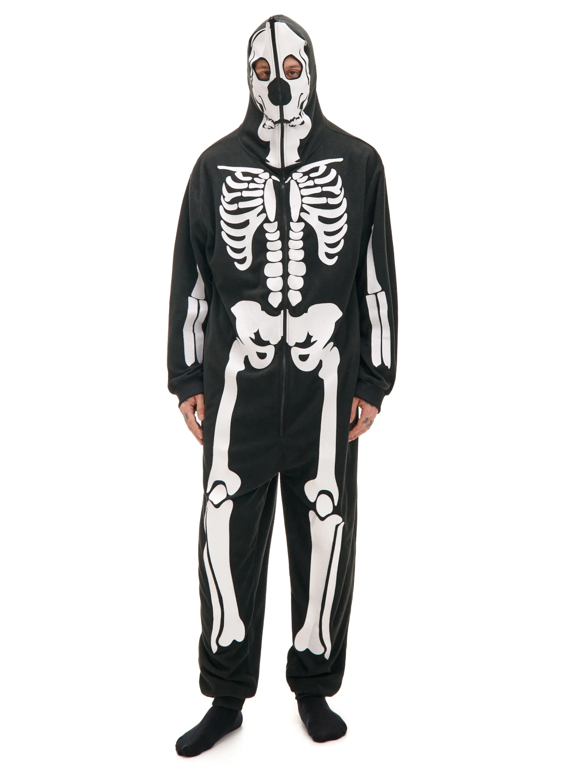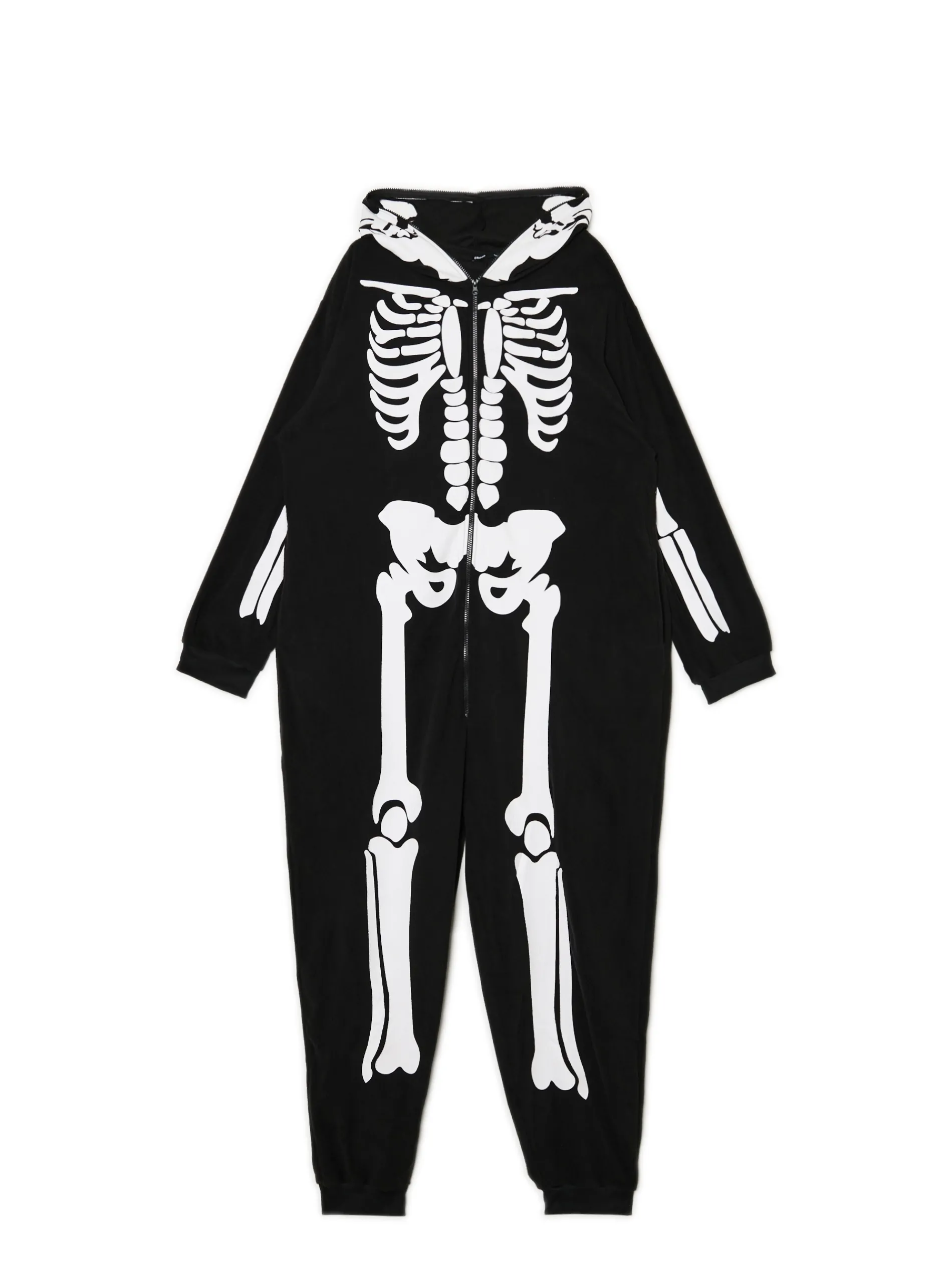 Piżama męska typu onesie uszyta z trwałej i miękkiej w dotyku dzianiny w czarnym kolorze. Na całej powierzchni kontrastowy motyw kościotrupa. Idealne przebranie na Halloween i wieczory filmowe z kinem grozy. swobodny, luźny krój zapięcie na zamek na całej długości dół i mankiety wykończone ściągaczami miękki kaptur zapinany na zamek praktyczne wycięcie na oczy nadruk z motywem Halloween
