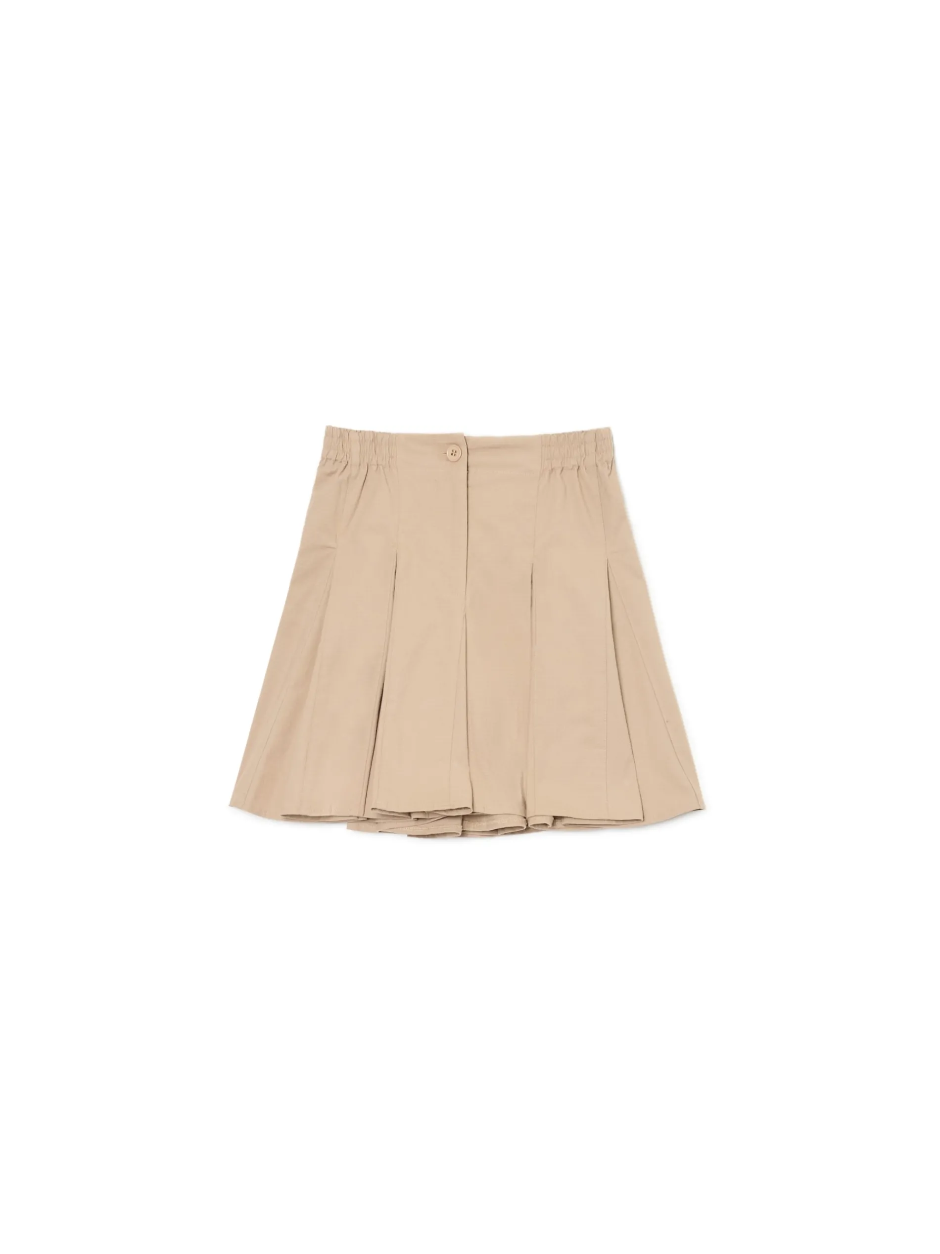 Damska spódnica o długości mini, uszyta z materiału o dużej zawartości bawełny w kolorze beżowym. Wyjątkowy model z dodatkowymi wstawkami dla zwiększenia komfortu ruchu. dzianinowy materiał z bawełną długość mini zapięcie na zamek i guzik w pasie od wewnątrz wszyta gumka
