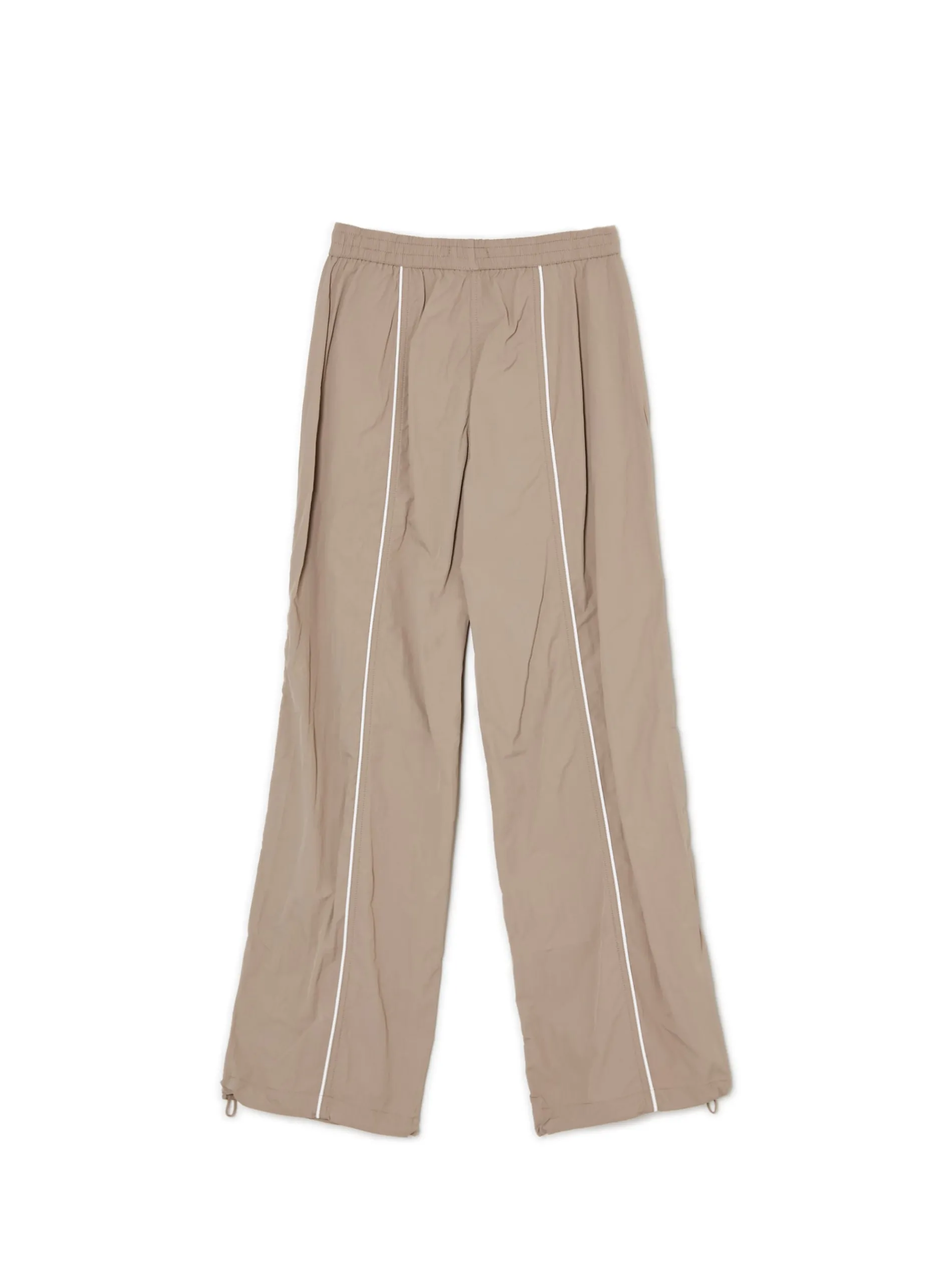 Damskie spodnie typu jogger z beżowej, trwałej tkaniny. Dodatkowo 2 kieszenie, ściągacze przy nogawkach ze stoperami i ozdobne lampasy. Wzrost modelki: 177 cm