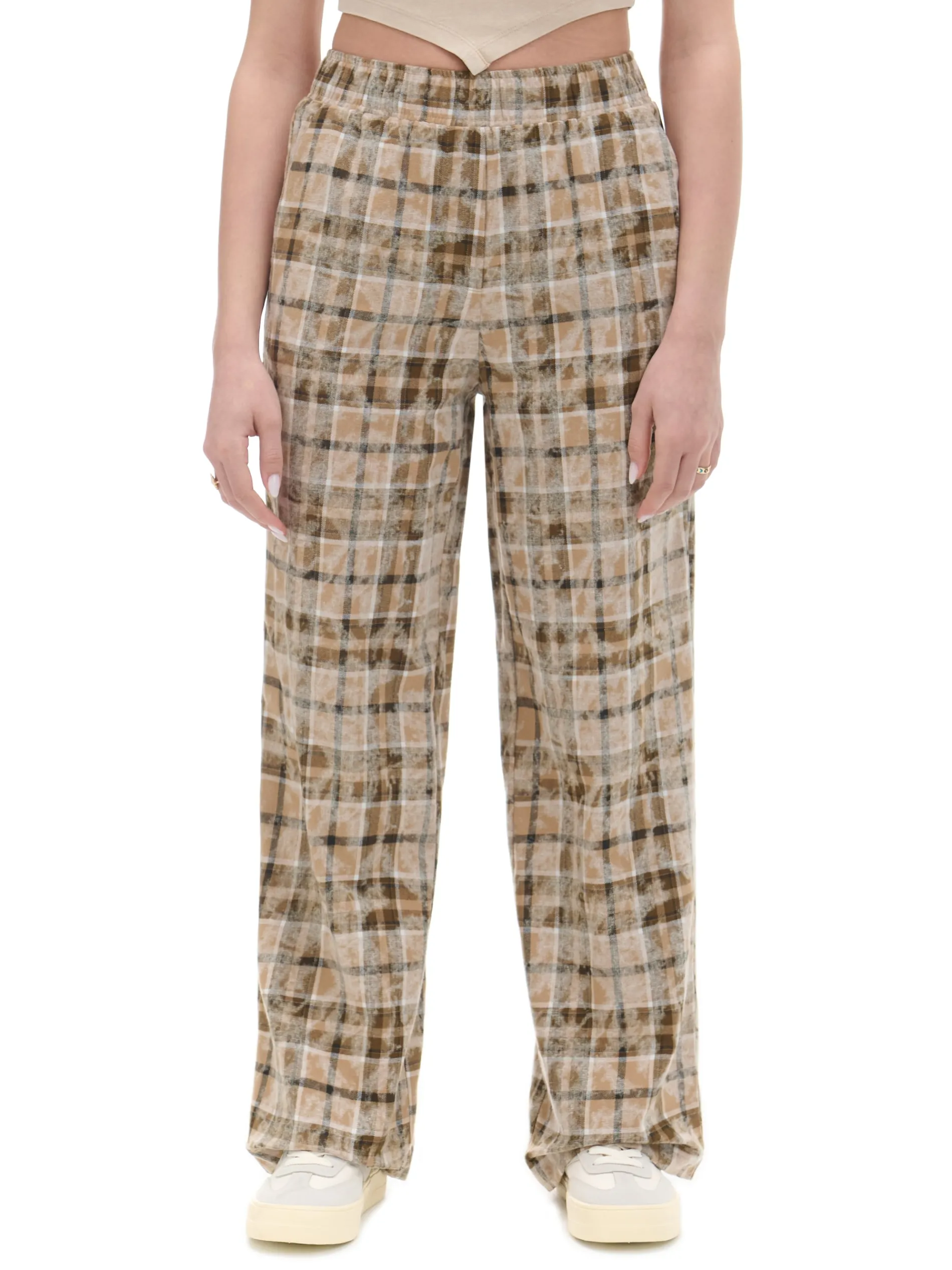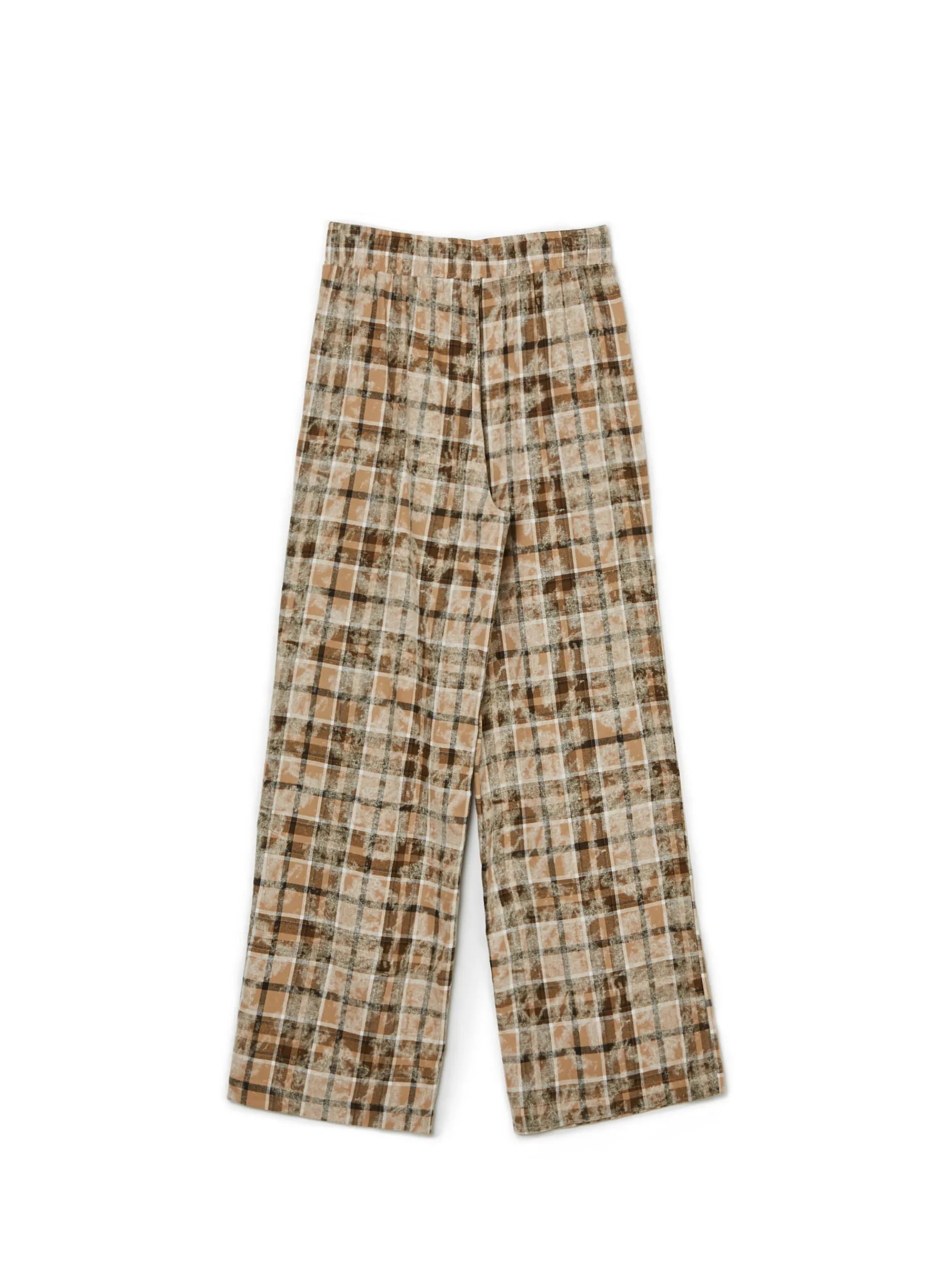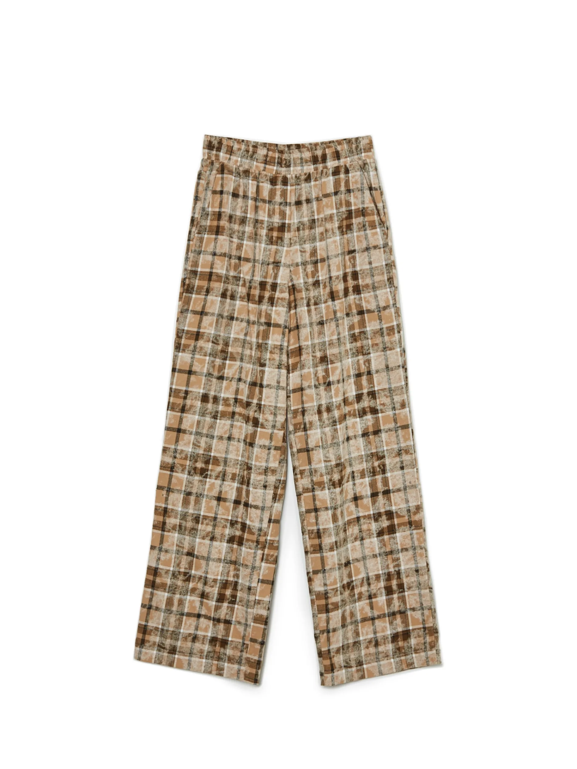 Damskie spodnie, uszyte z tkaniny o stuprocentowej zawartości bawełny. Idealna propozycja dla fanek nietypowych wzorów! średni stan w pasie elastyczna gumka dwie kieszenie imitacja rozporka na całości ciekawy nadruk w kratę Wzrost modelki: 170 cm