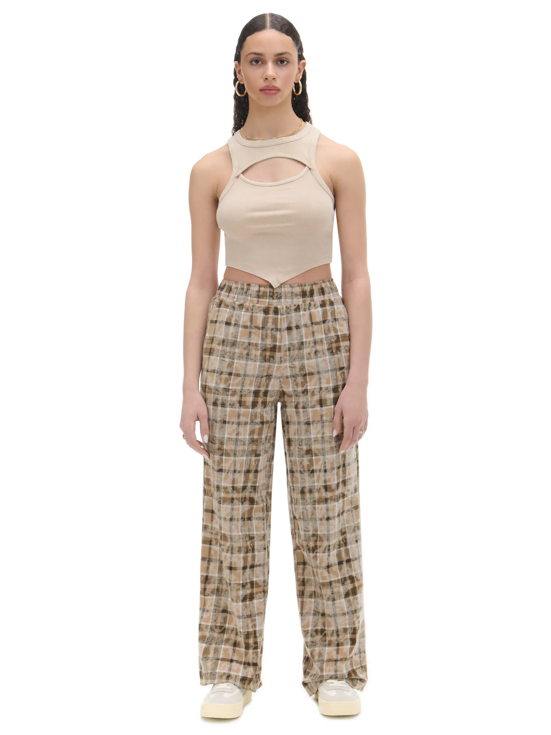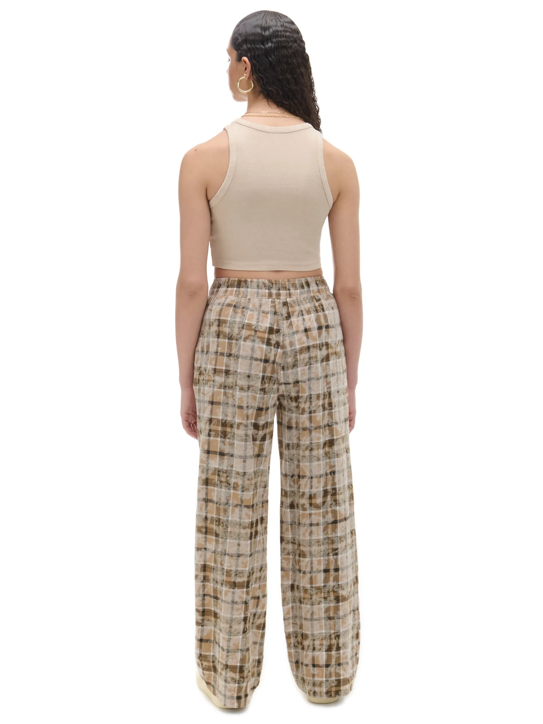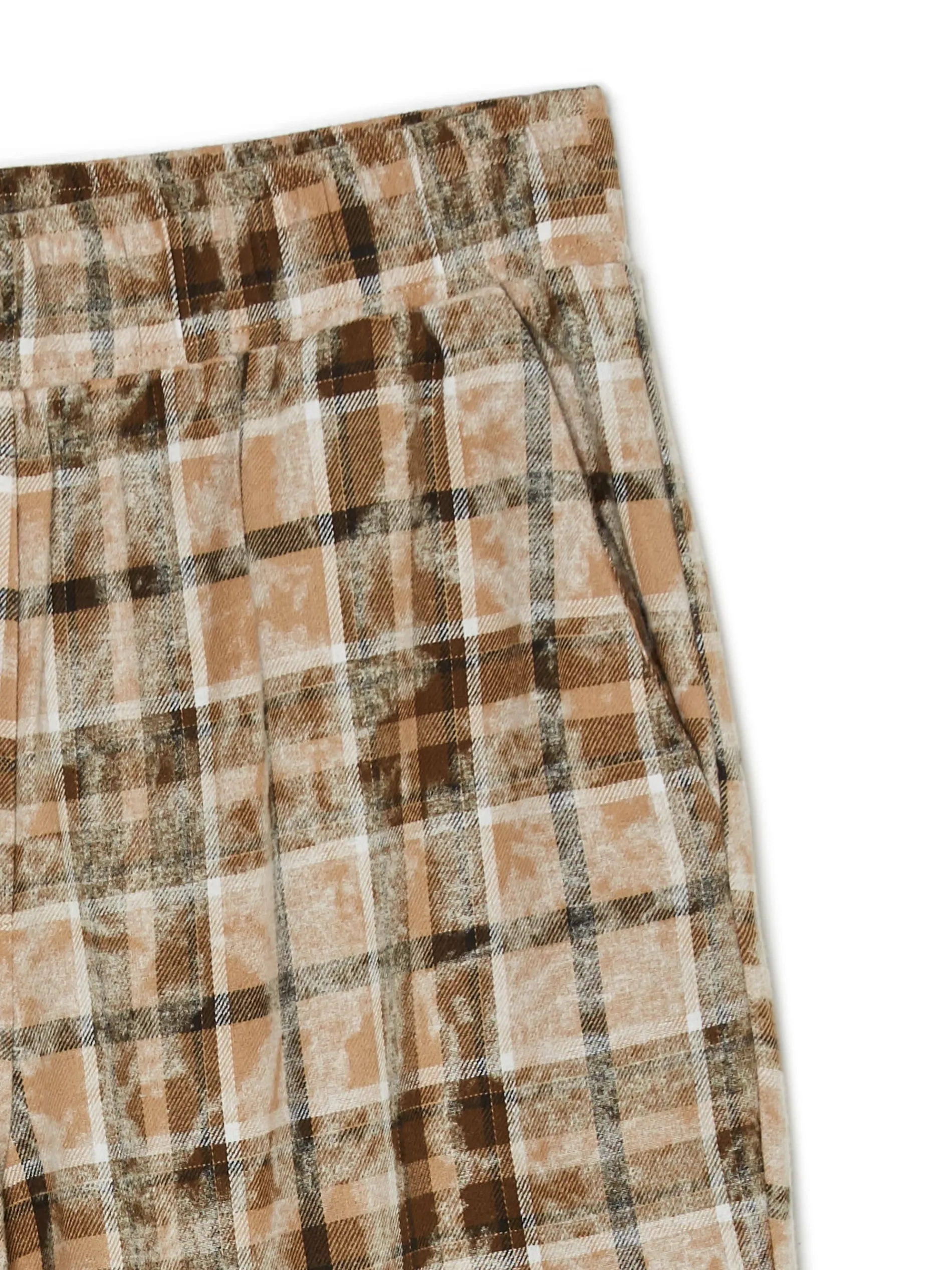 Damskie spodnie, uszyte z tkaniny o stuprocentowej zawartości bawełny. Idealna propozycja dla fanek nietypowych wzorów! średni stan w pasie elastyczna gumka dwie kieszenie imitacja rozporka na całości ciekawy nadruk w kratę Wzrost modelki: 170 cm