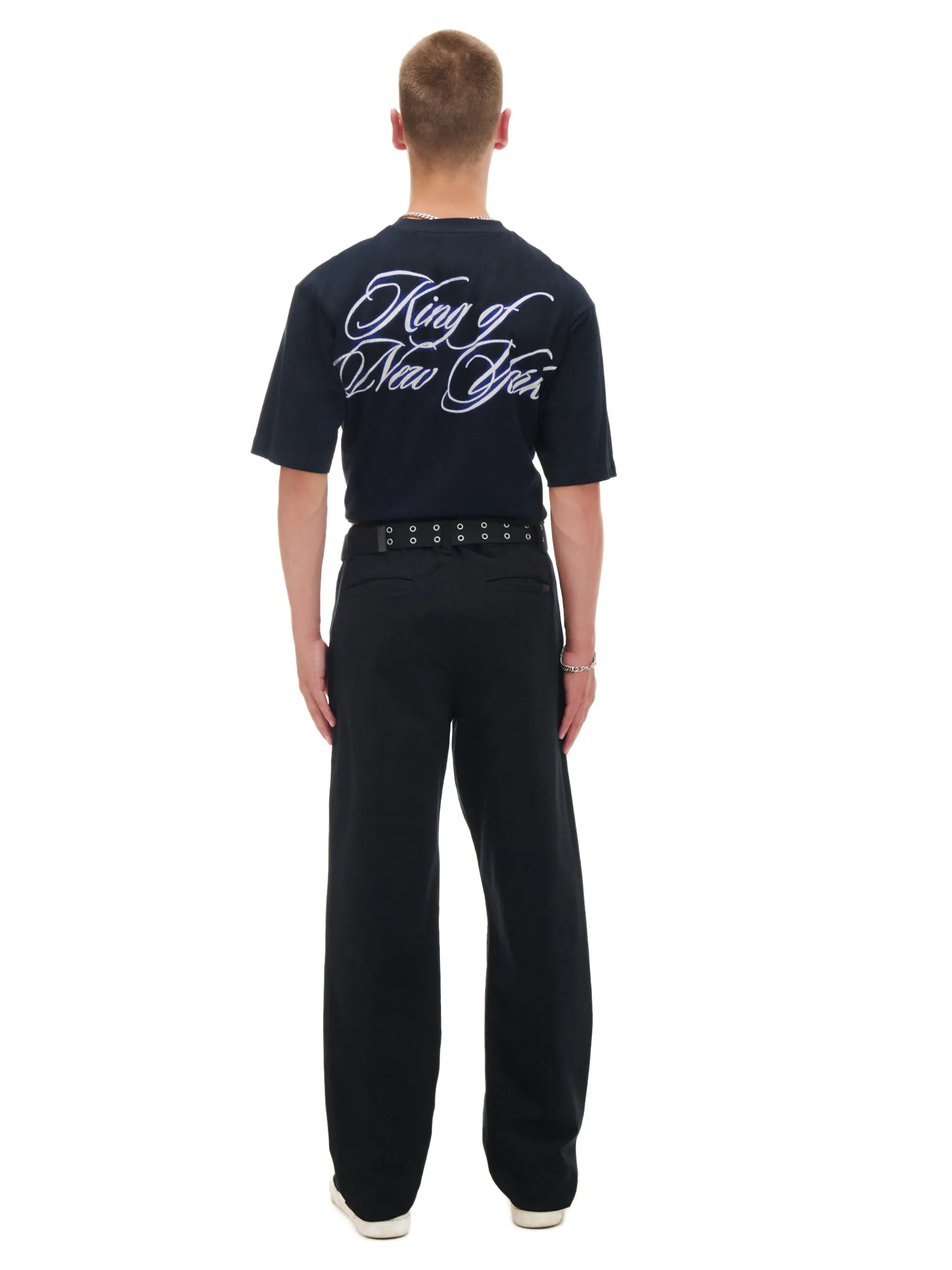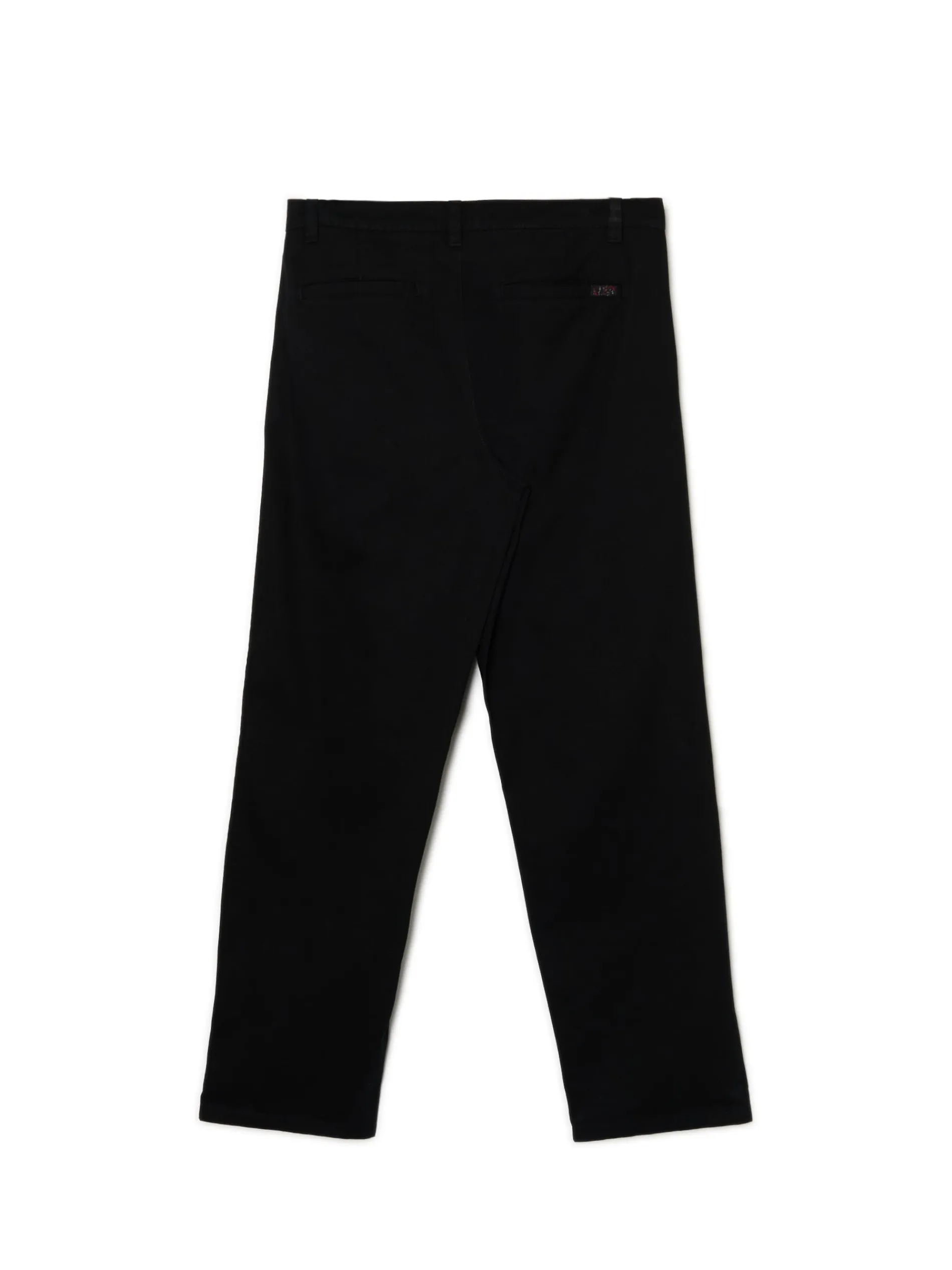 Męskie dzianinowe spodnie o luźnym kroju, uszyte z bawełnianego materiału. Klasyk, który warto mieć awaryjnie w swojej szafie. 100% bawełny swobodny, luźny krój zapięcie na suwak i guzik otwarte kieszenie po bokach listewkowe kieszenie z tyłu dodatkowa gumowa pętelka przy kieszeni szlufki na pasek zakładki z przodu Wzrost modela: 185 cm