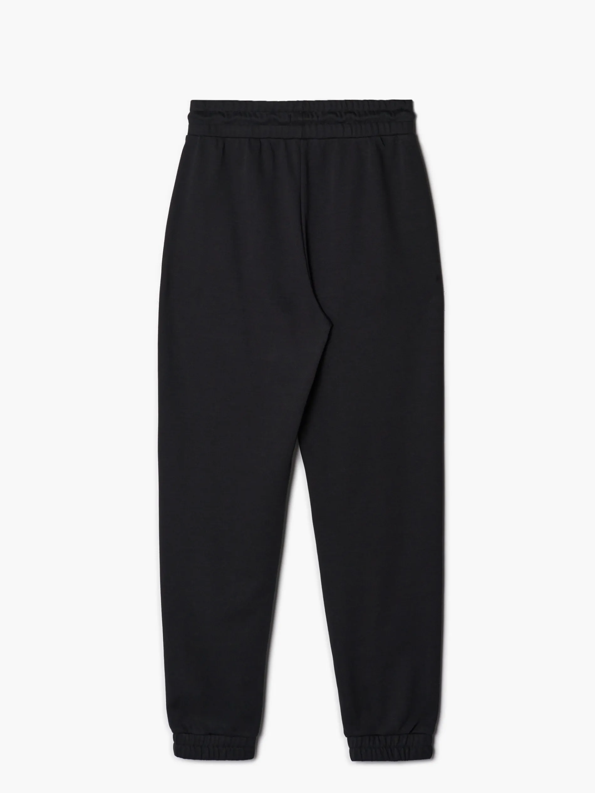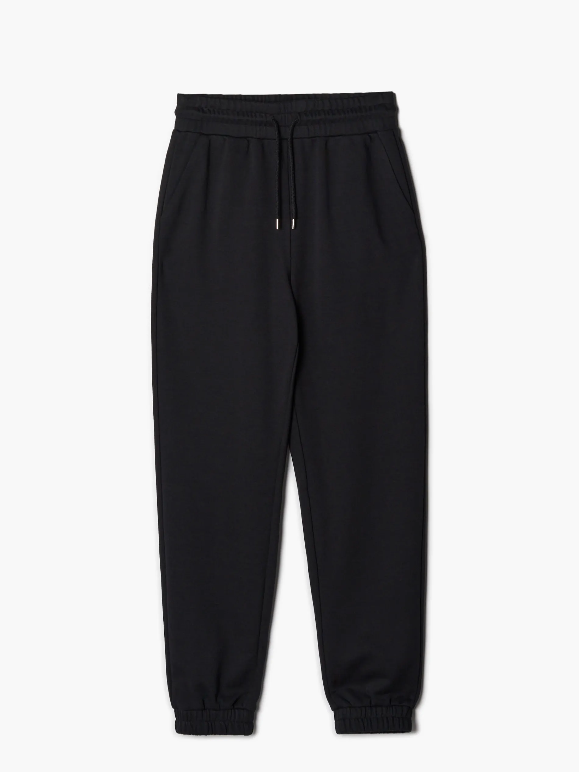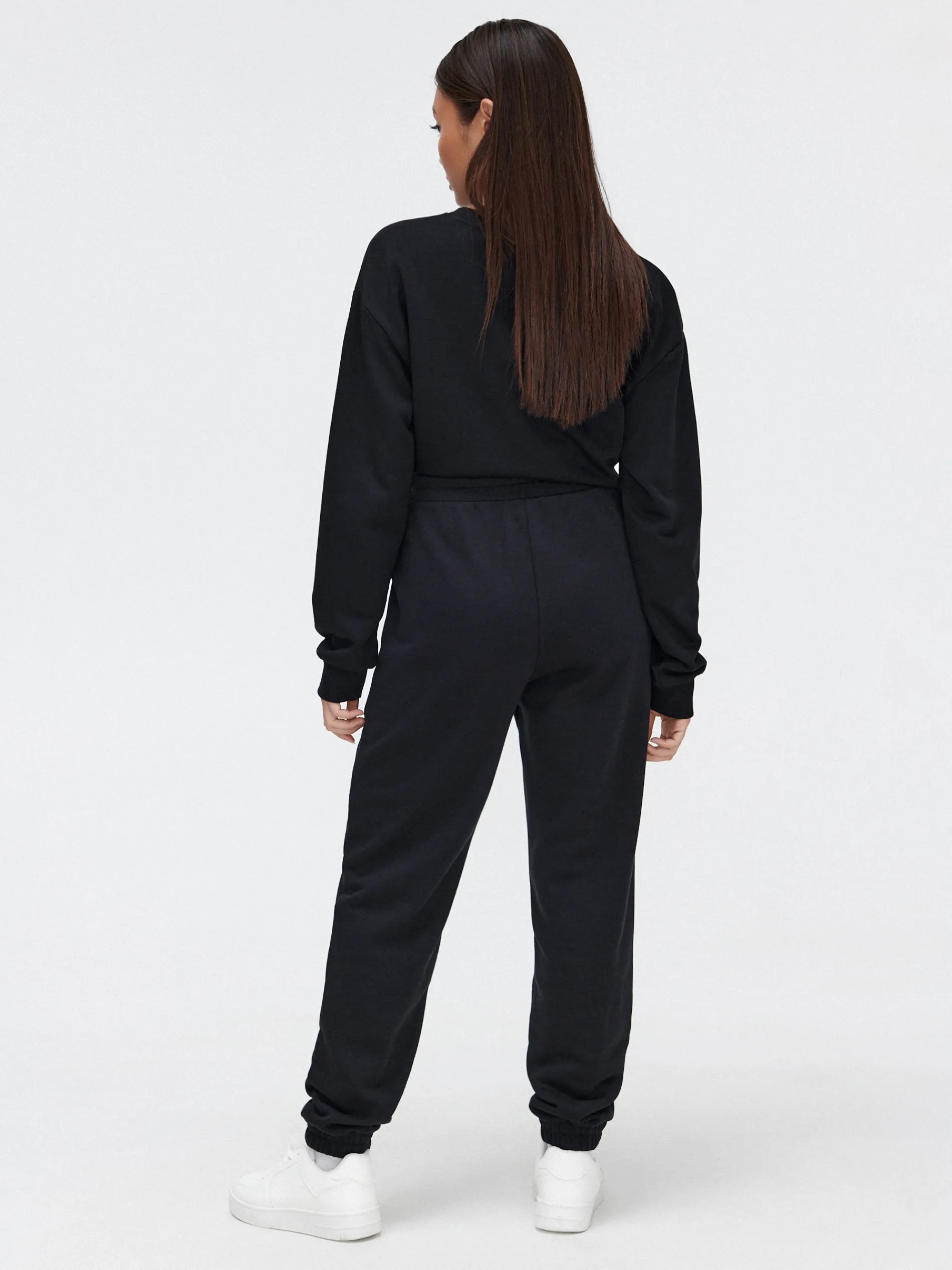 Damskie spodnie dresowe w kolorze czarnym, uszyte z dzianiny o wysokiej zawartości bawełny. krój jogger w pasie gumka i sznurek do regulacji kieszenie boczne nogawka ze ściągaczem spodnie tworzą zestaw z bluzą w tym samym kolorze dostępne inne warianty kolorystyczne Modelka ze zdjęcia ma na sobie rozmiar: S Wzrost modelki: 178 cm