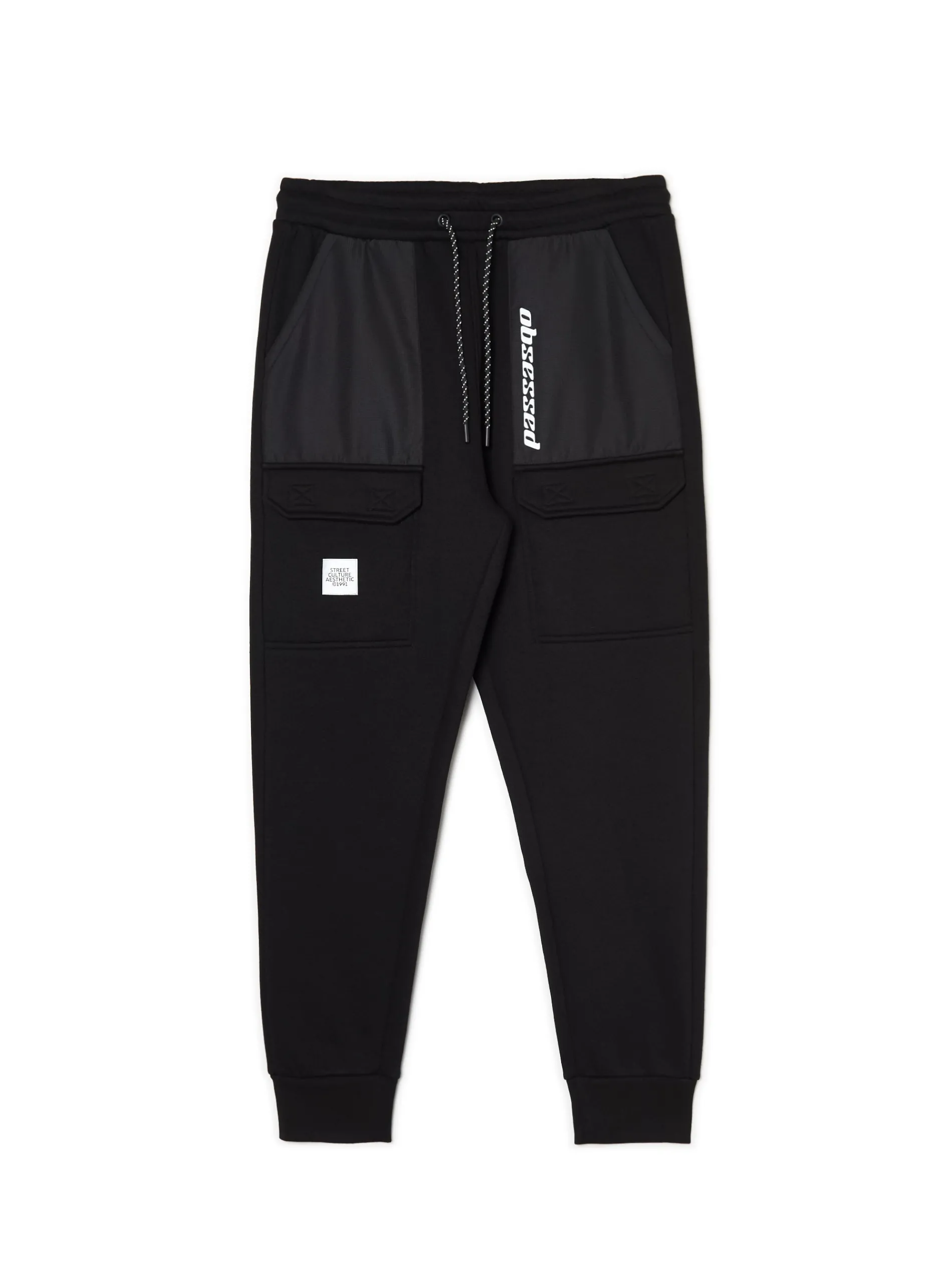 Dresowe spodnie męskie typu jogger, uszyte z mieszanki dzianin z bawełną. w pasie gumka i sznurek do regulacji liczne kieszenie, w tym kieszenie typu cargo nogawka ze ściągaczem i printem z efektem odblaskowym joggery dostępne w innym kolorze