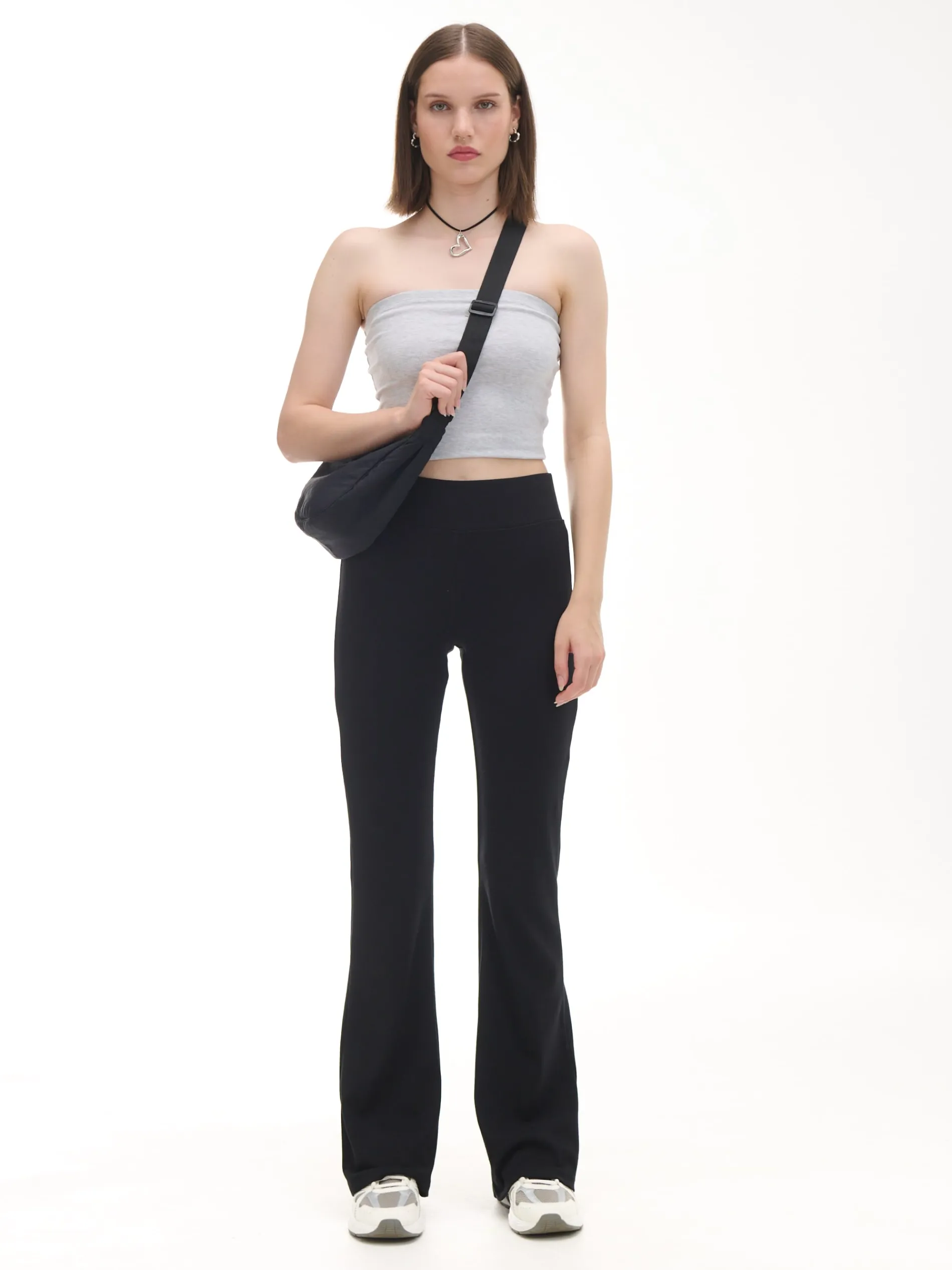 Damskie spodnie dresowe typu flare, uszyte z mieszanki dzianin z bawełną. Elastyczna guma w pasie podkreśli Twoją talię i zapewni komfort podczas każdej aktywności. dzianinowy materiał z bawełną wysoki stan podkreślający talię długie, lekko rozszerzane nogawki Wzrost modelki: 172 cm