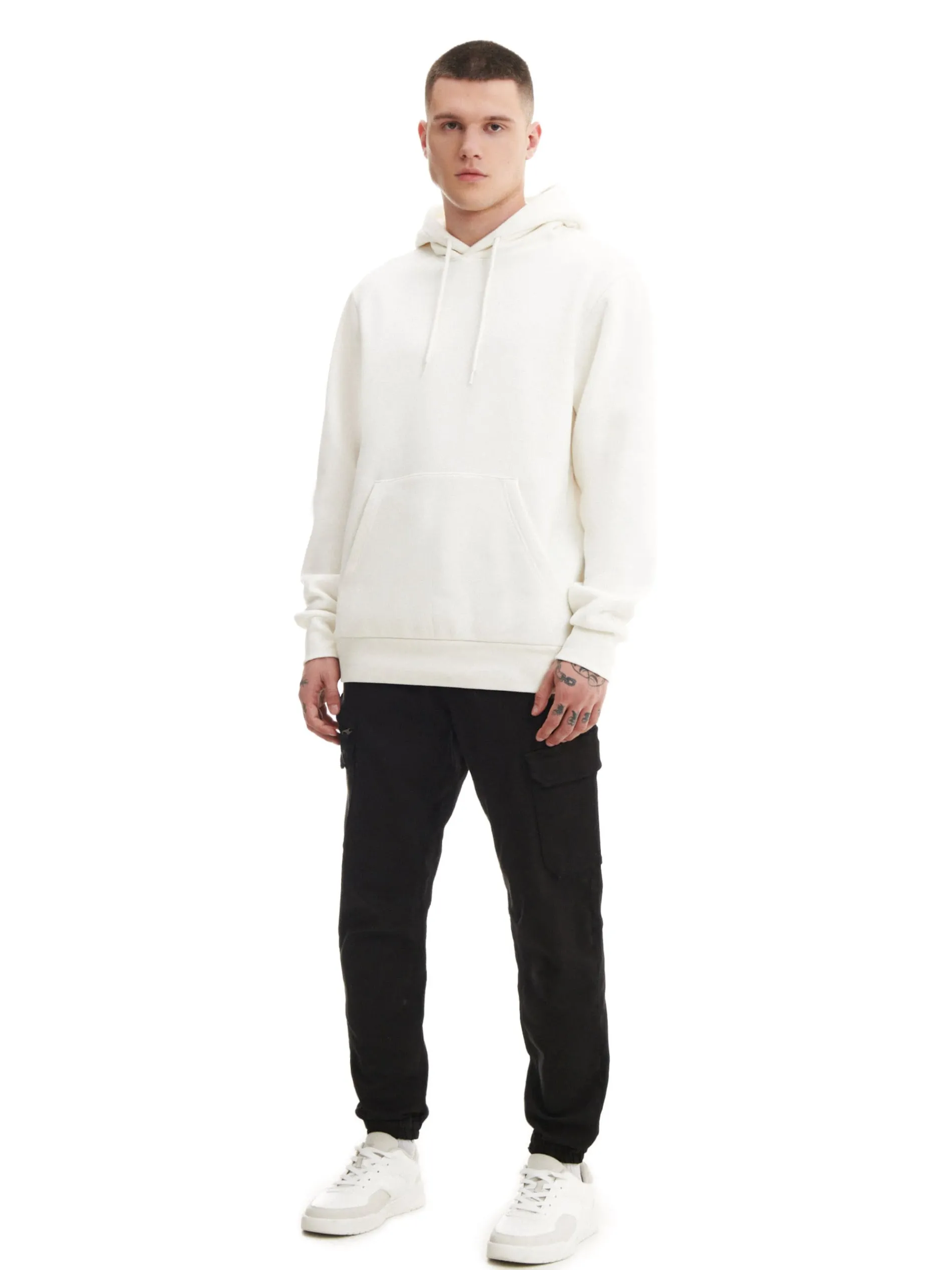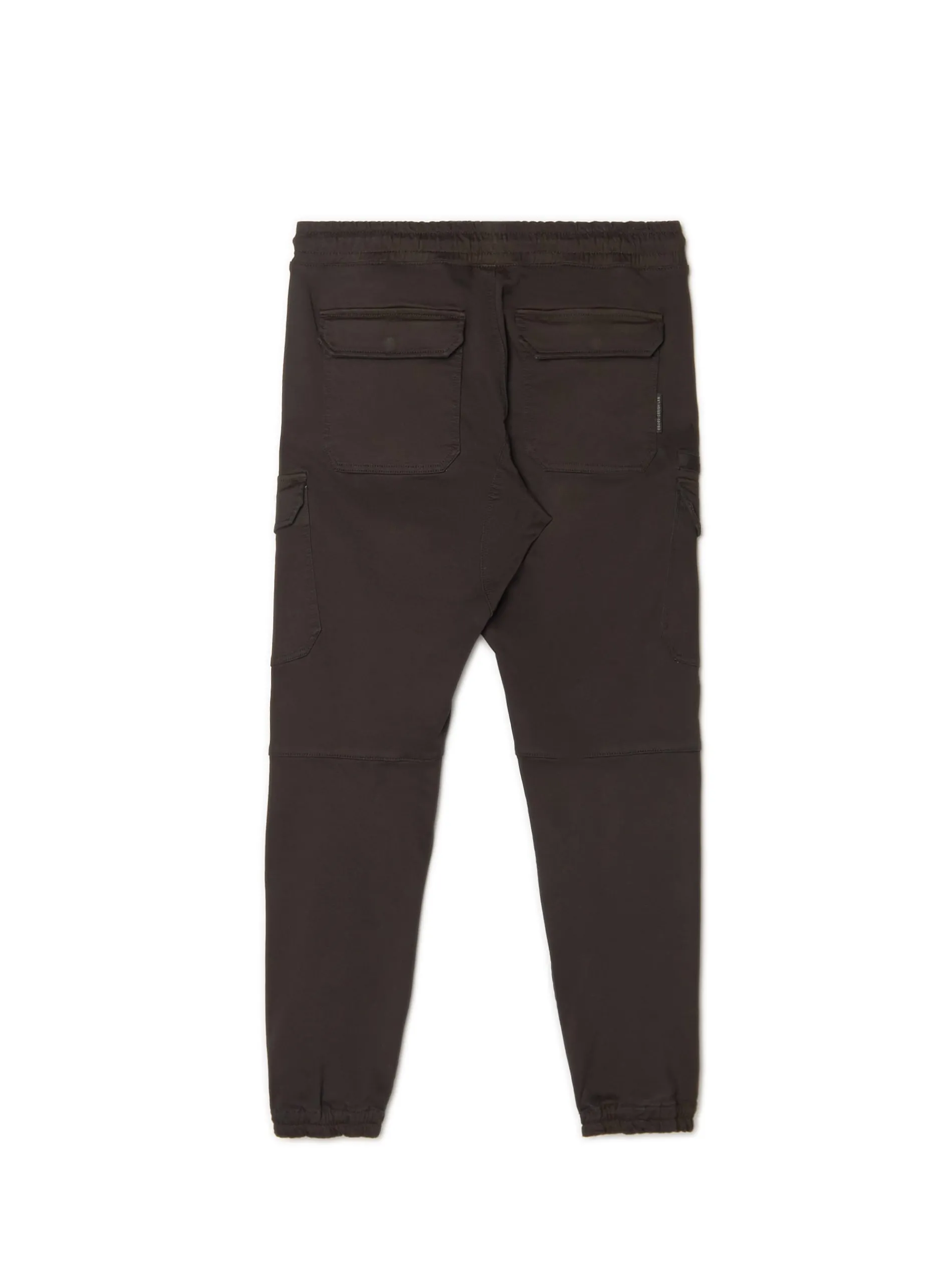 Czarne spodnie męskie o kroju slim jogger, uszyte z tkaniny o wysokiej zawartości bawełny. w pasie gumka i sznurek do regulacji liczne kieszenie, w tym kieszenie typu cargo nogawka ze ściągaczem dostępne inne warianty kolorystyczne Model prezentuje produkt w rozmiarze M/L. Wzrost modela: 185 cm