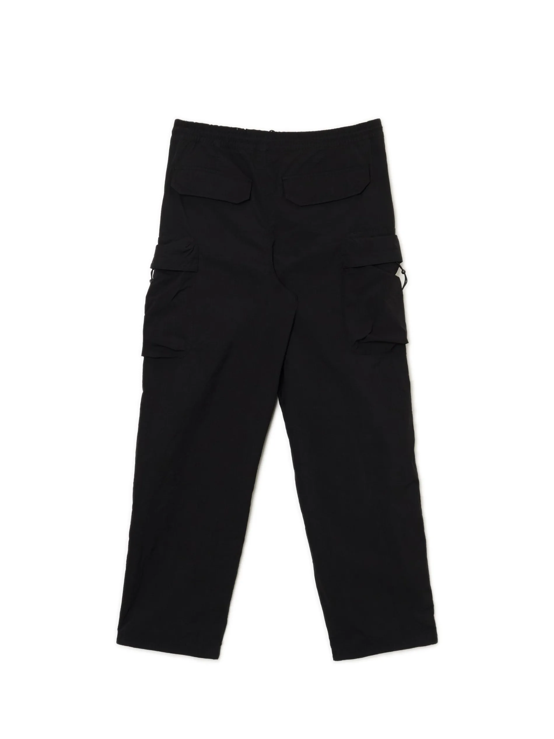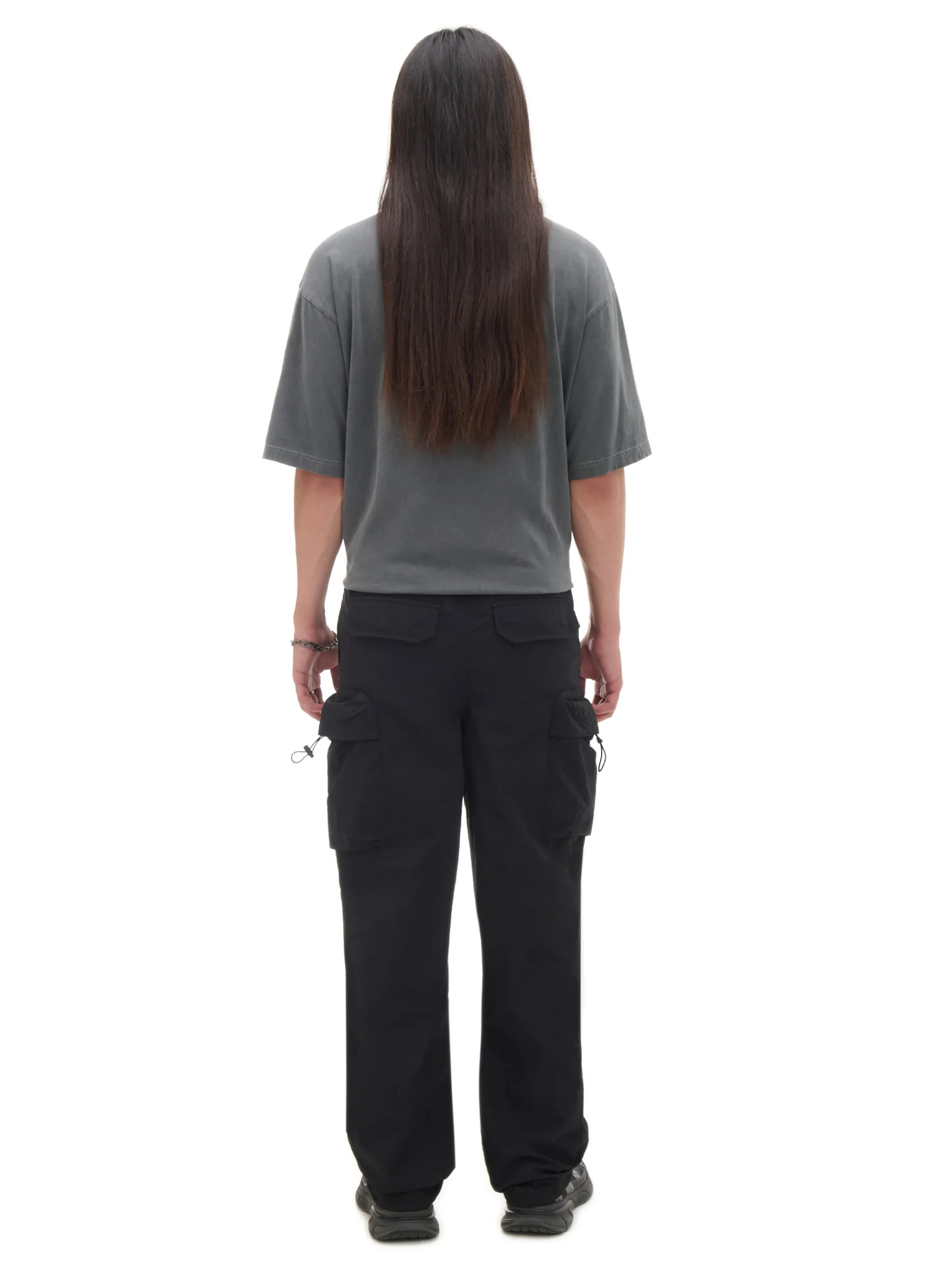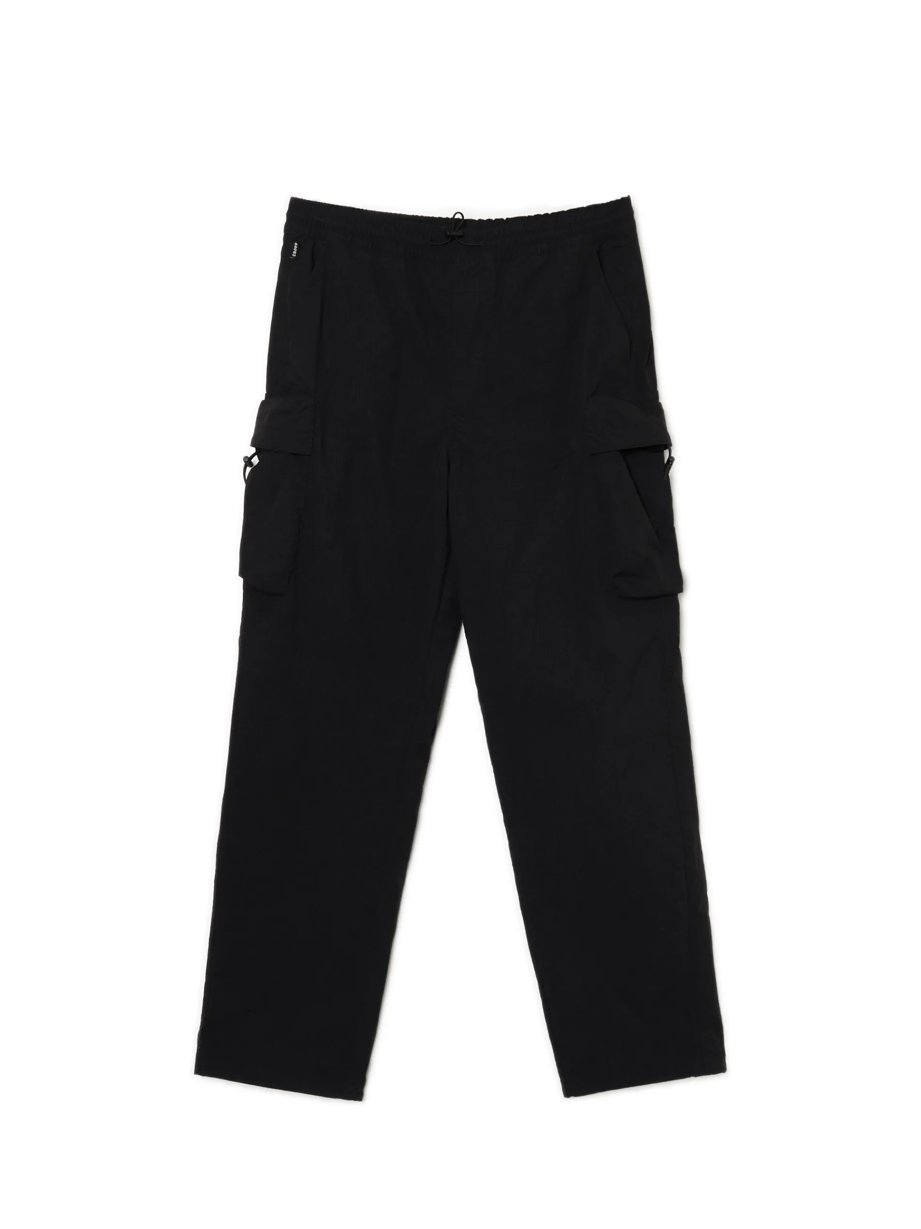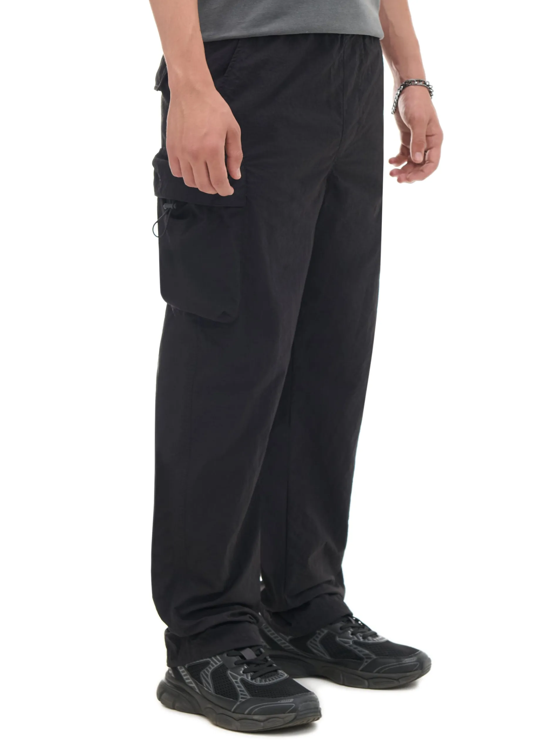 Męskie spodnie o kroju comfort uszyte z gładkiej tkaniny. Wyposażone w 6 praktycznych kieszeni – otwartych i z patkami. Regulacje za pomocą elastycznej gumy ze stoperami w pasie i przy nogawkach zapewniają dopasowanie do sylwetki. wygodny fason comfort długa, luźna nogawka zakończona gumką ze stoperem ściągacz tunelowy ze stoperami w talii dwie kieszenie z patkami i zapięciem na zatrzaski kieszenie z patkami na udach regulacja kieszeni za pomocą elastycznej gumki ze stoperem skośne kieszenie z przodu