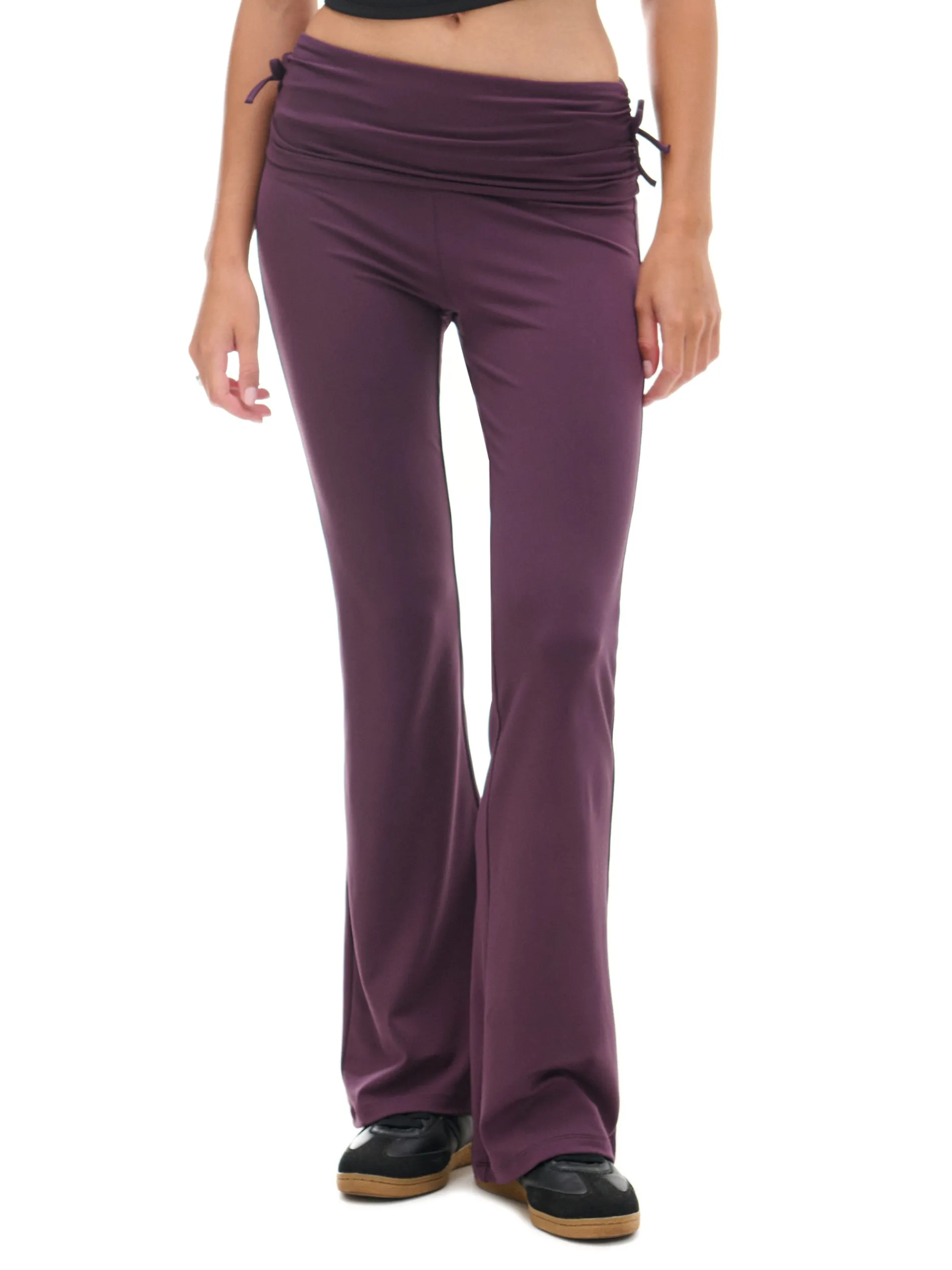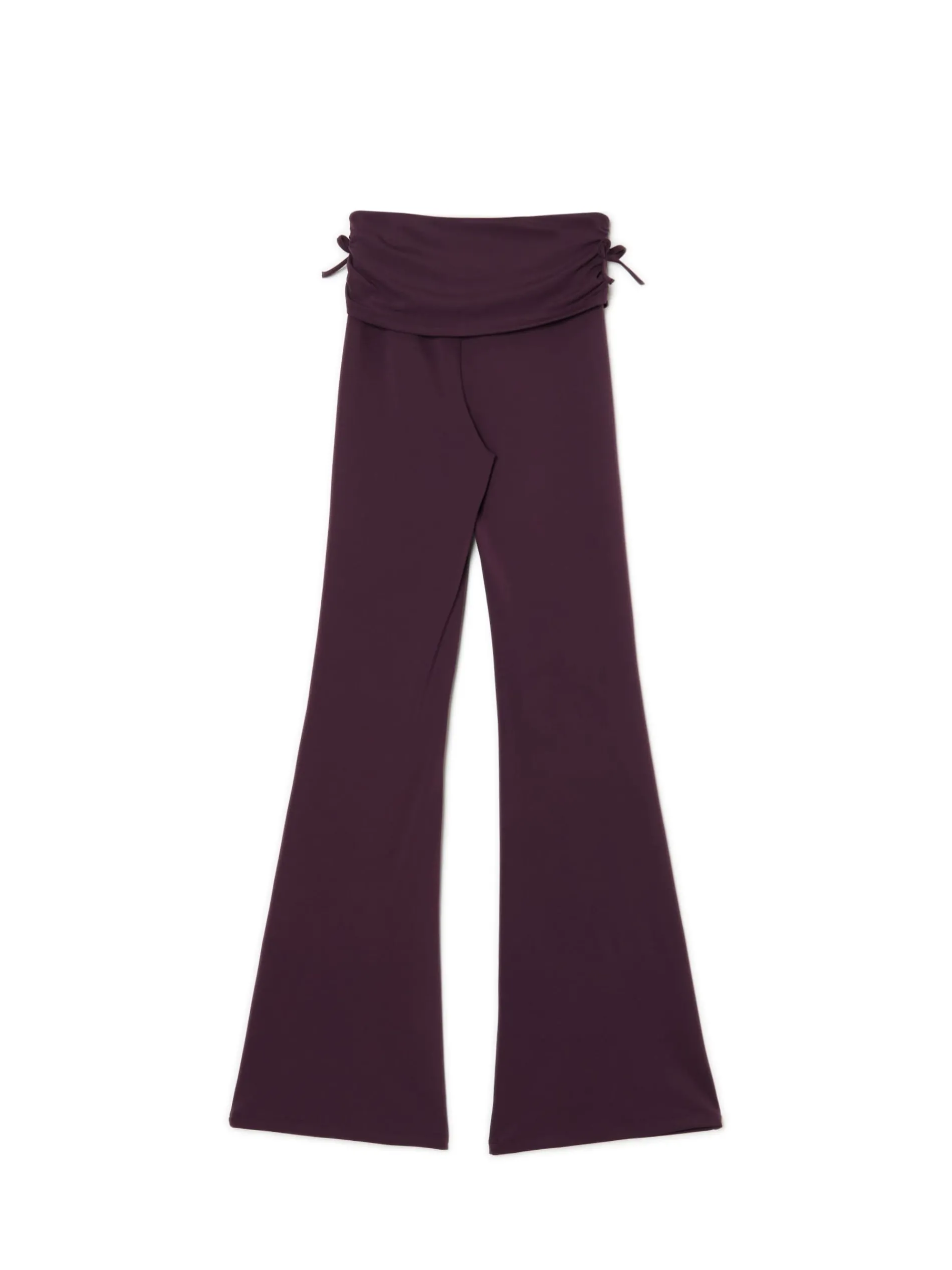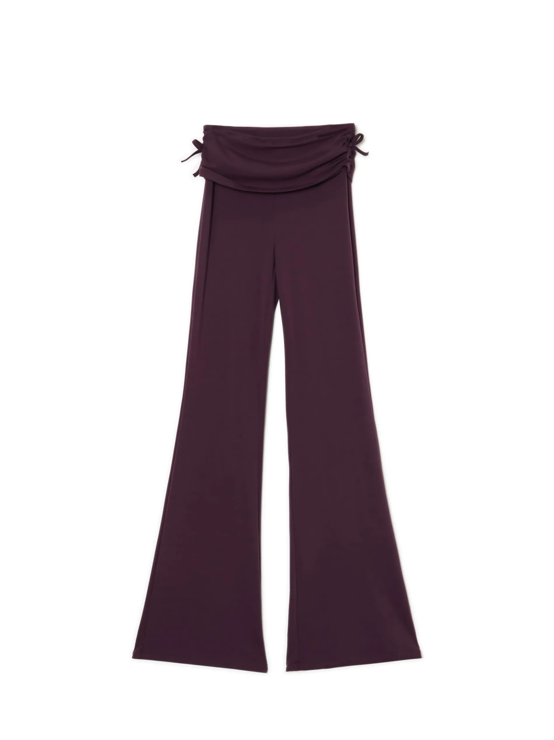 Damskie spodnie dresowe z rozszerzanymi nogawkami ku dołowi i oryginalną zakładką w talii. Po bokach dekoracyjne wiązania, a na przodzie marszczenia dopasowujące materiał do sylwetki. Idealne na spacer z psem, siłownię czy chillout na kanapie. dzianinowe spodnie o kroju flare wysoki stan rozszerzane ku dołowi nogawki ozdobne marszczenia i wiązanie po bokach Wzrost modelki: 177 cm