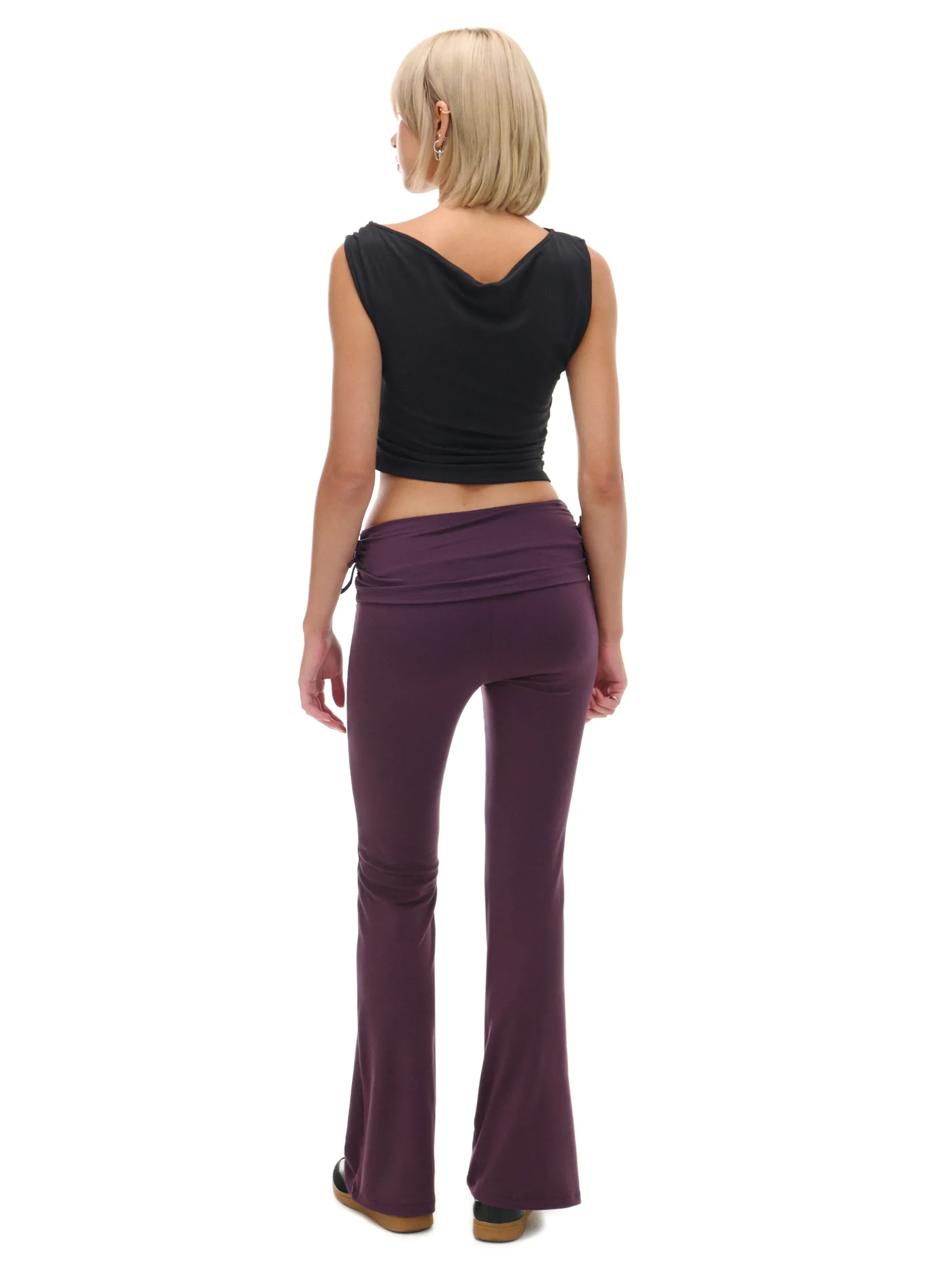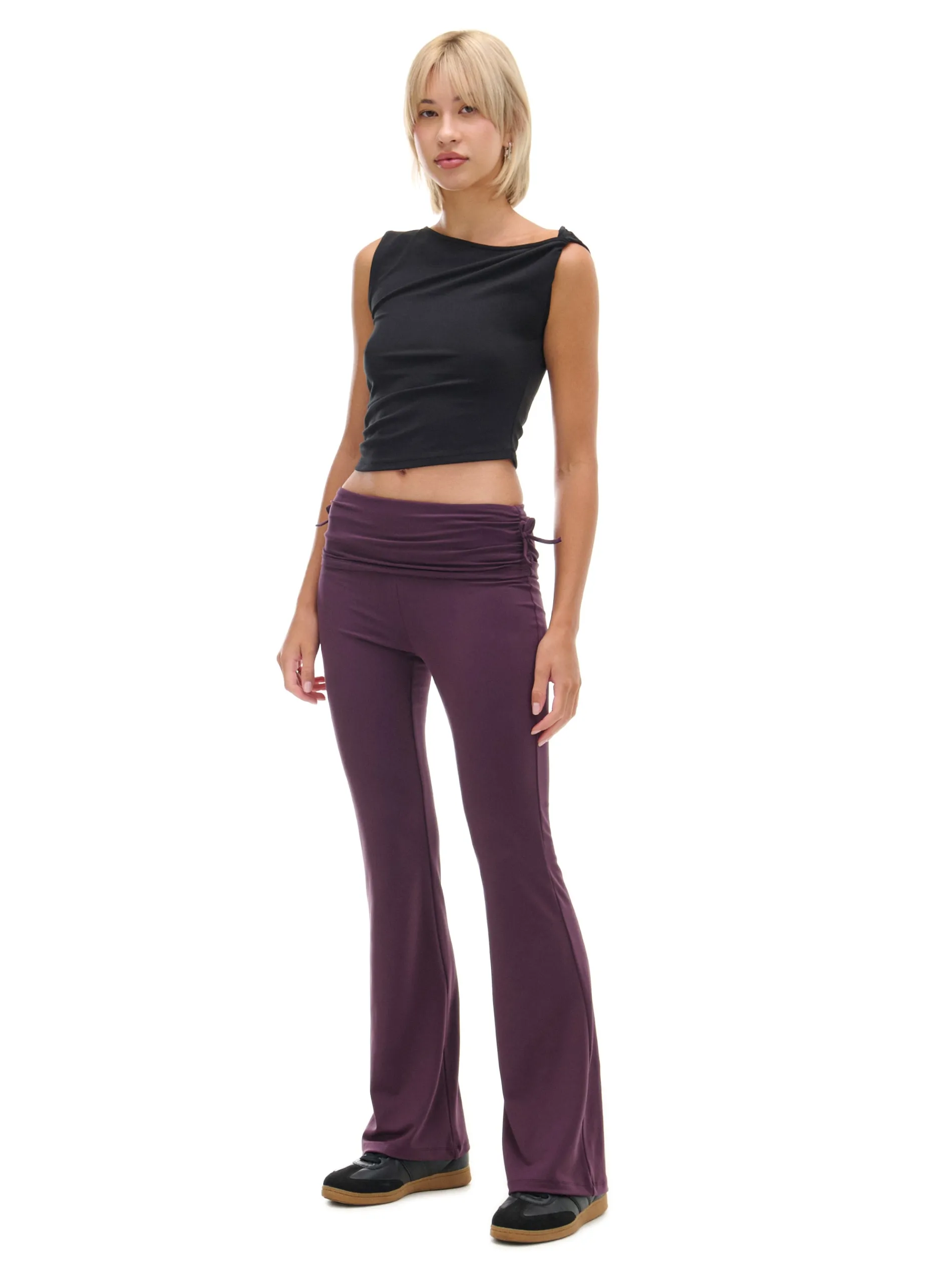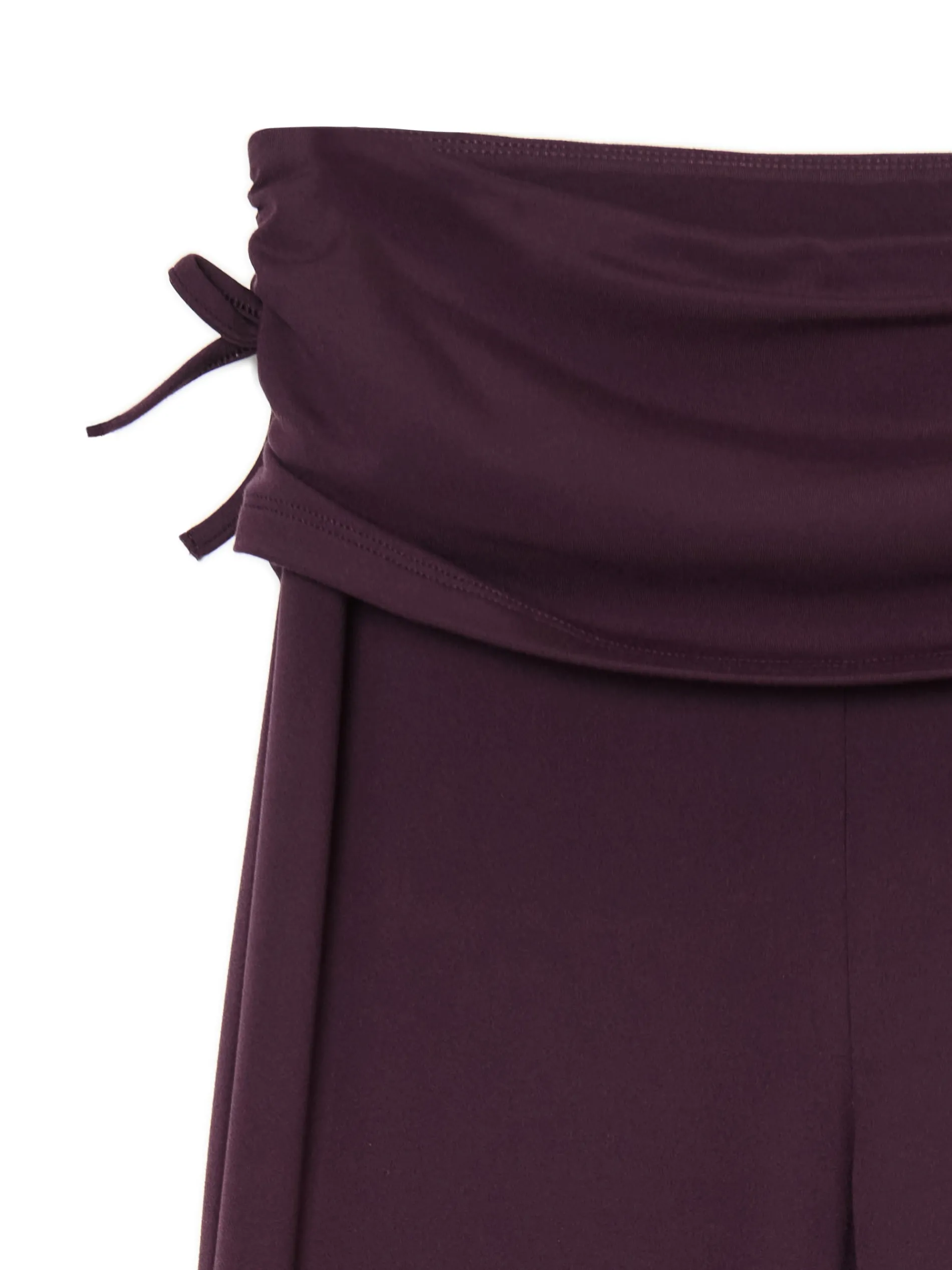 Damskie spodnie dresowe z rozszerzanymi nogawkami ku dołowi i oryginalną zakładką w talii. Po bokach dekoracyjne wiązania, a na przodzie marszczenia dopasowujące materiał do sylwetki. Idealne na spacer z psem, siłownię czy chillout na kanapie. dzianinowe spodnie o kroju flare wysoki stan rozszerzane ku dołowi nogawki ozdobne marszczenia i wiązanie po bokach Wzrost modelki: 177 cm