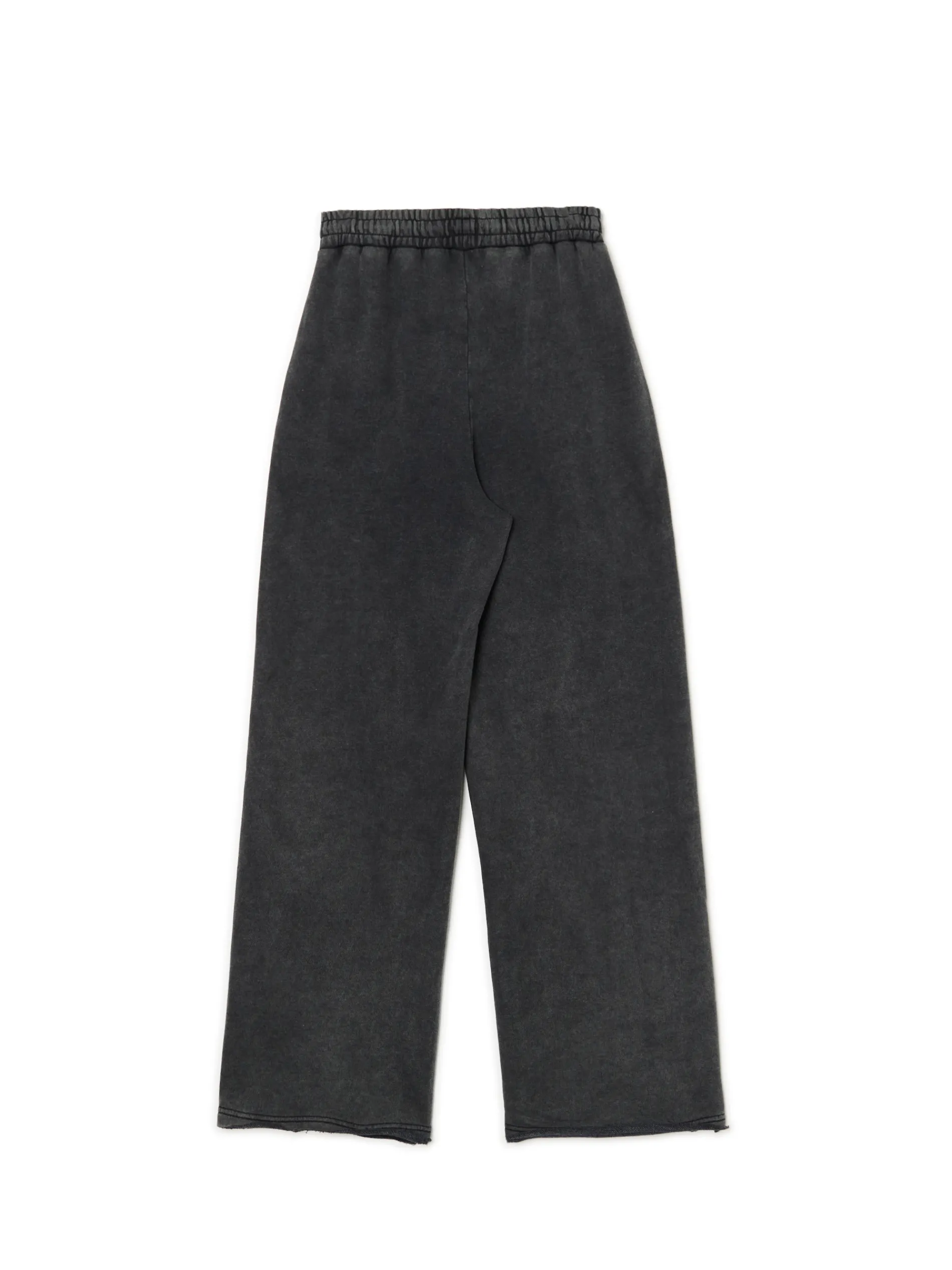 Damskie spodnie z wygodnymi, szerokimi nogawkami uszyte z dzianiny o dużej zawartości miękkiej bawełny french terry. Model dostępny w innym kolorze. dzianinowy materiał z bawełną spodnie o kroju wide leg elastyczna gumka w pasie dwie kieszenie po bokach szeroka nogawka wykończona postrzępieniem efekt sprania na całości