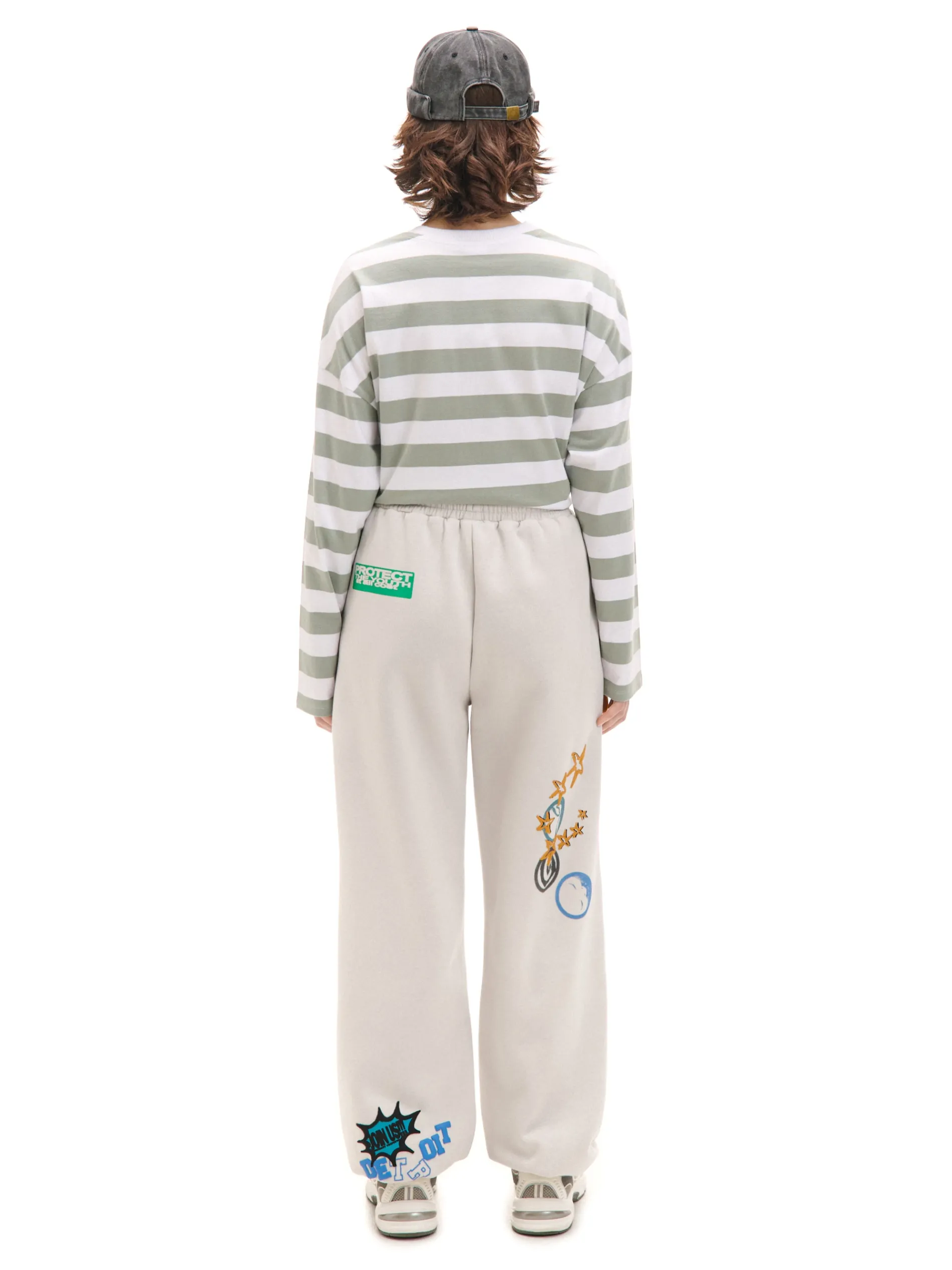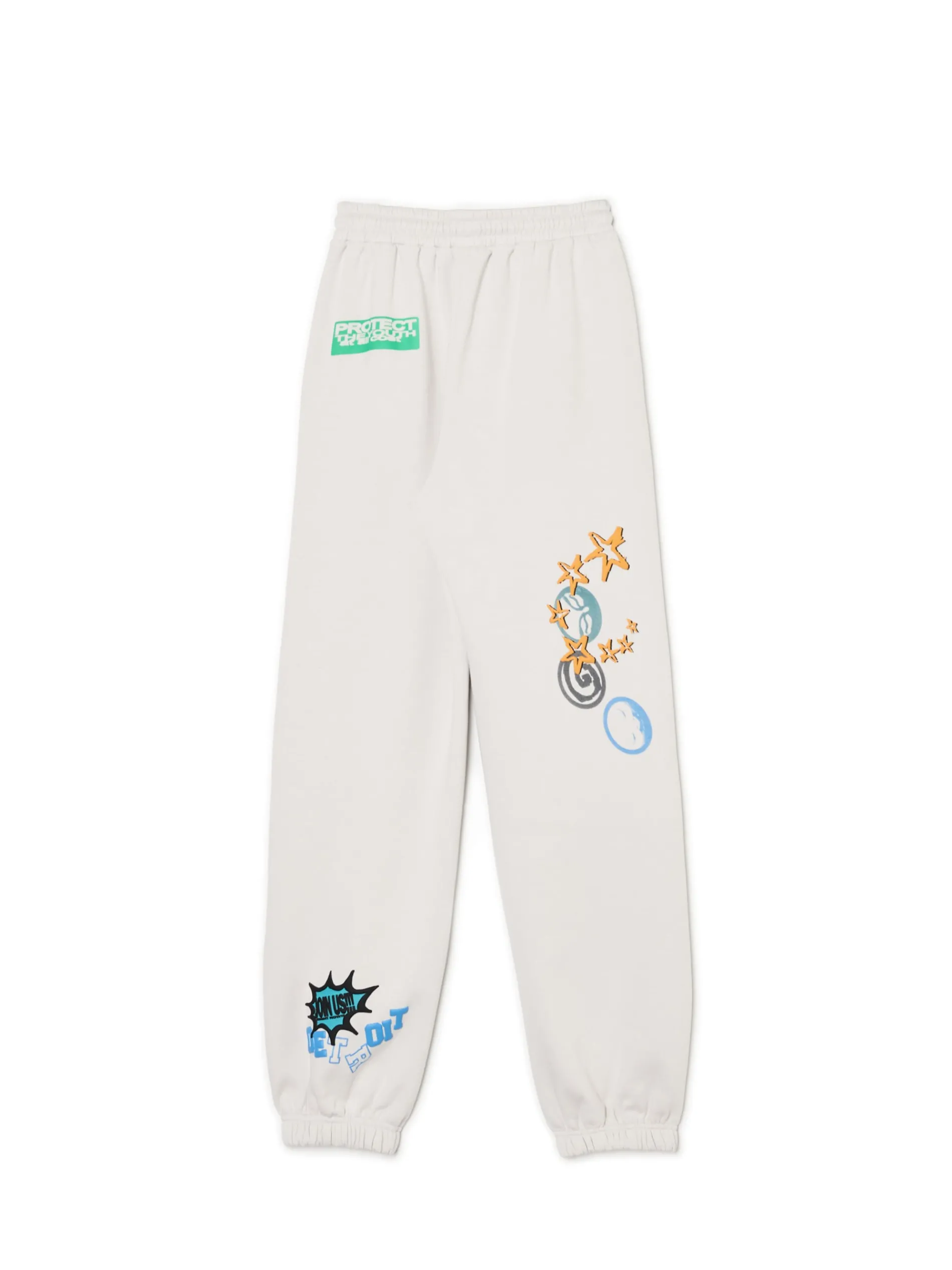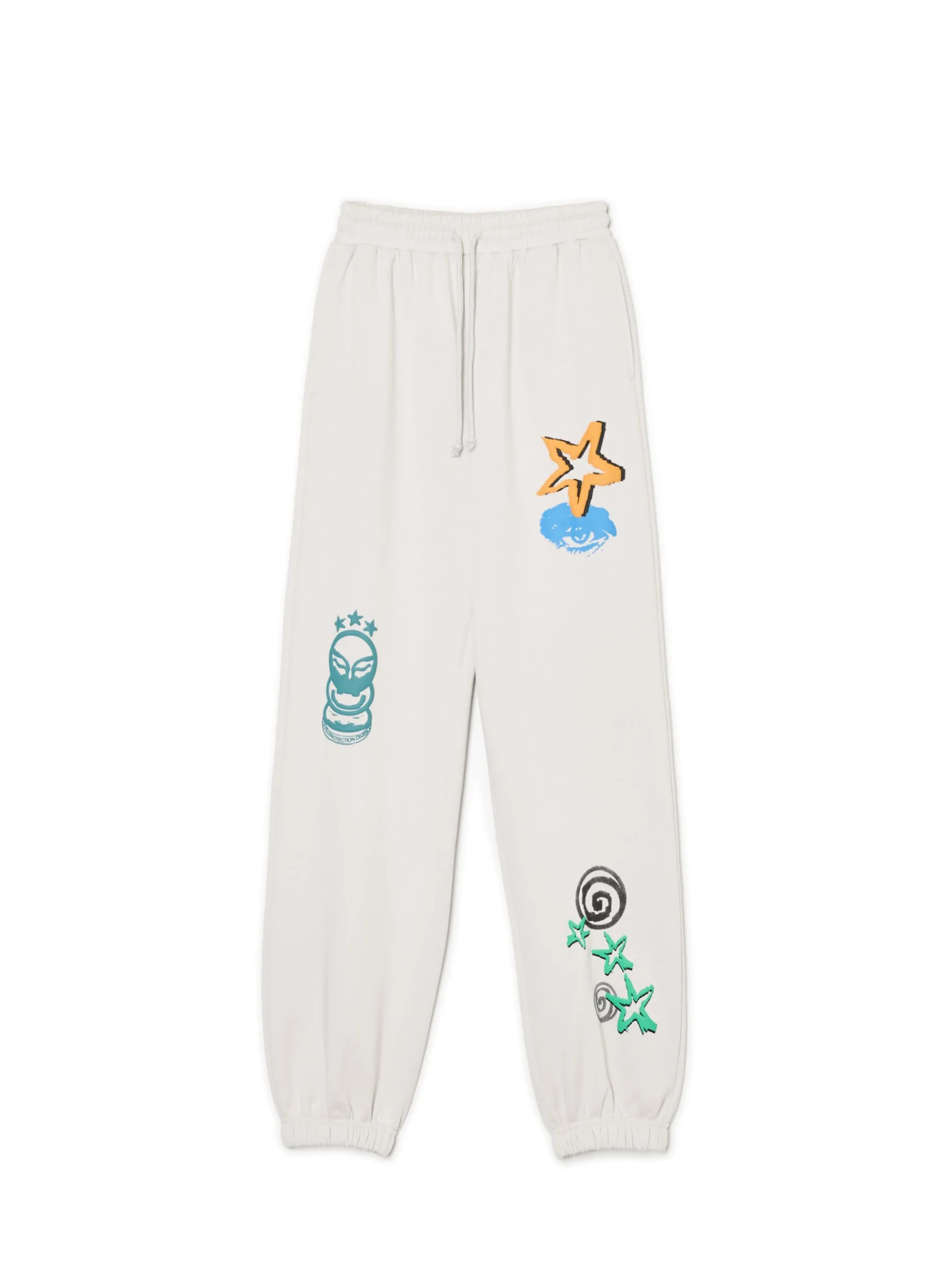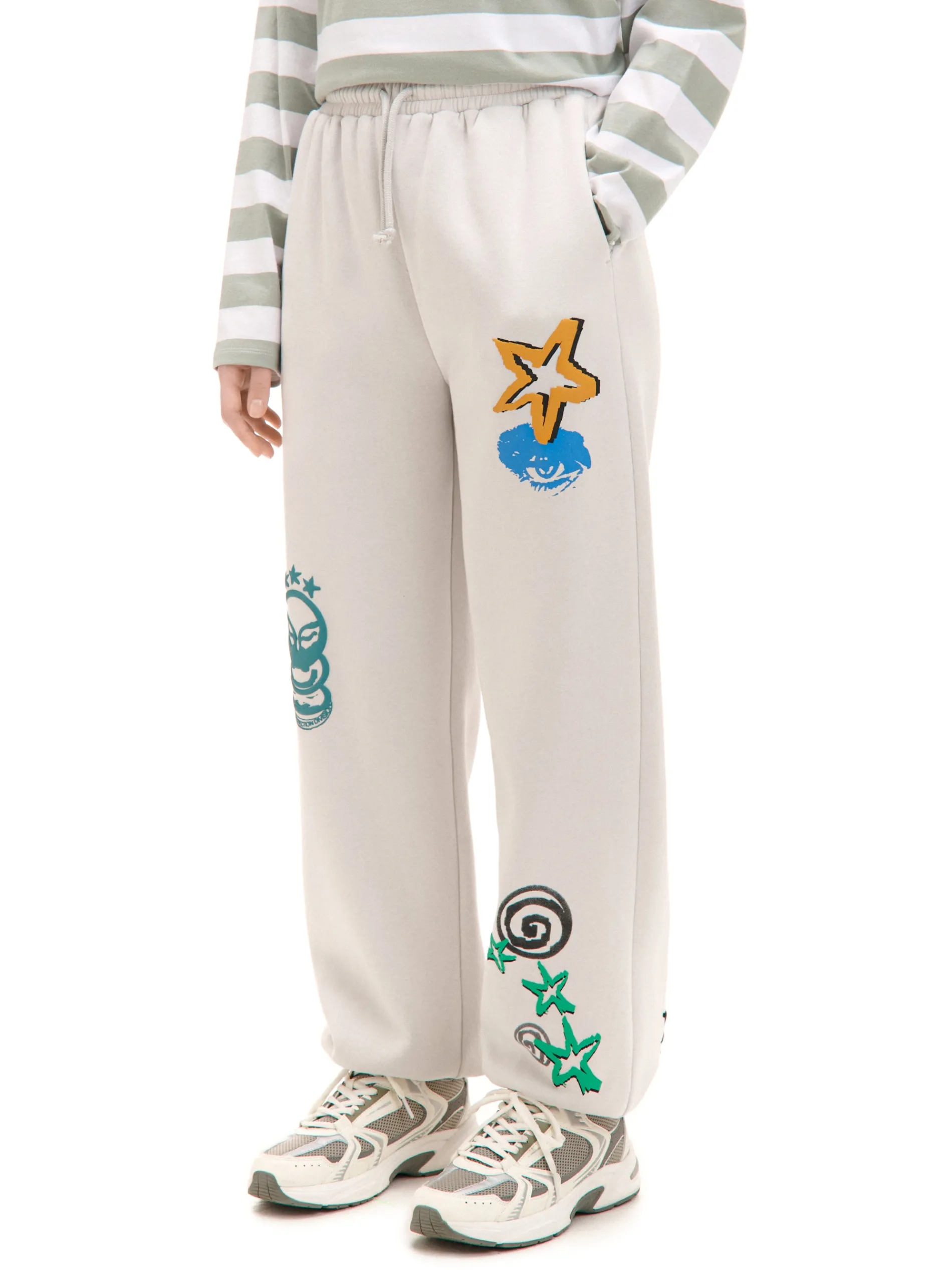 Dresowe damskie spodnie o regularnym kroju uszyte z mieszanki dzianin w jasnoszarym kolorze. Na całej powierzchni kolorowe nadruki o nieregularnym ułożeniu w artystycznym stylu. dresowe joggery uszyte z dzianiny z bawełną regularny krój gumka w pasie ze sznurkiem do regulacji długie nogawki wykończone ściągaczem dwie kieszenie boczne nadruki all over Produkt tworzy zestaw z modelem 941AR-09X .