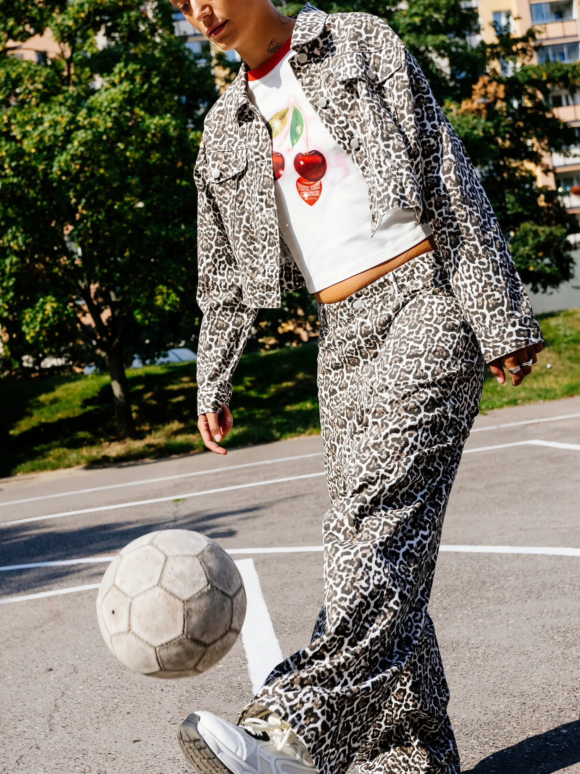 Spodnie damskie o kroju baggy, uszyte z mocnej, bawełnianej tkaniny typu twill. Nadruk z modnym, zwierzęcym motywem na całej powierzchni materiału wyróżni Cię w tłumie. 100% bawełny obszerny krój baggy zapięcie na zamek i guzik dwie kieszenie po bokach dodatkowa mała kieszonka w środku naszywane kieszenie z tyłu hammer loop na obu nogawkach zwierzęcy wzór Wzrost modelki: 177 cm