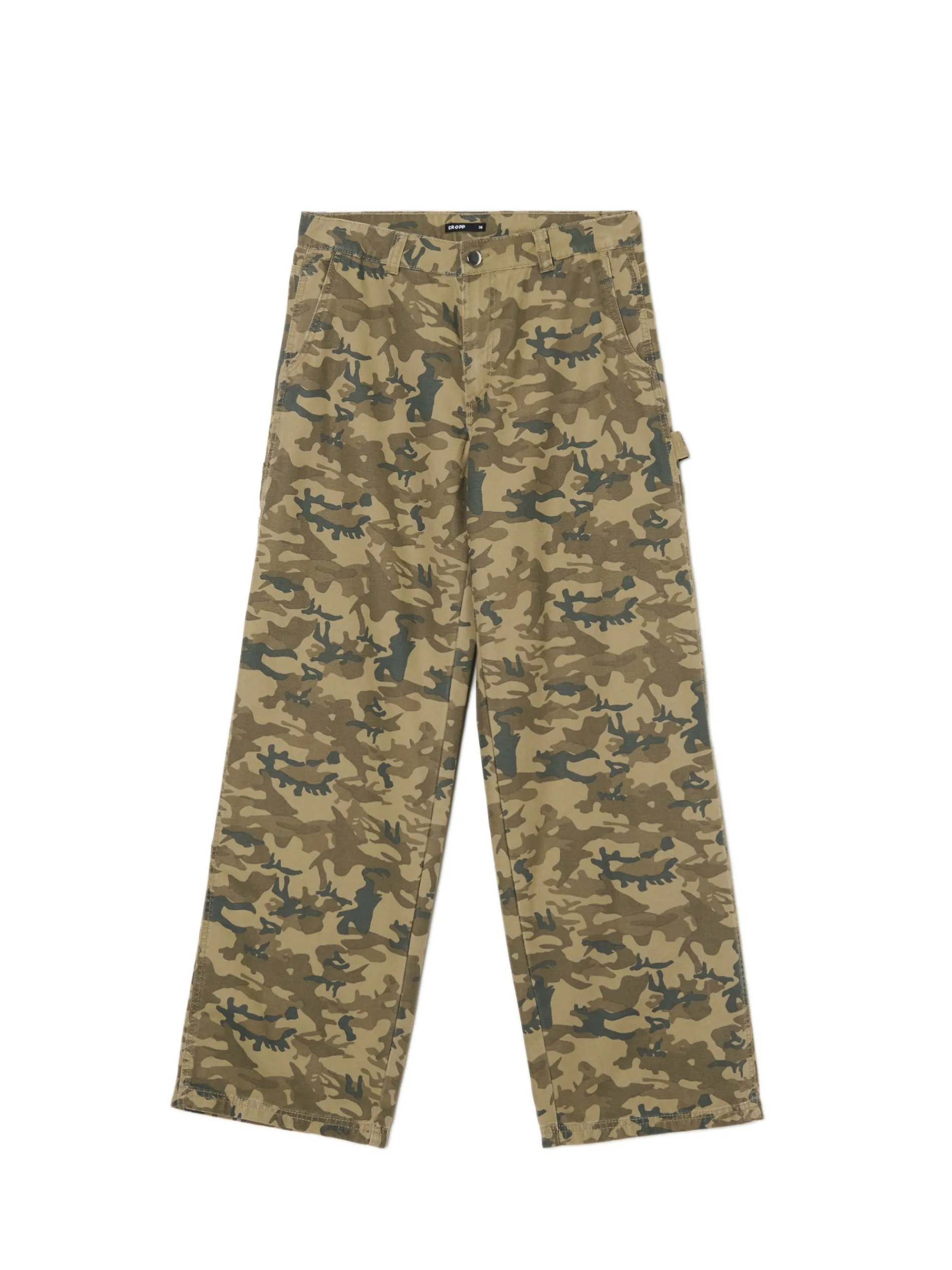 Damskie spodnie uszyte z grubego bawełnianego canvasu ze wzorem w moro. Solidny, wygodny i stylowy item do zadań specjalnych. 100% bawełny niski stan zapięcie na zamek i guzik długie, proste nogawki dwie skośne kieszenie z przodu dwie naszyte kieszenie tylnie dodatkowe kieszenie carpenter hammer loop na lewej nogawce szlufki na pasek wzór moro all over