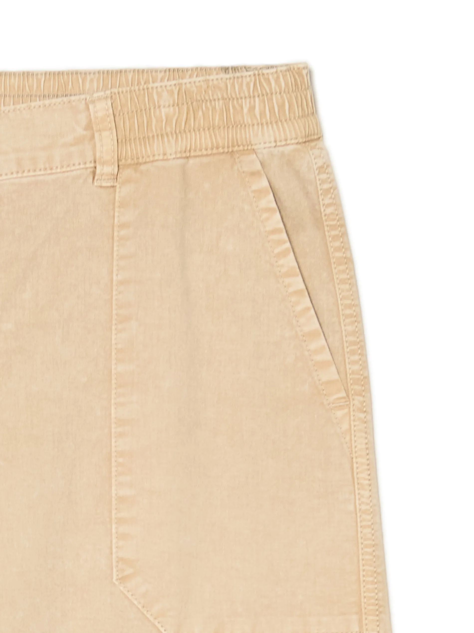 Kremowe damskie spodnie, uszyte w 100% z bawełnianej tkaniny. regularny stan zapięcie na zatrzask i zamek elastyczna gumka w pasie prosta nogawka imitacja kieszeni z tyłu 4 kieszenie, w tym kieszenie cargo szlufki na pasek