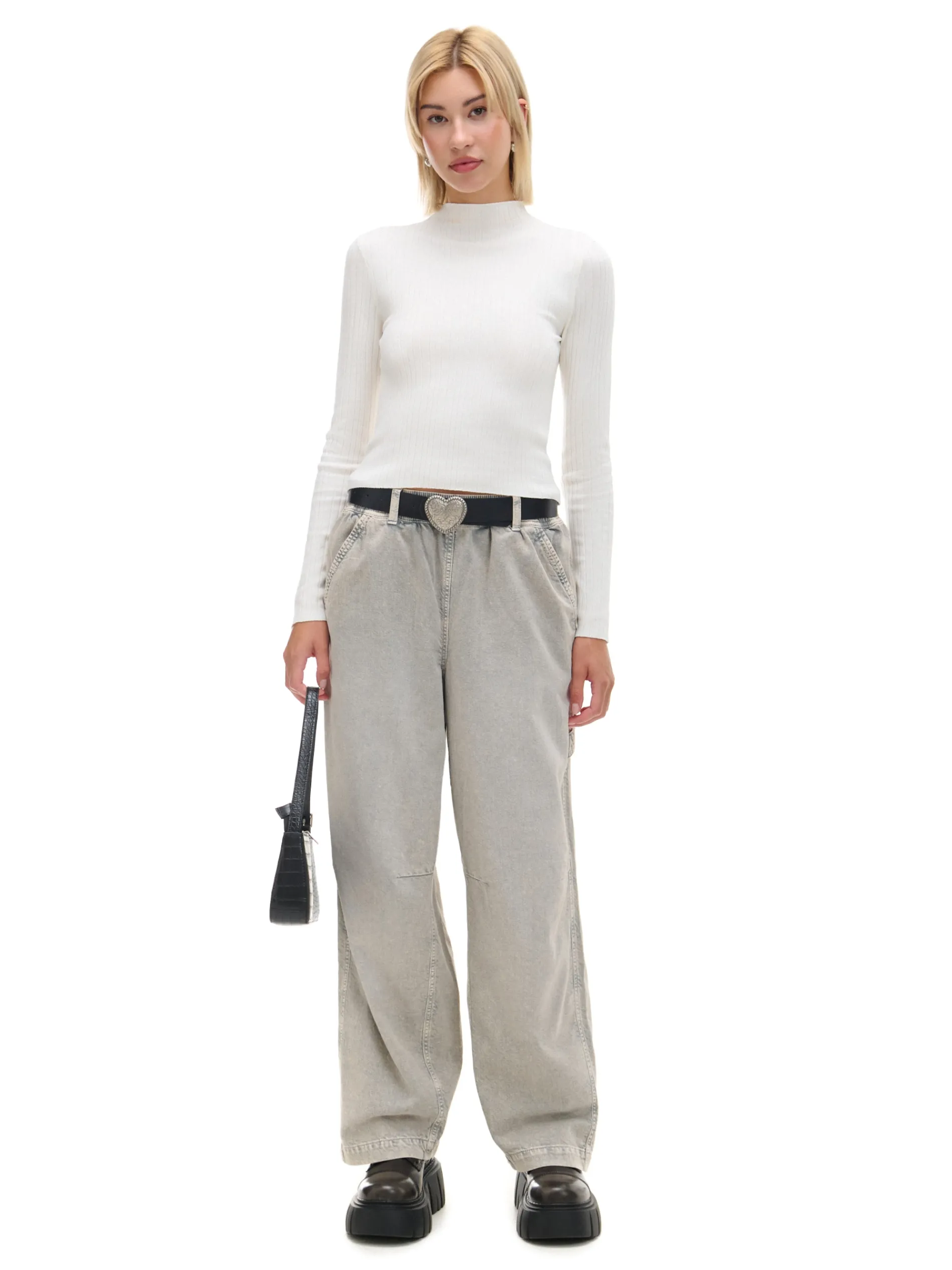 Damskie szare spodnie, uszyte z bawełnianego, wytrzymałego diagonalu. luźny krój baggy bardzo szeroka nogawka wysoki stan, w pasie elastyczna gumka cztery kieszenie ukośne przeszycia na wysokości kolan pasek typu carpenter delikatny efekt sprania materiału Wzrost modelki: 177 cm