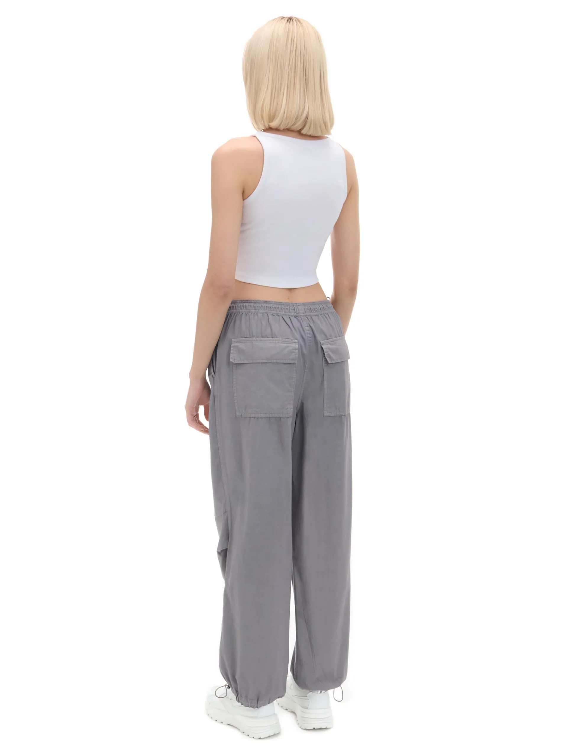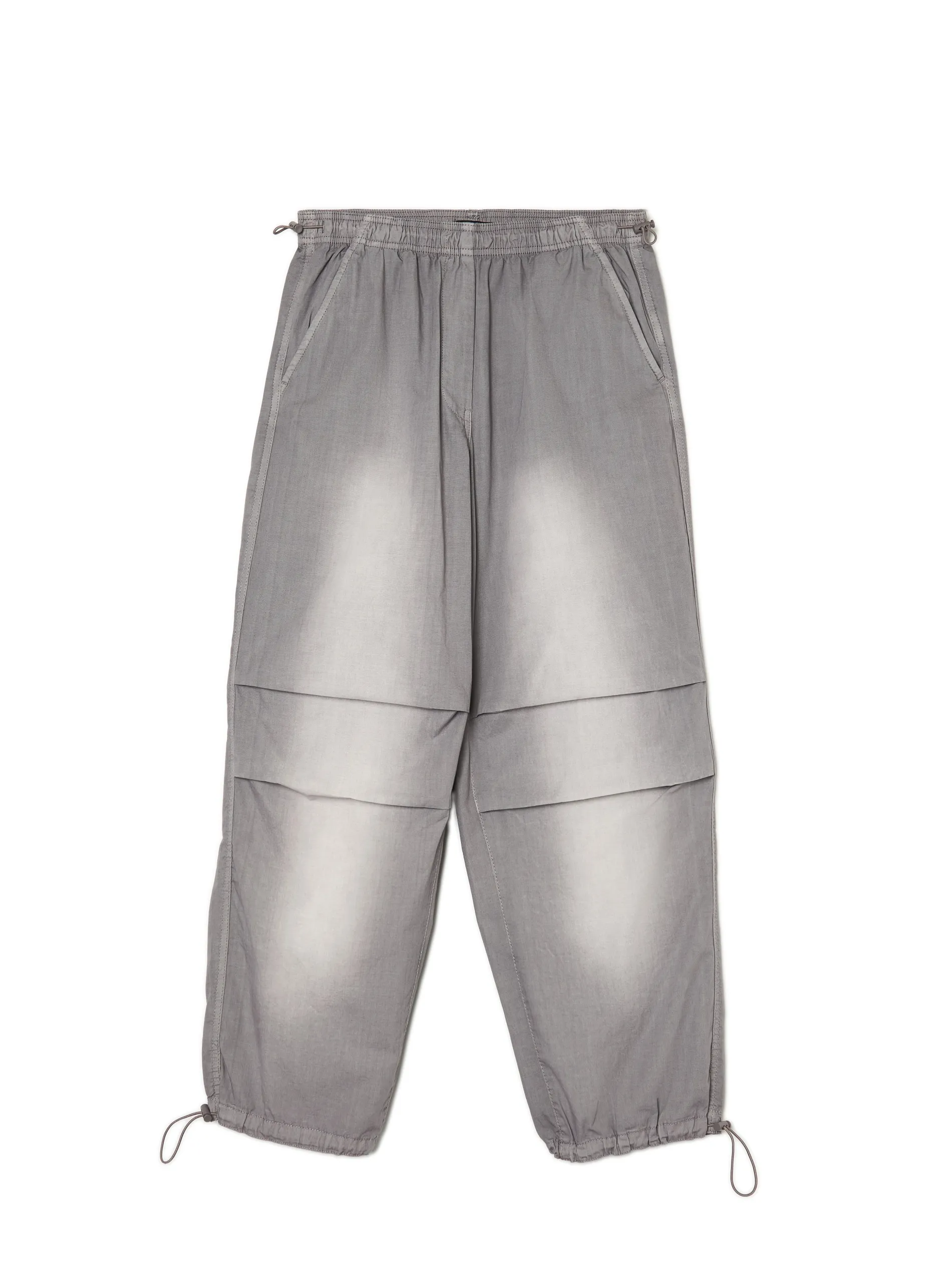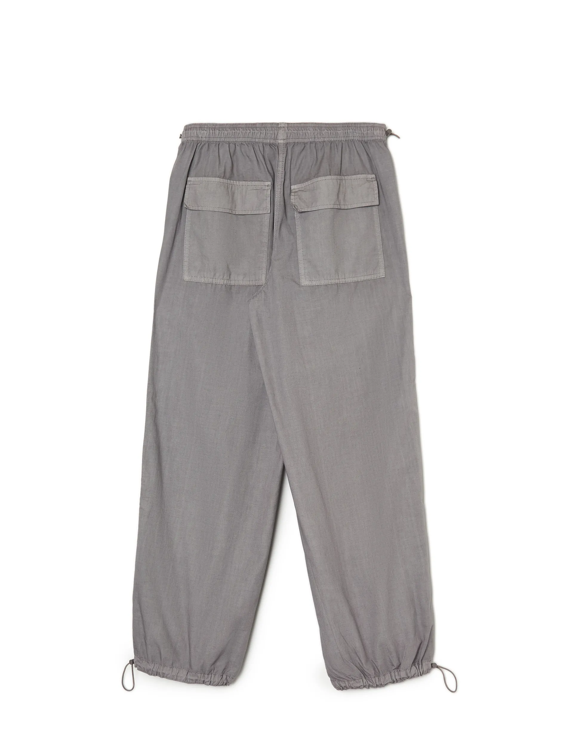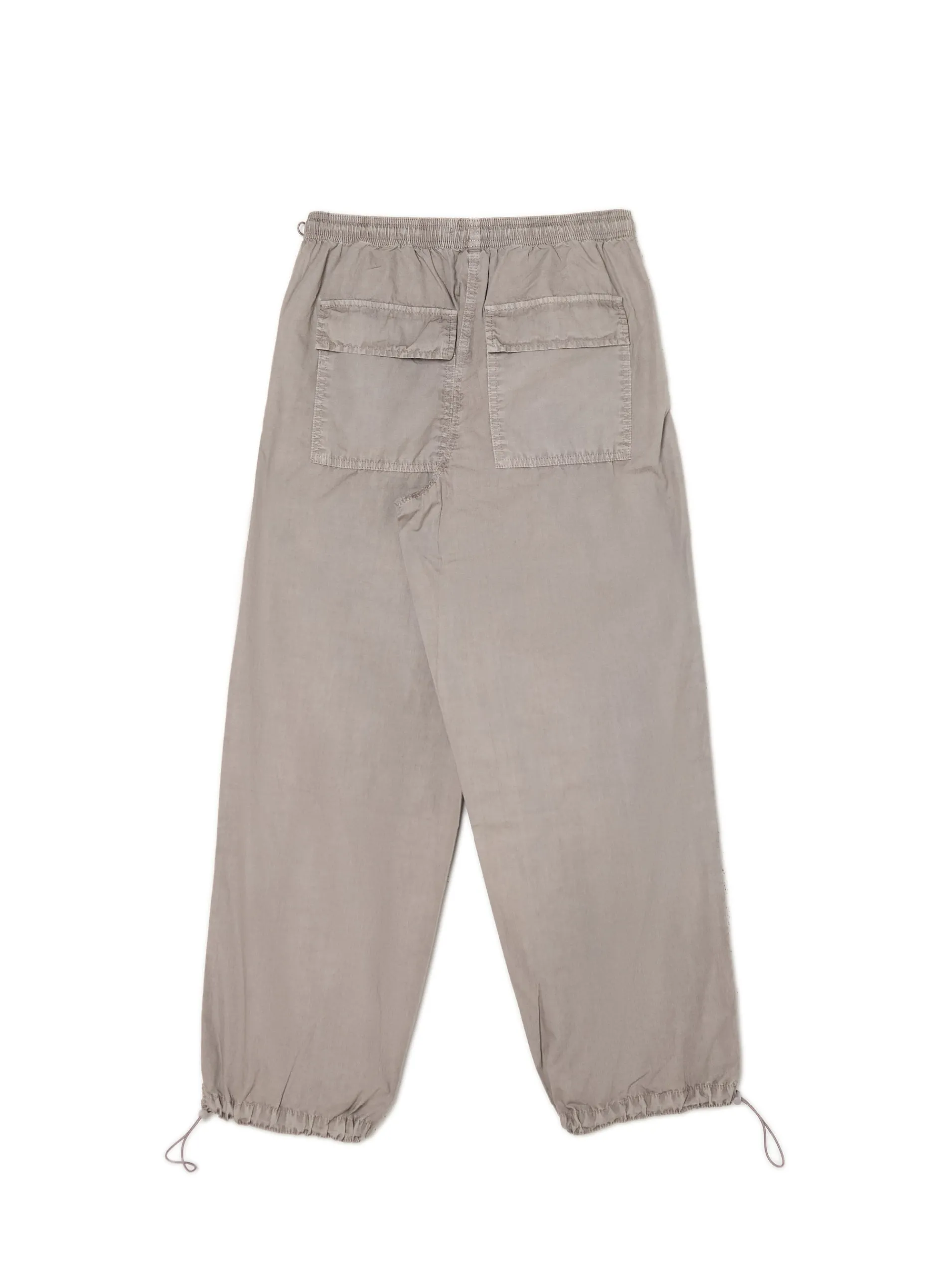 Spodnie damskie w stylu parachute, nazywane też spadochronowymi. Uszyte z bawełnianej tkaniny. luźny fason w pasie elastyczna gumka ze stoperami do regulacji 4 kieszenie swobodne nogawki z regulacją u dołu dostępne inne warianty kolorystyczne Wzrost modelki: 177 cm